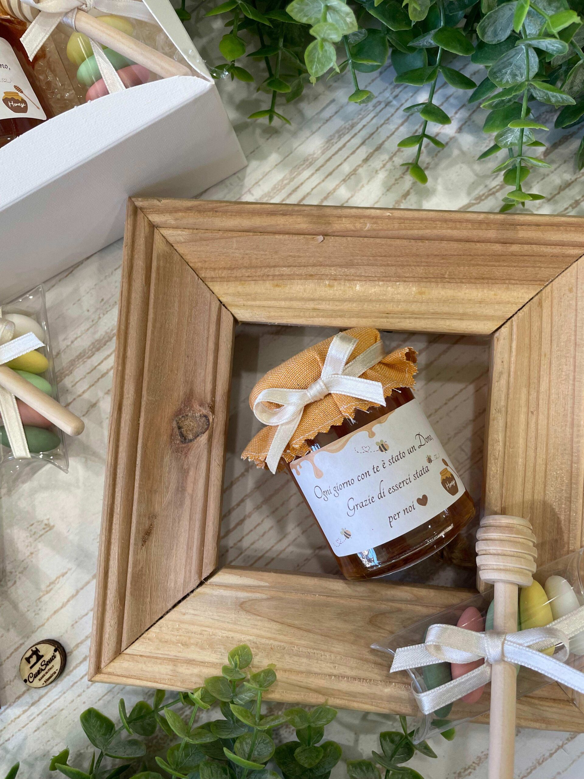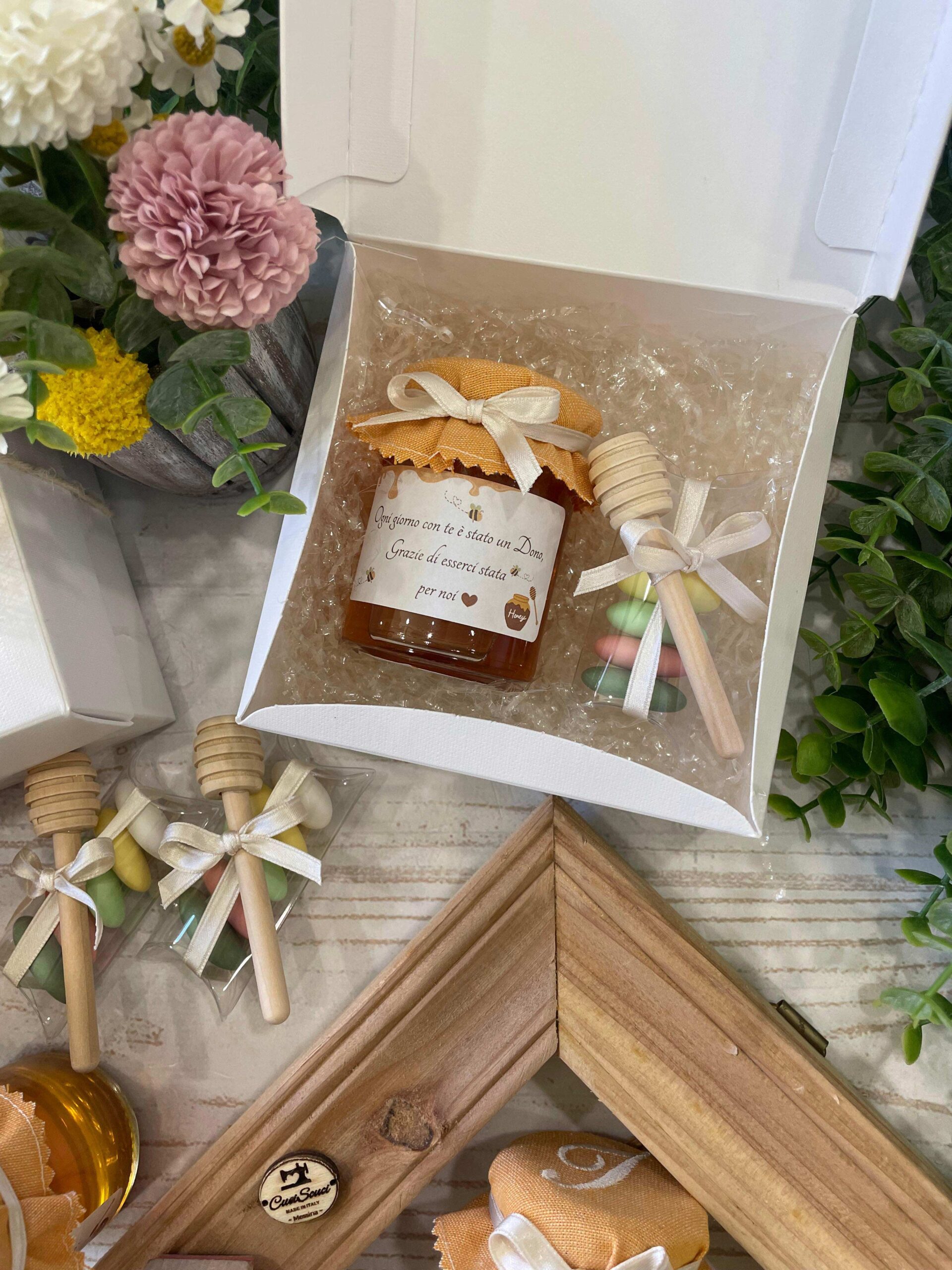 barattolo di miele con copri barattolo senape ricamato, etichetta personalizzata, mini sacchetto sartoriale o scatolina trasparente in PVC con 5 confetti a scelta, cucchiaio spargi miele, scatola e nastri, così come in foto.