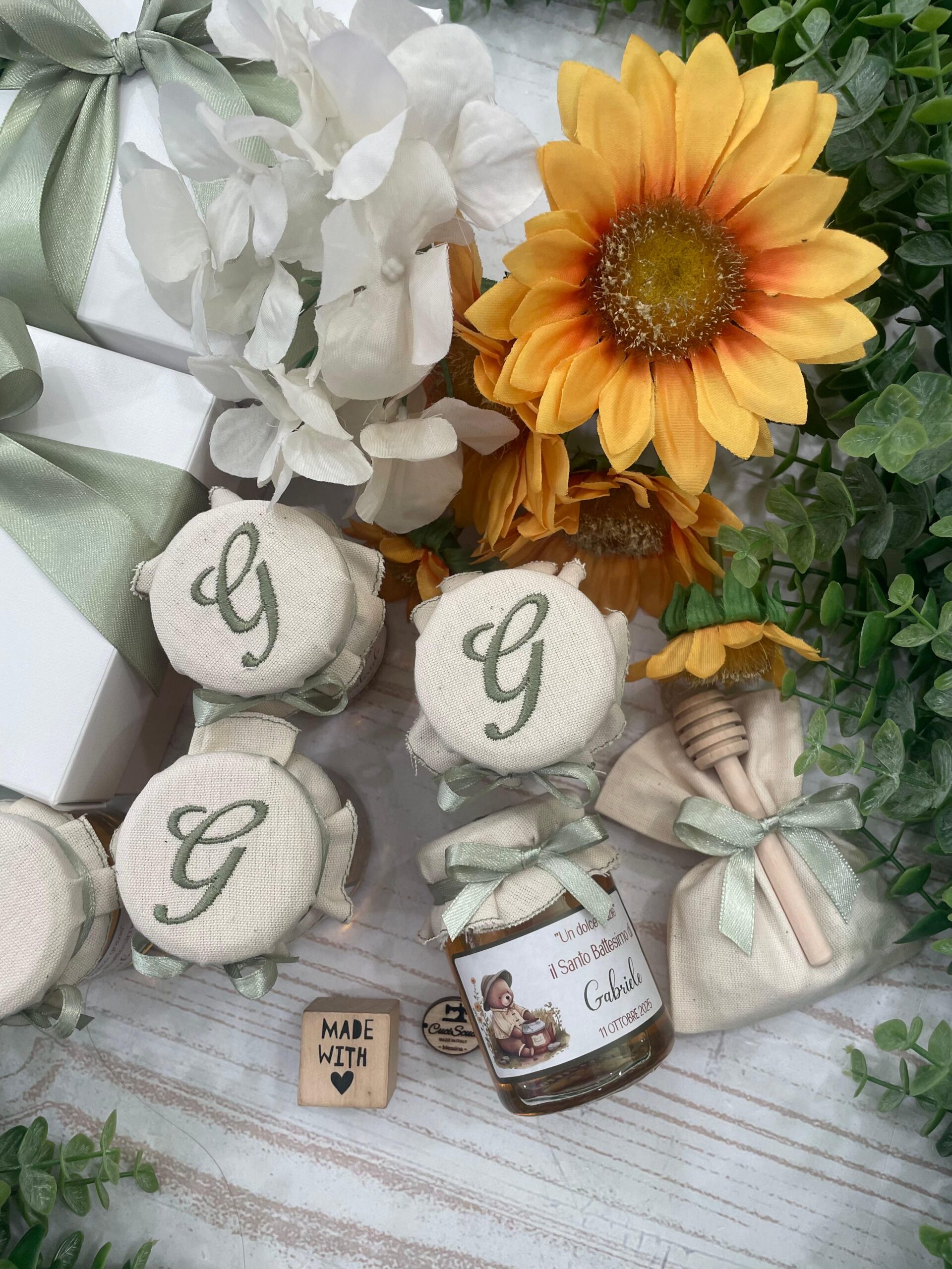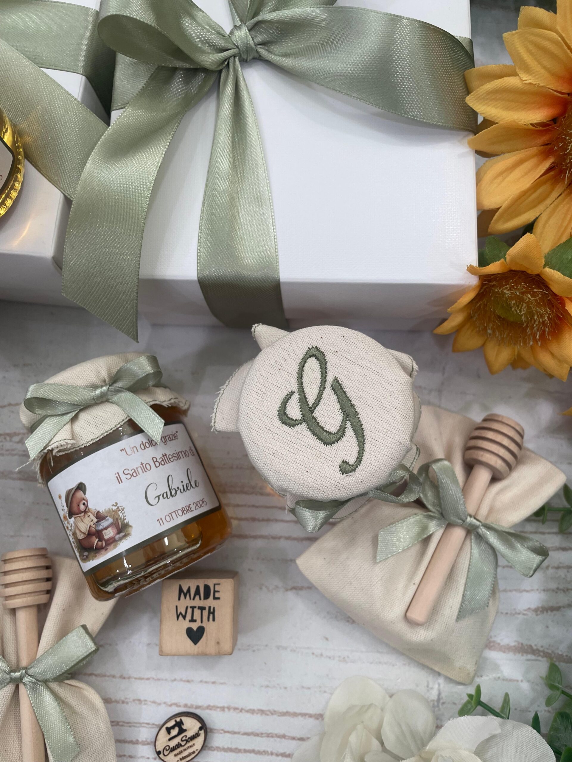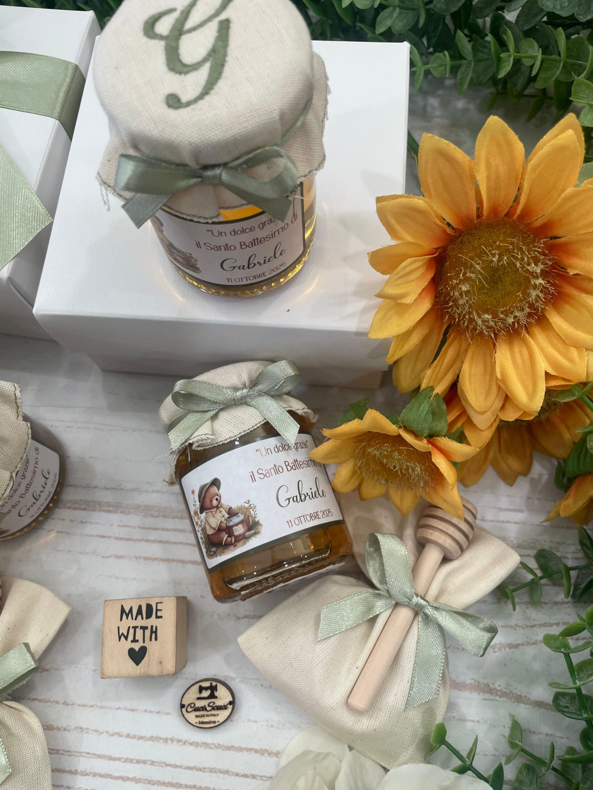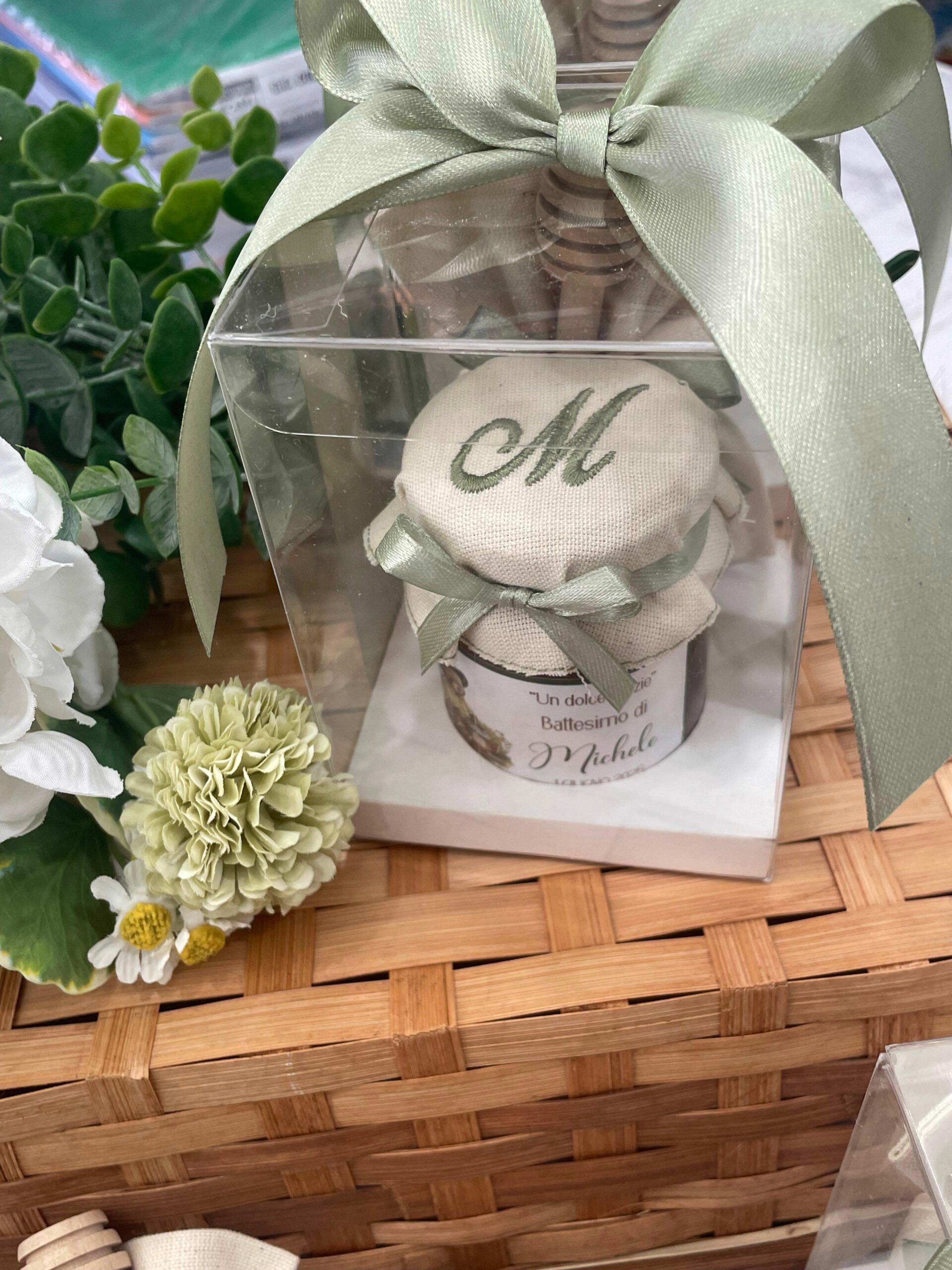 barattolo di miele con copri barattolo ricamato, etichetta personalizzata, mini sacchetto sartoriale o scatolina trasparente in PVC con 5 confetti a scelta, cucchiaio spargi miele, scatola e nastri, così come in foto.