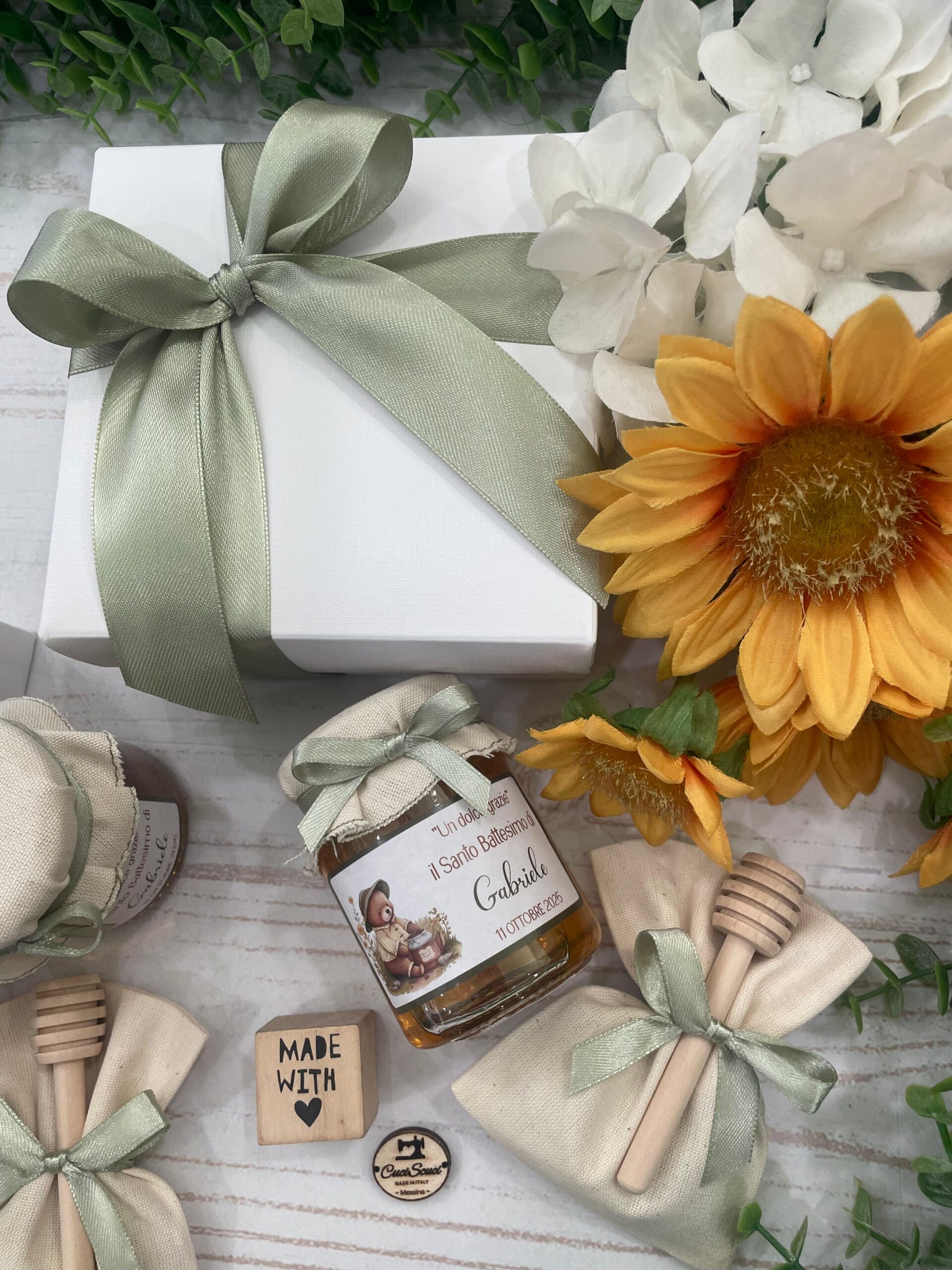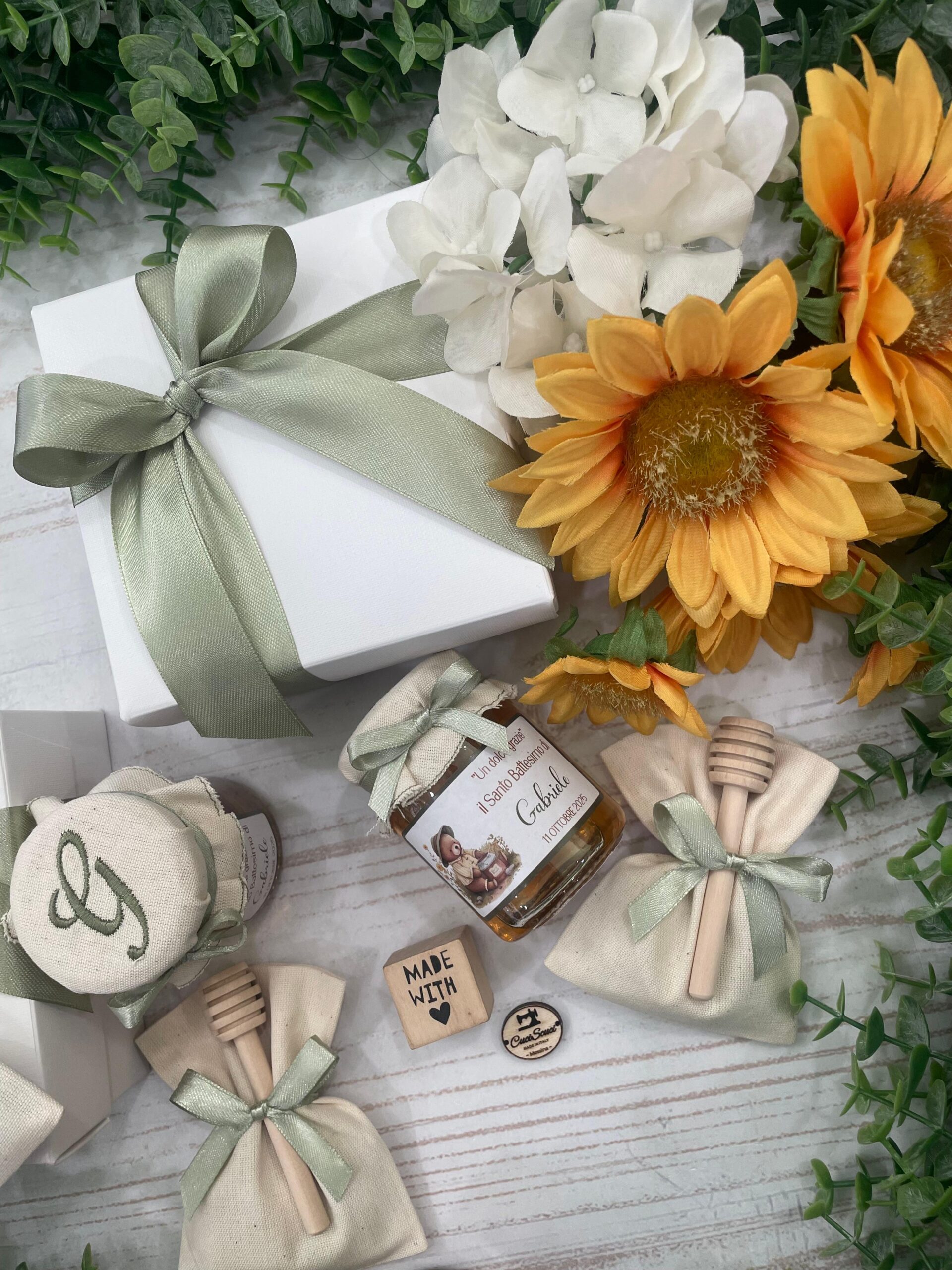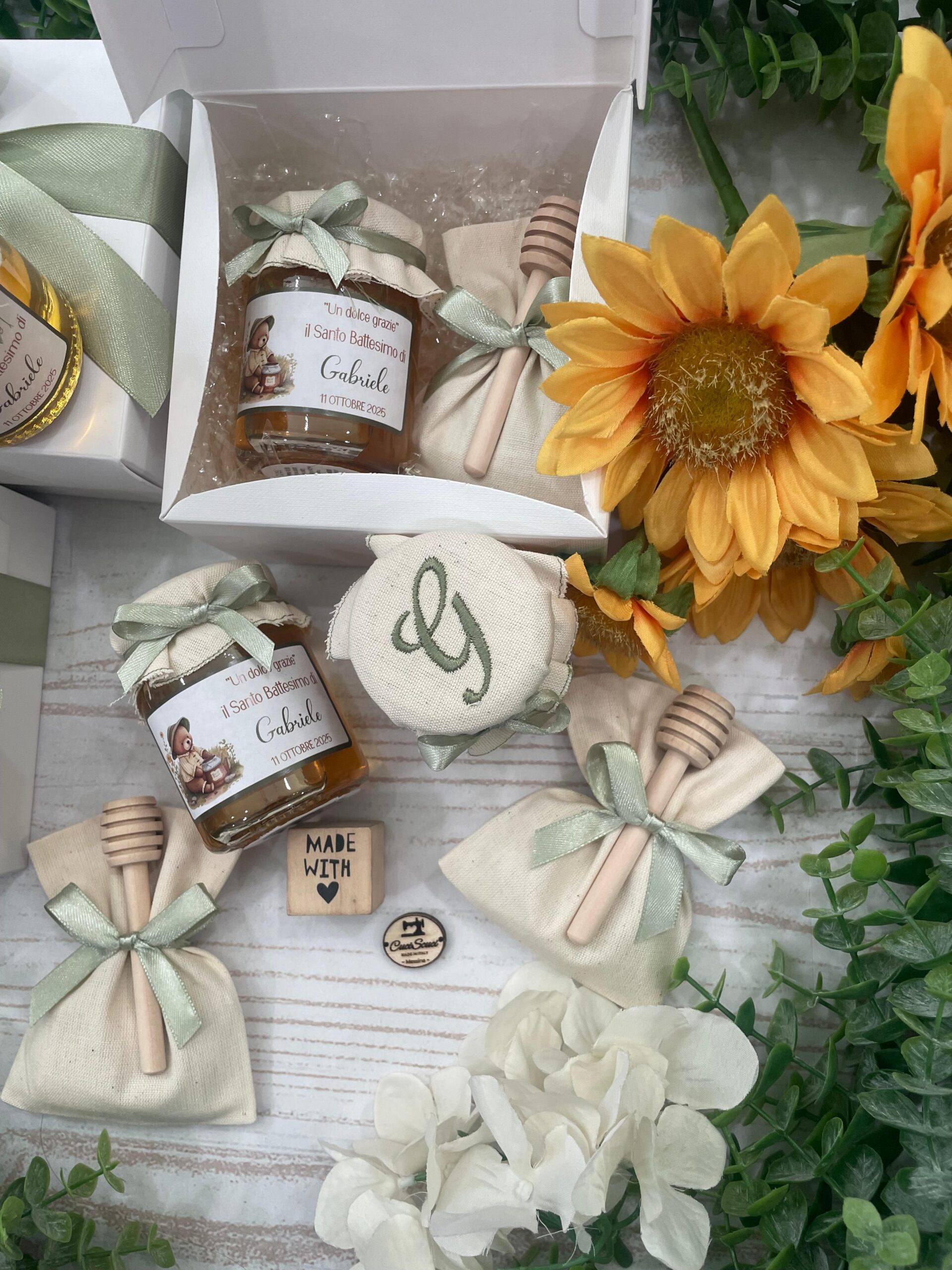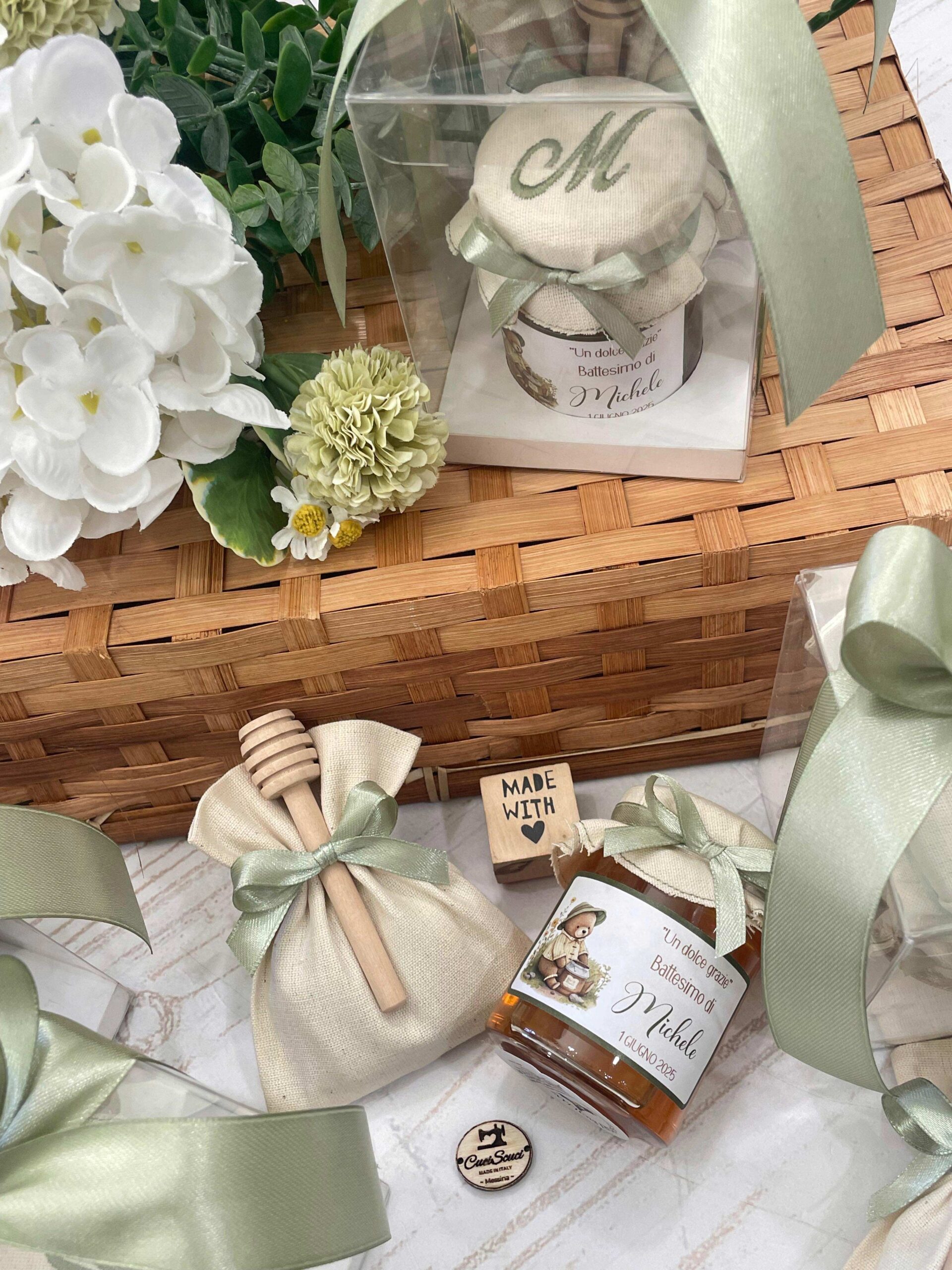 barattolo di miele con copri barattolo ricamato, etichetta personalizzata, mini sacchetto sartoriale o scatolina trasparente in PVC con 5 confetti a scelta, cucchiaio spargi miele, scatola e nastri, così come in foto.