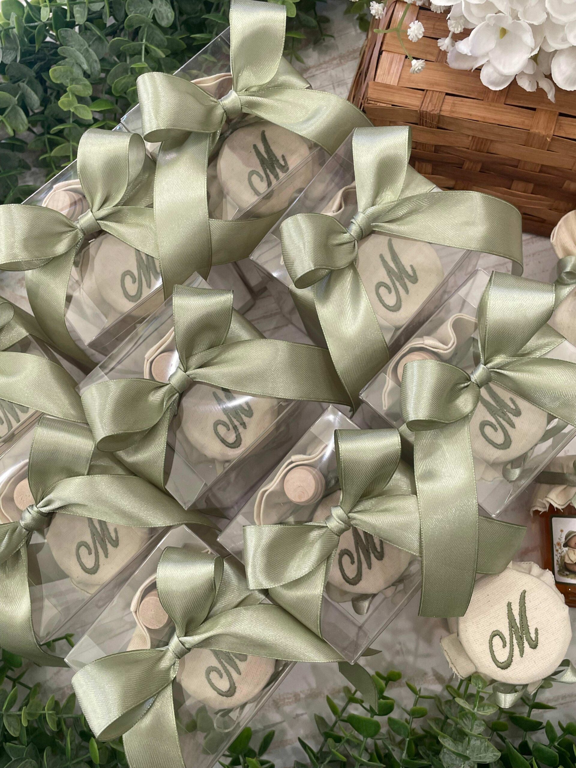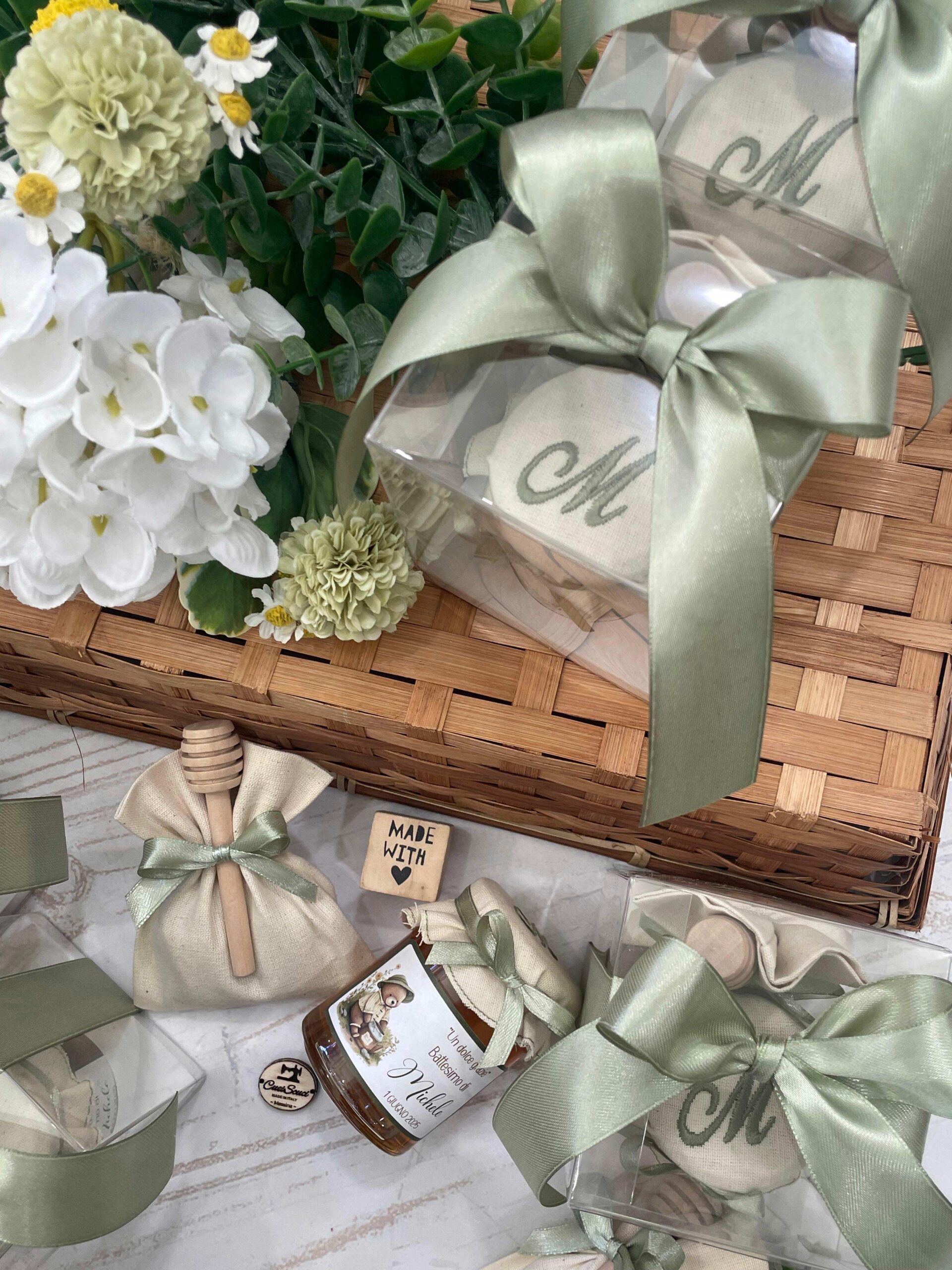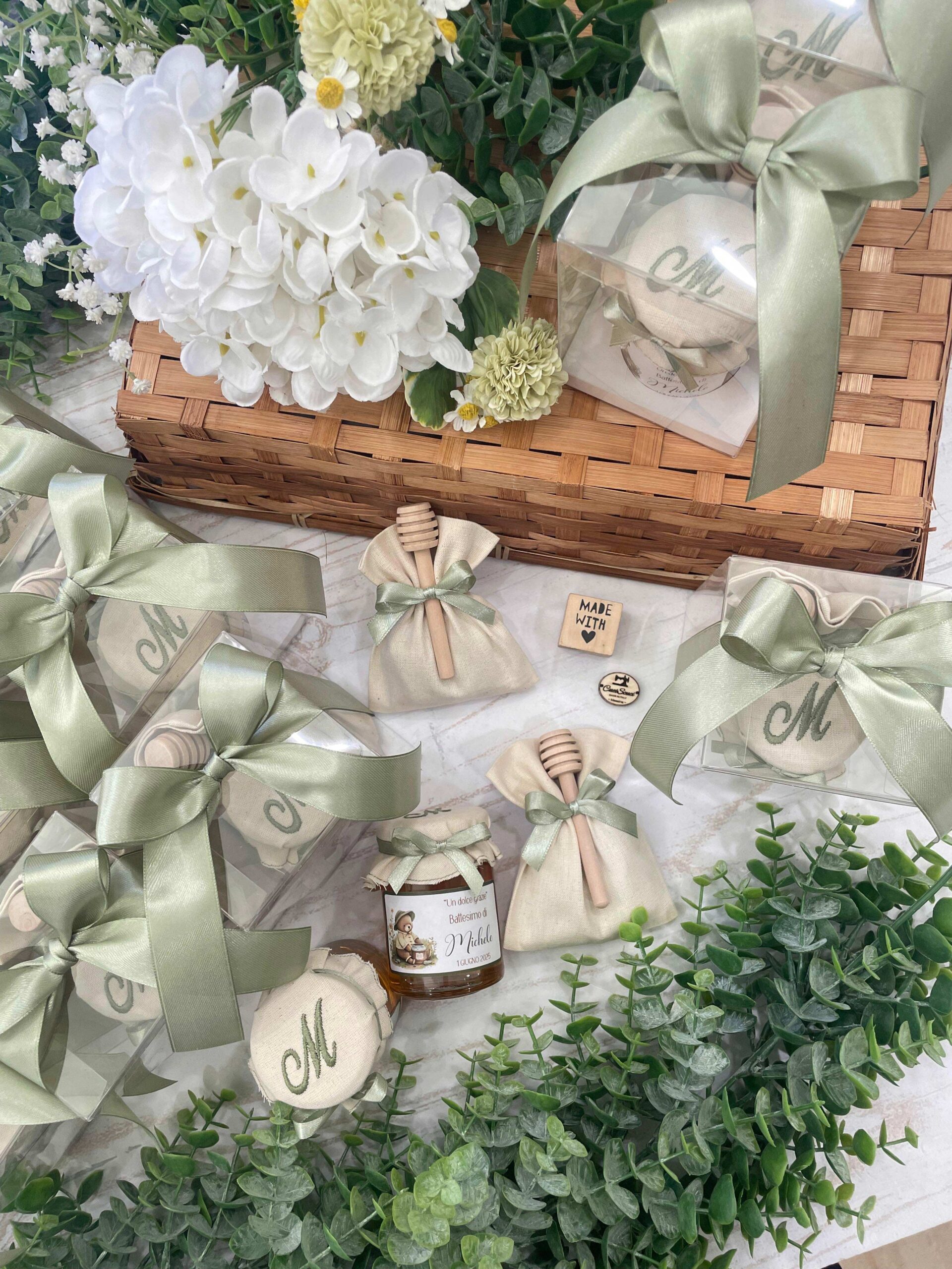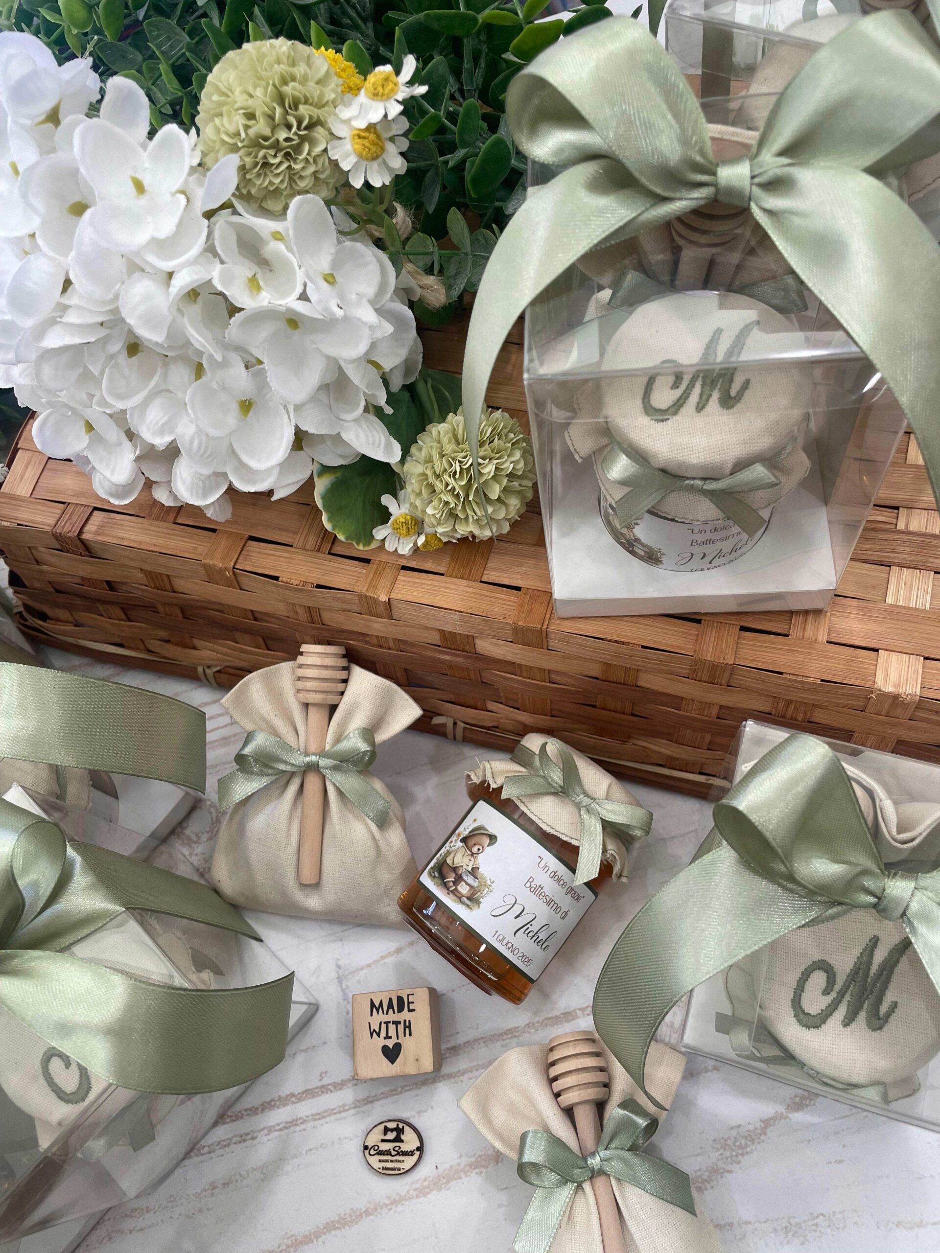 barattolo di miele con copri barattolo ricamato, etichetta personalizzata, mini sacchetto sartoriale o scatolina trasparente in PVC con 5 confetti a scelta, cucchiaio spargi miele, scatola e nastri, così come in foto.