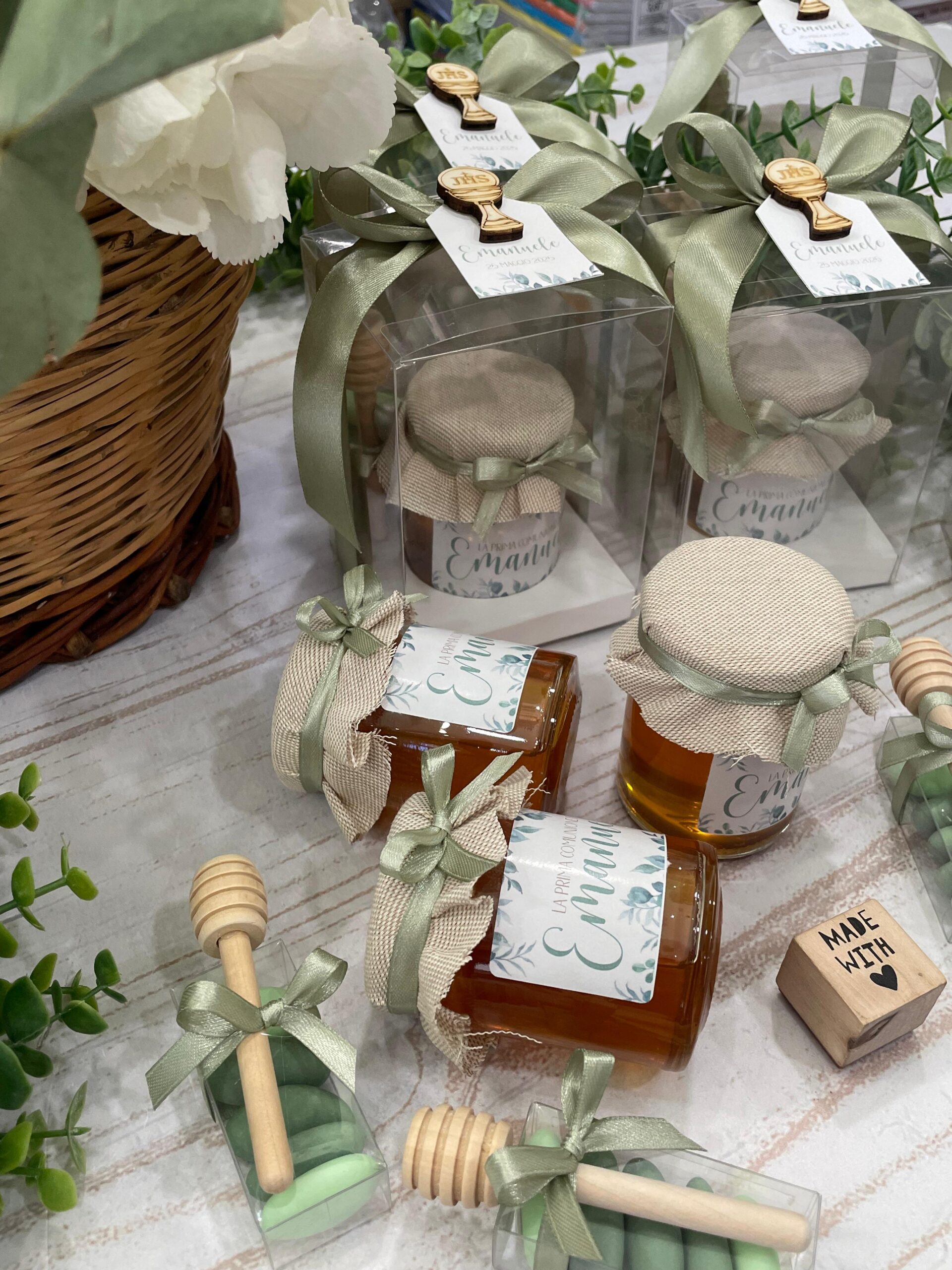 barattolo di miele, copri barattolo non ricamato, spargi miele, etichetta personalizzata, scatolina in pvc con 5 confetti colorati, scatola, applicazione e tag personalizzato
