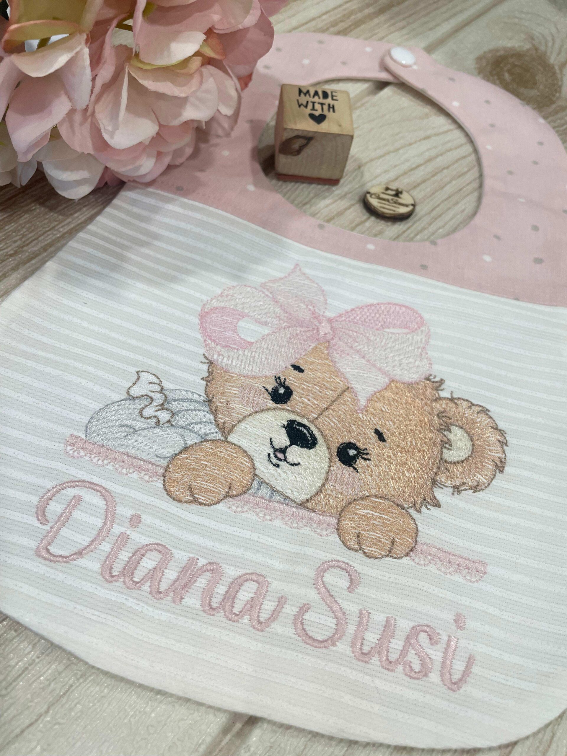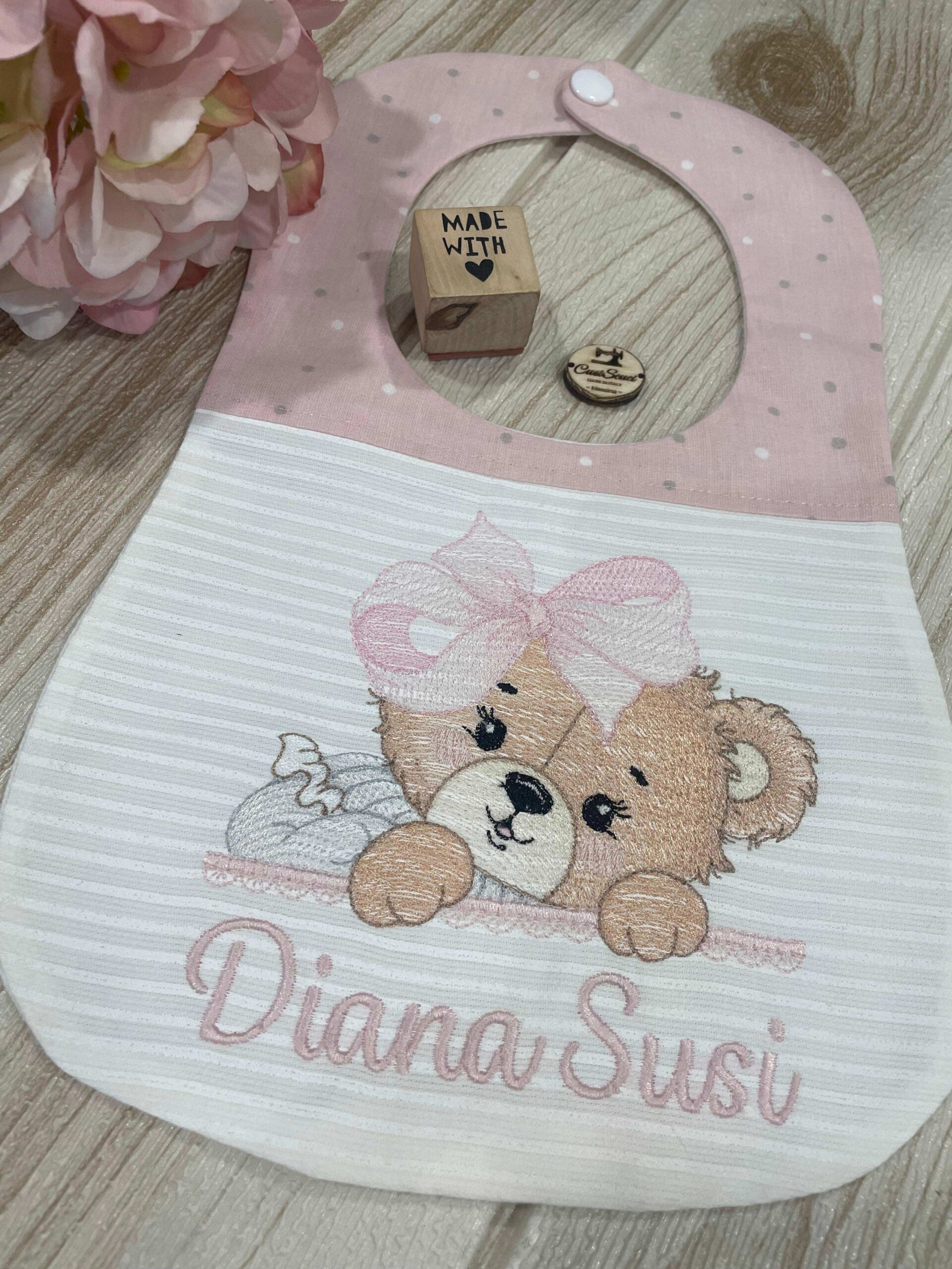 Bavaglino realizzato interamente a mano dalla nostra sartoria, con nome personalizzato e il ricamo di un’orsetta.