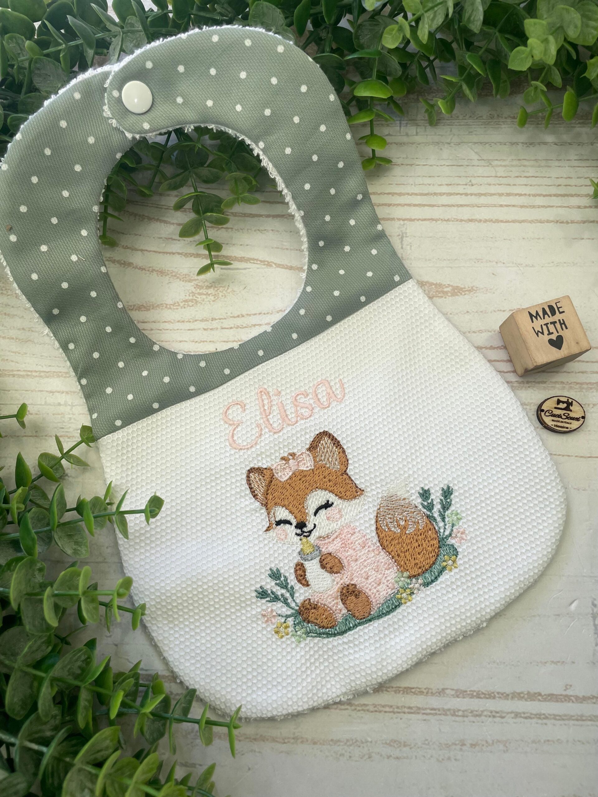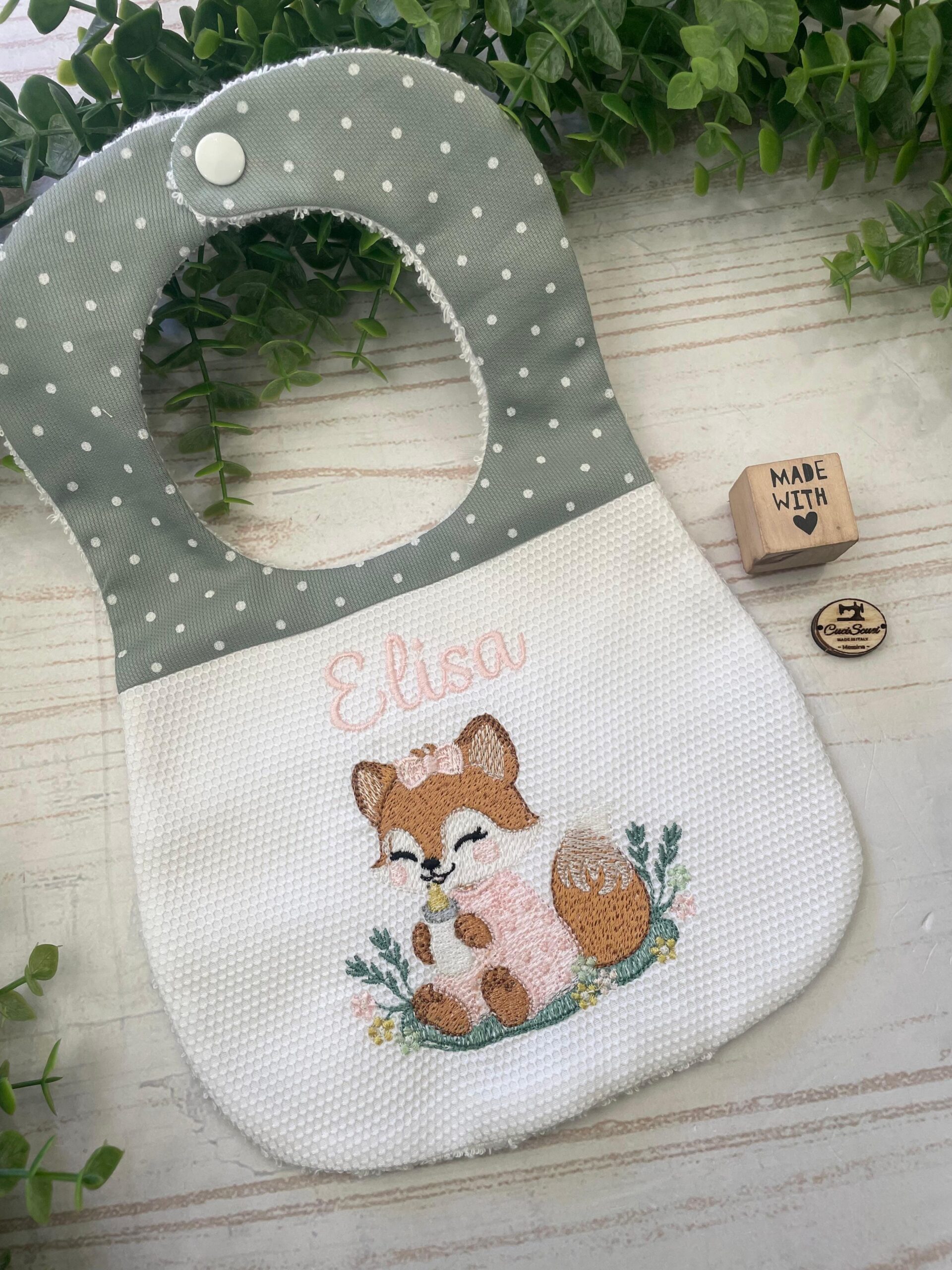 Bavaglino realizzato interamente a mano dalla nostra sartoria, con nome personalizzato e il ricamo di una volpina.