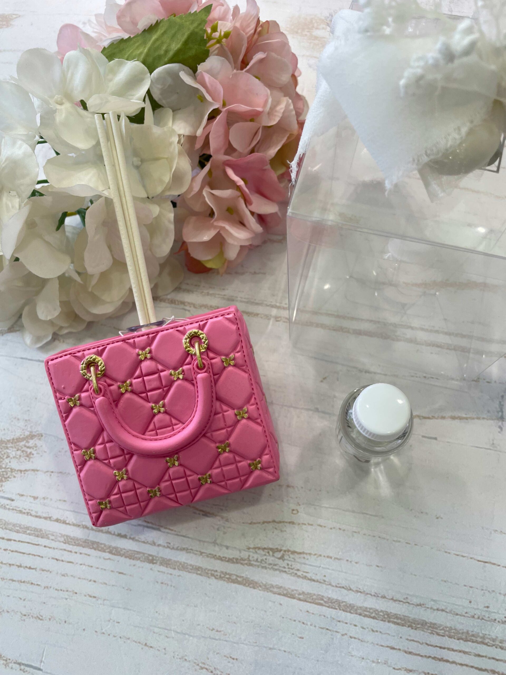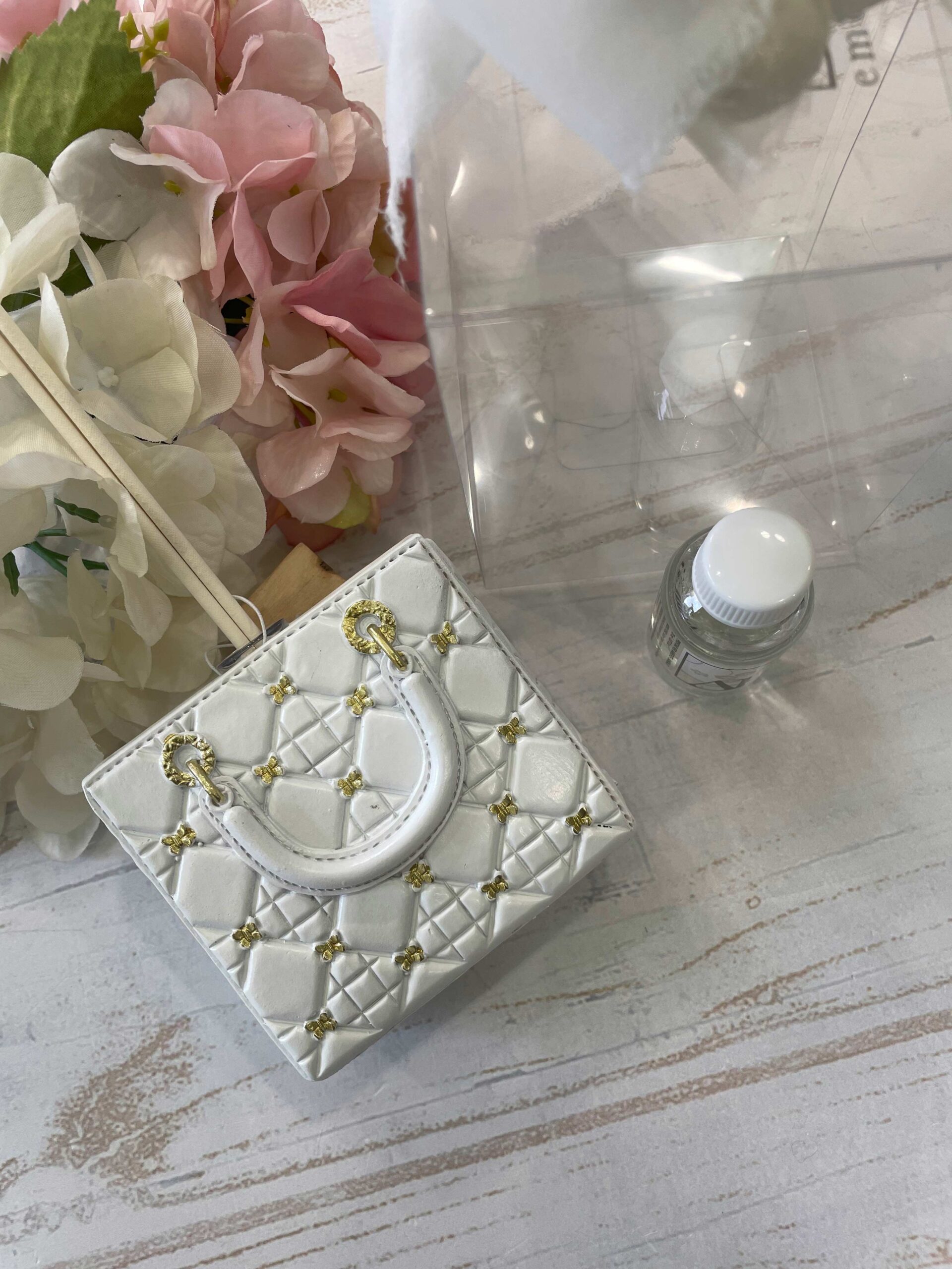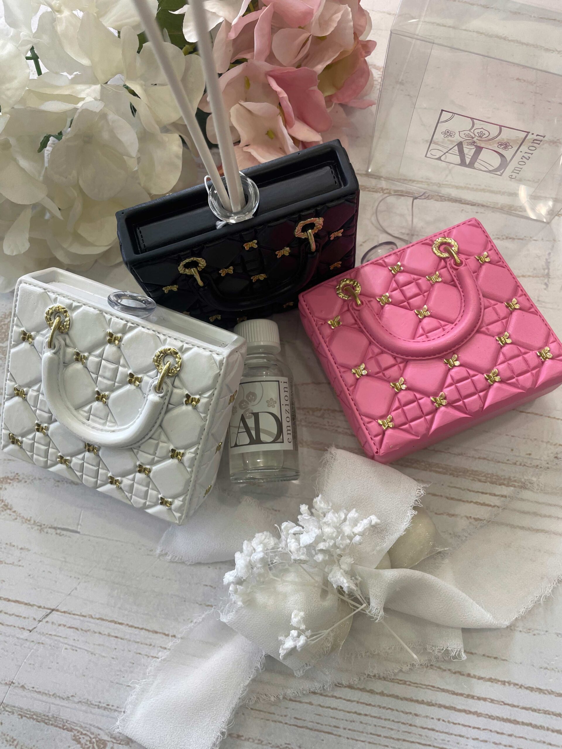 Raffinato profumatore a forma di borsetta con finiture dorate. Art. C2501.