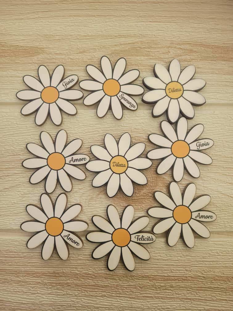 Aggiungi un tocco unico e raffinato ai tuoi eventi con la nostra calamita in legno personalizzata a forma di margherita, realizzata tramite taglio laser ad alta precisione che garantisce bordi perfetti e una finitura elegante.