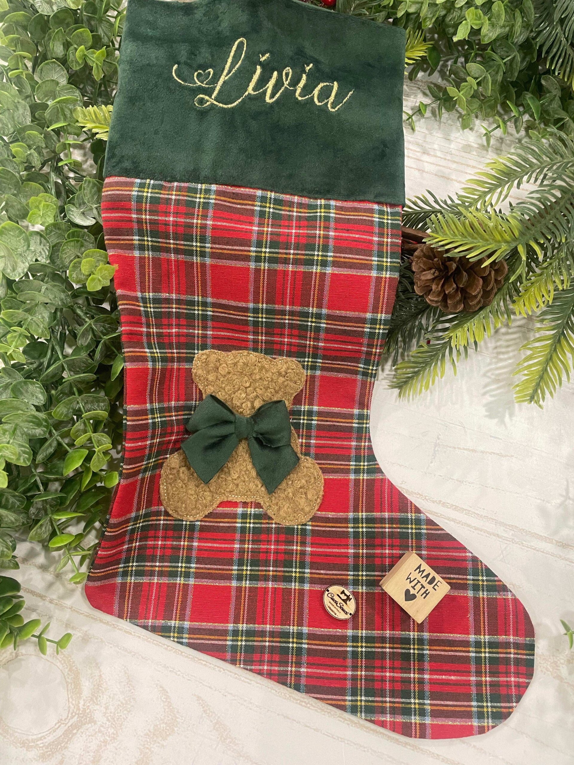 ✨ Calza Natalizia in Tessuto Tartan con Nome Ricamato e Orsetto Bouclè ✨