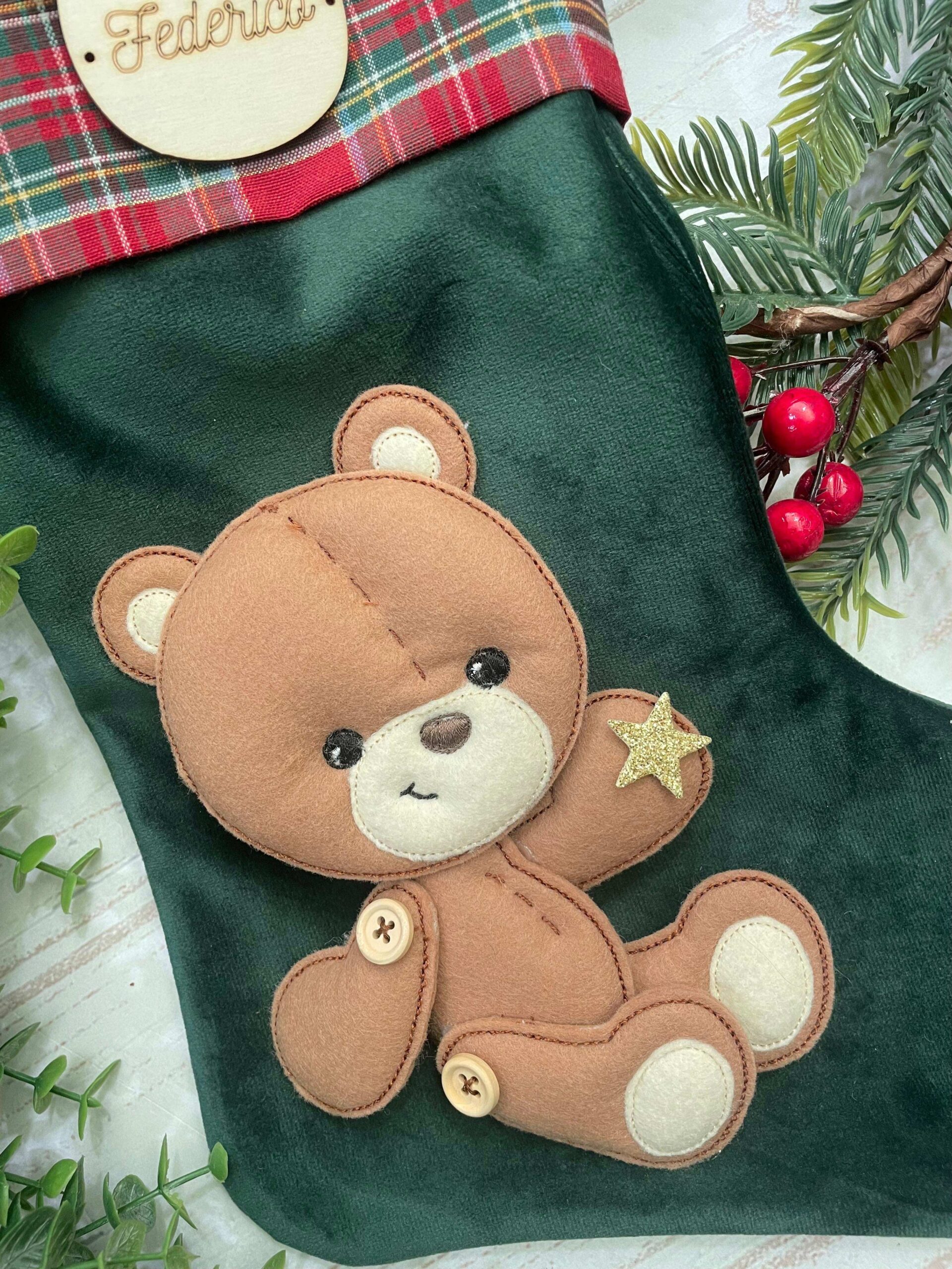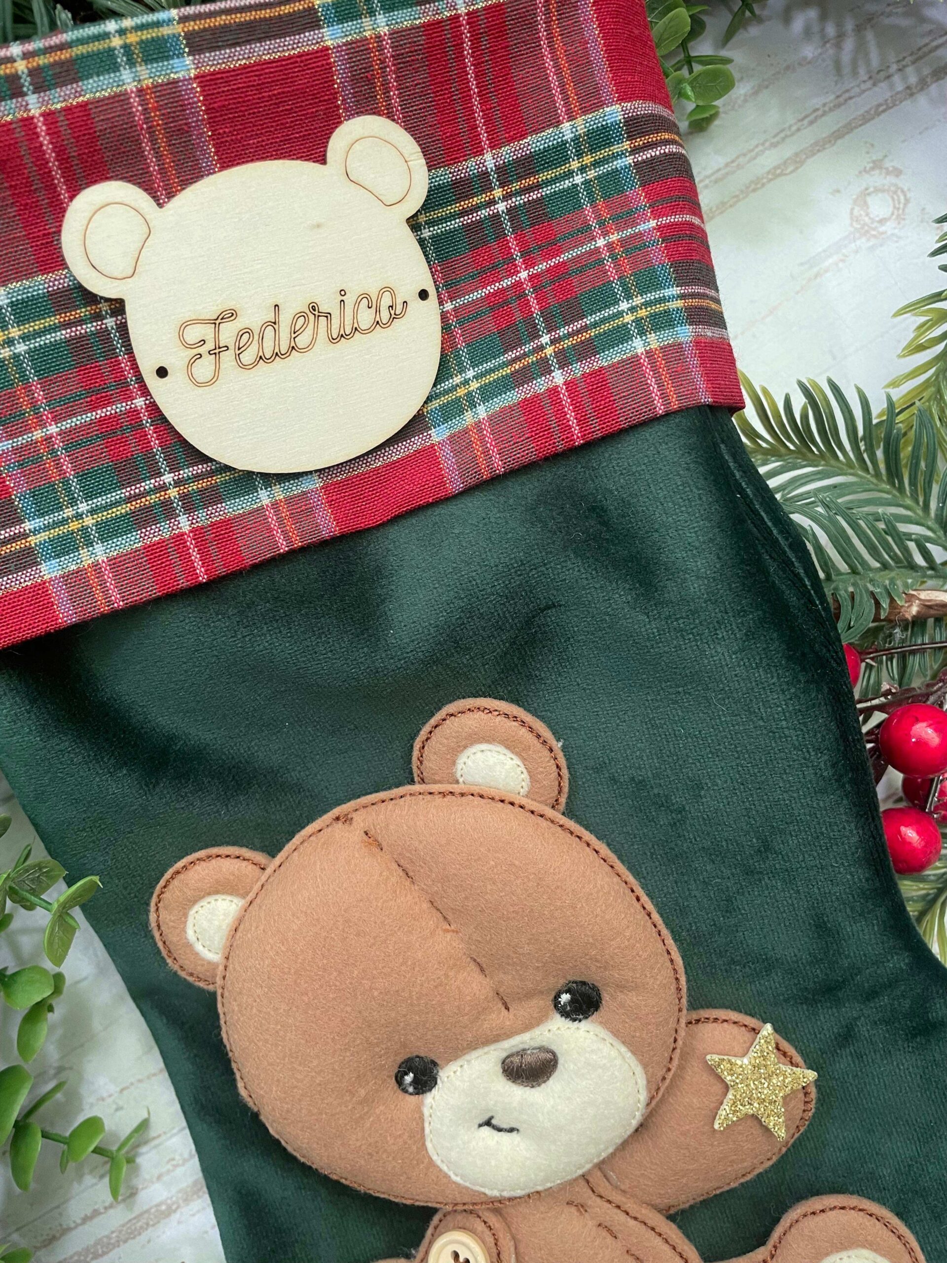 Calza natalizia in velluto con personaggio e targhetta personalizzata ✨