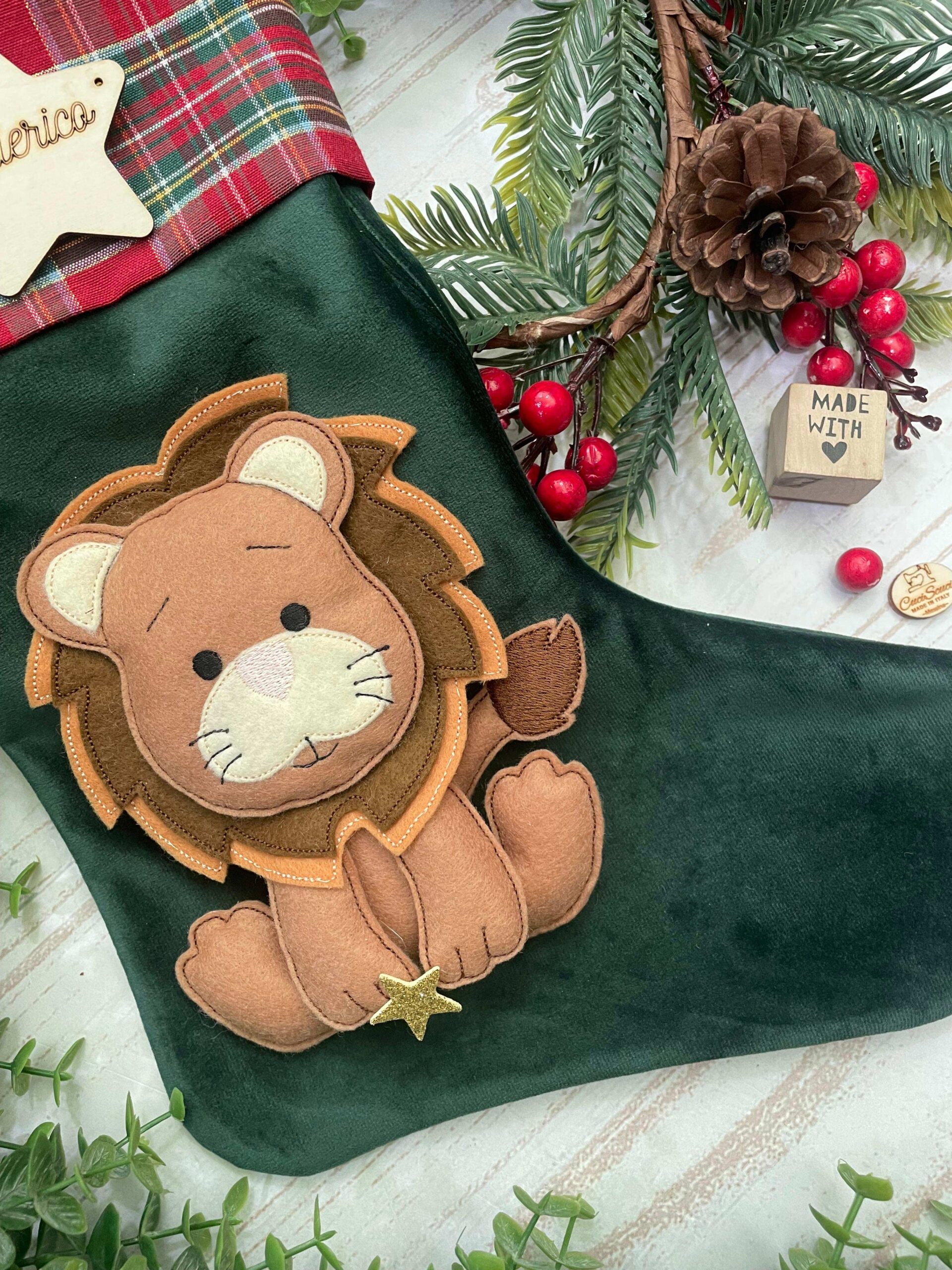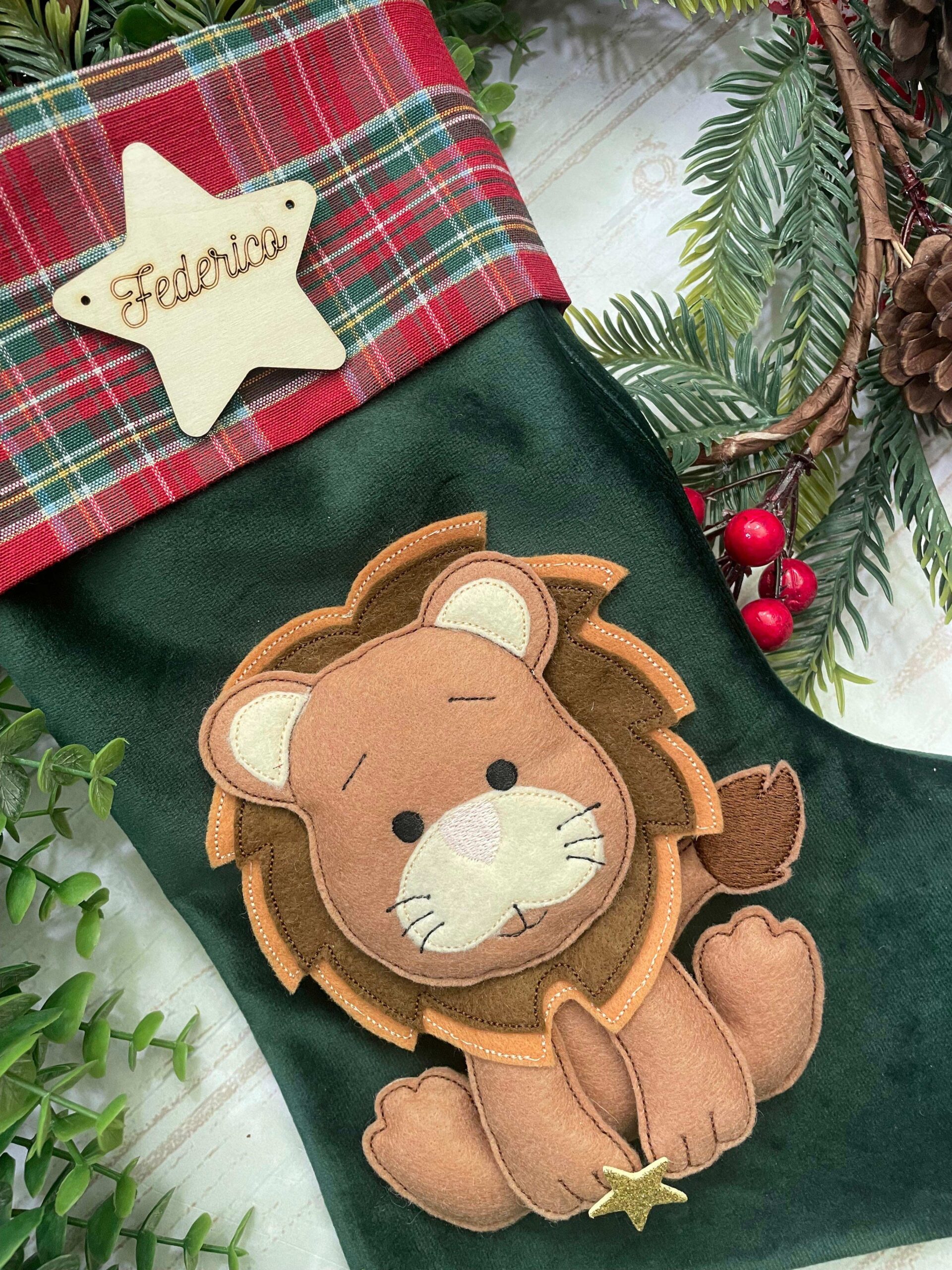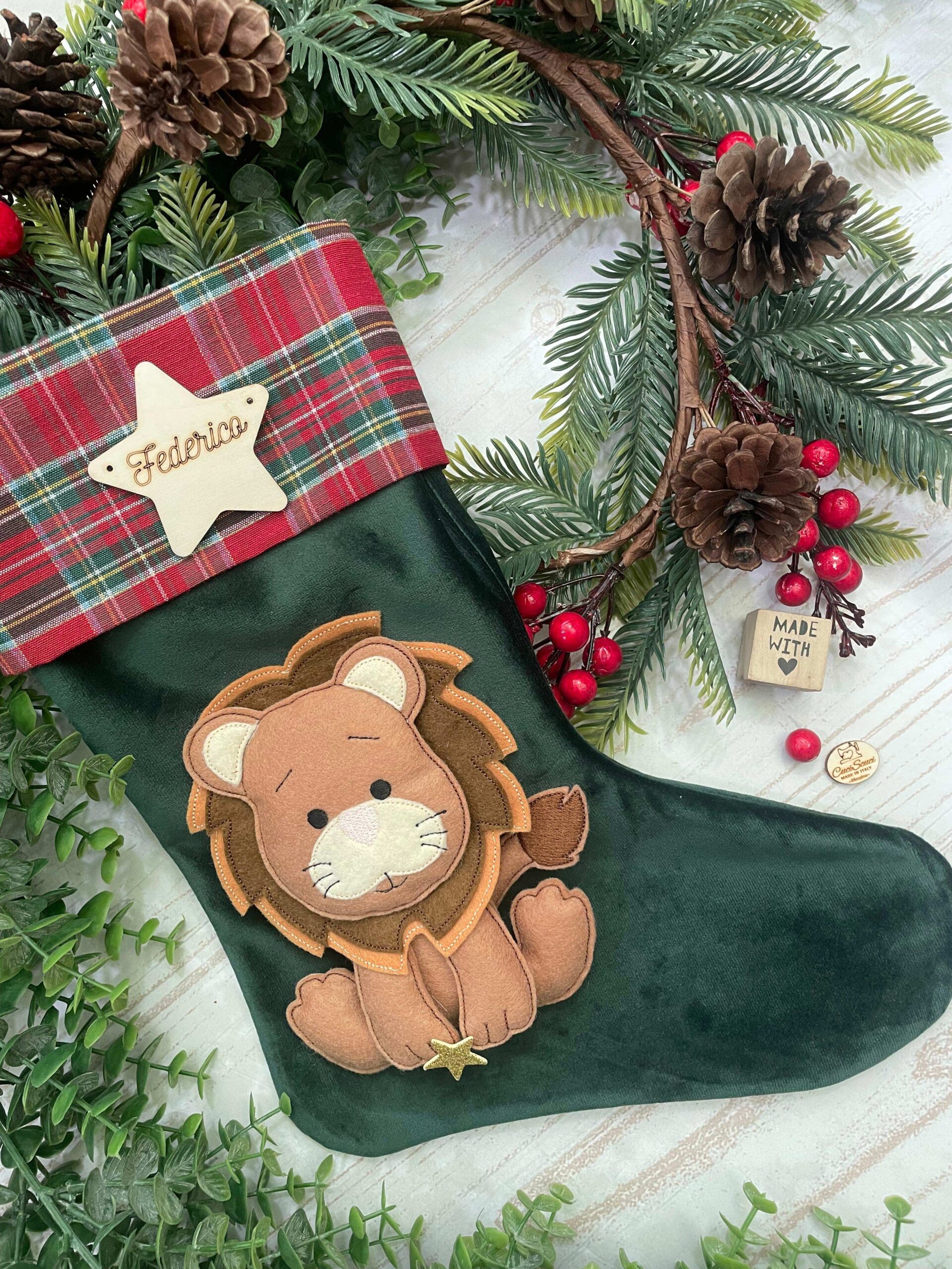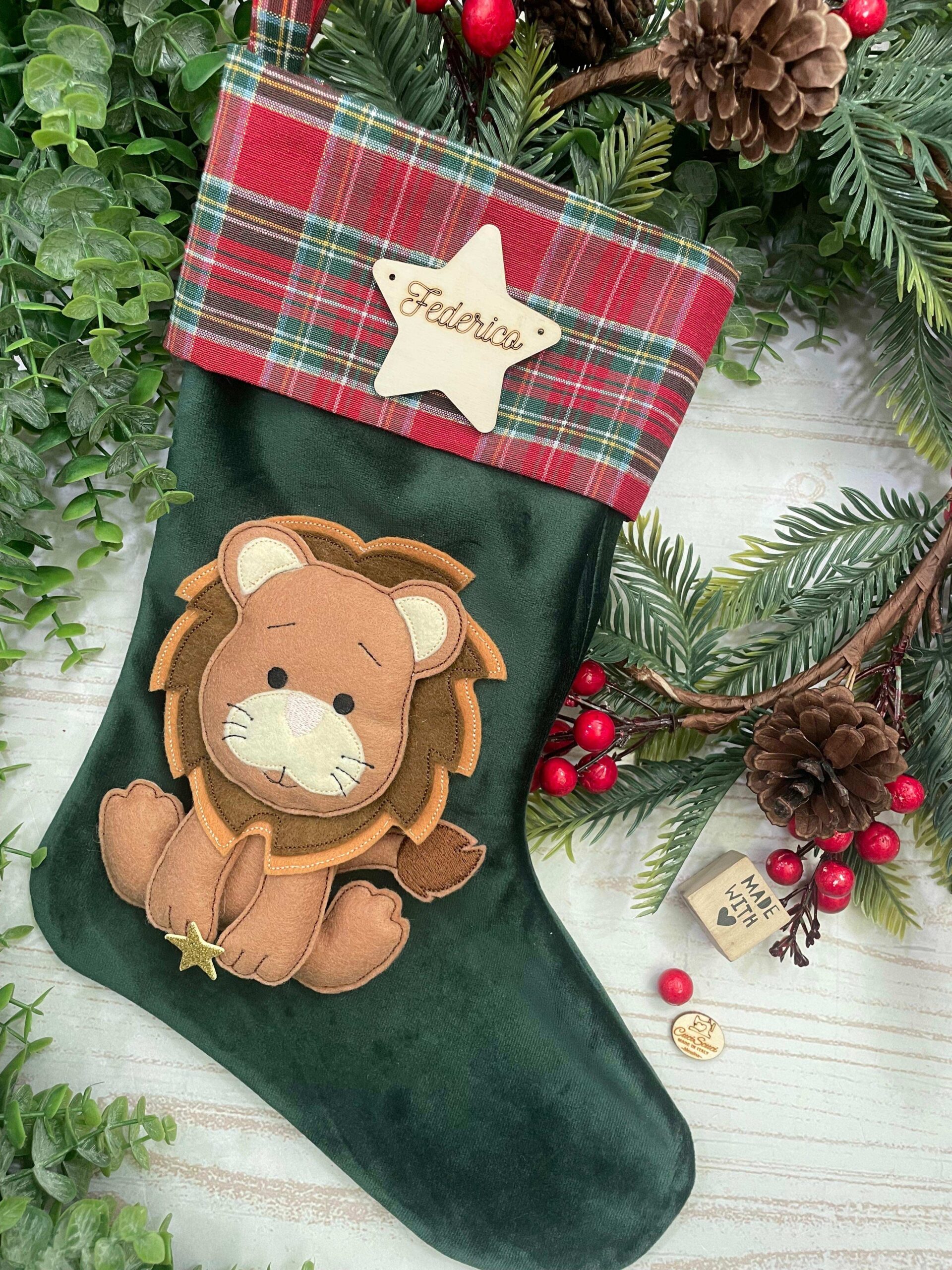 Sul davanti è applicato un tenero personaggio in pannolenci, disponibile nella versione orsetto o leone, che dona dolcezza e carattere alla composizione. A completare il design, sul risvolto è applicata una targhetta in legno personalizzata con il nome, disponibile a forma di stella o di orsetto, per rendere ogni calza unica e speciale.