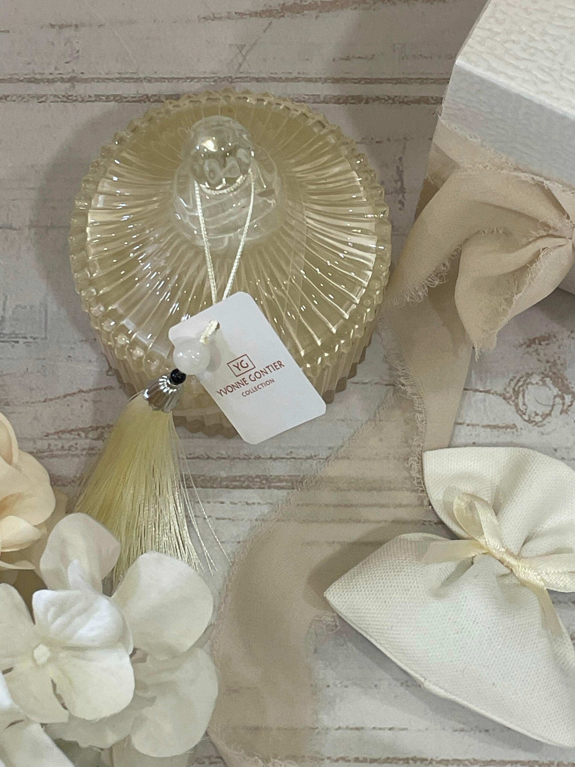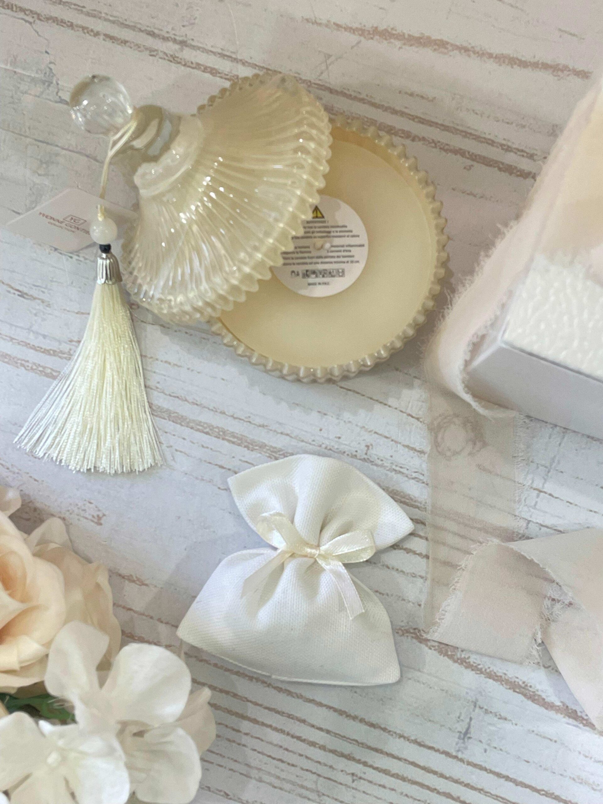 La candela profumata all’interno sprigiona una fragranza delicata e avvolgente, rendendo questo oggetto non solo decorativo ma anche piacevole da utilizzare, ideale come bomboniera dal gusto sobrio e raffinato.