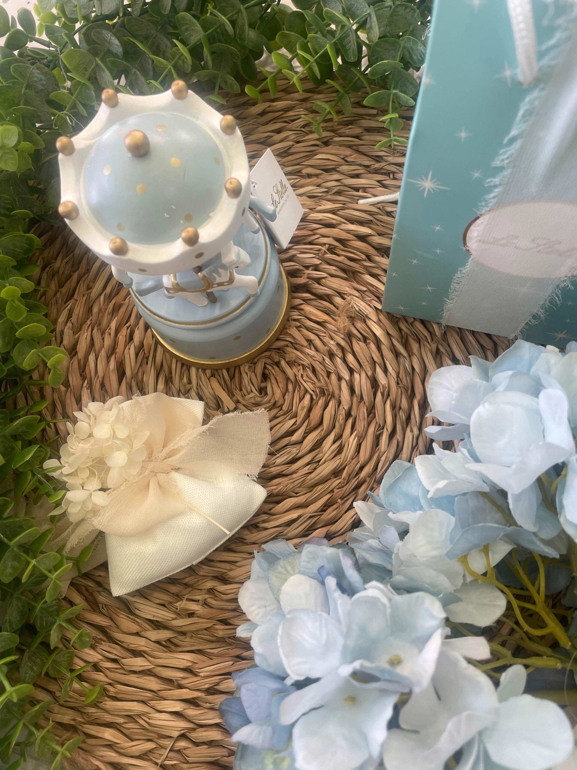 Delicato carillon a forma di giostrina in legno color celeste, impreziosito da raffinati dettagli dorati che donano luminosità e un tocco prezioso al design. Un oggetto dolce e senza tempo, perfetto come ricordo simbolico per celebrare i momenti più speciali dell’infanzia.