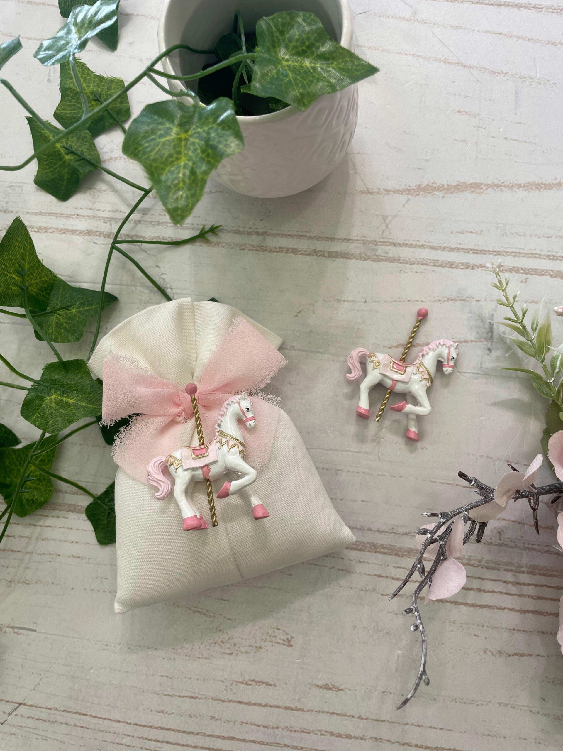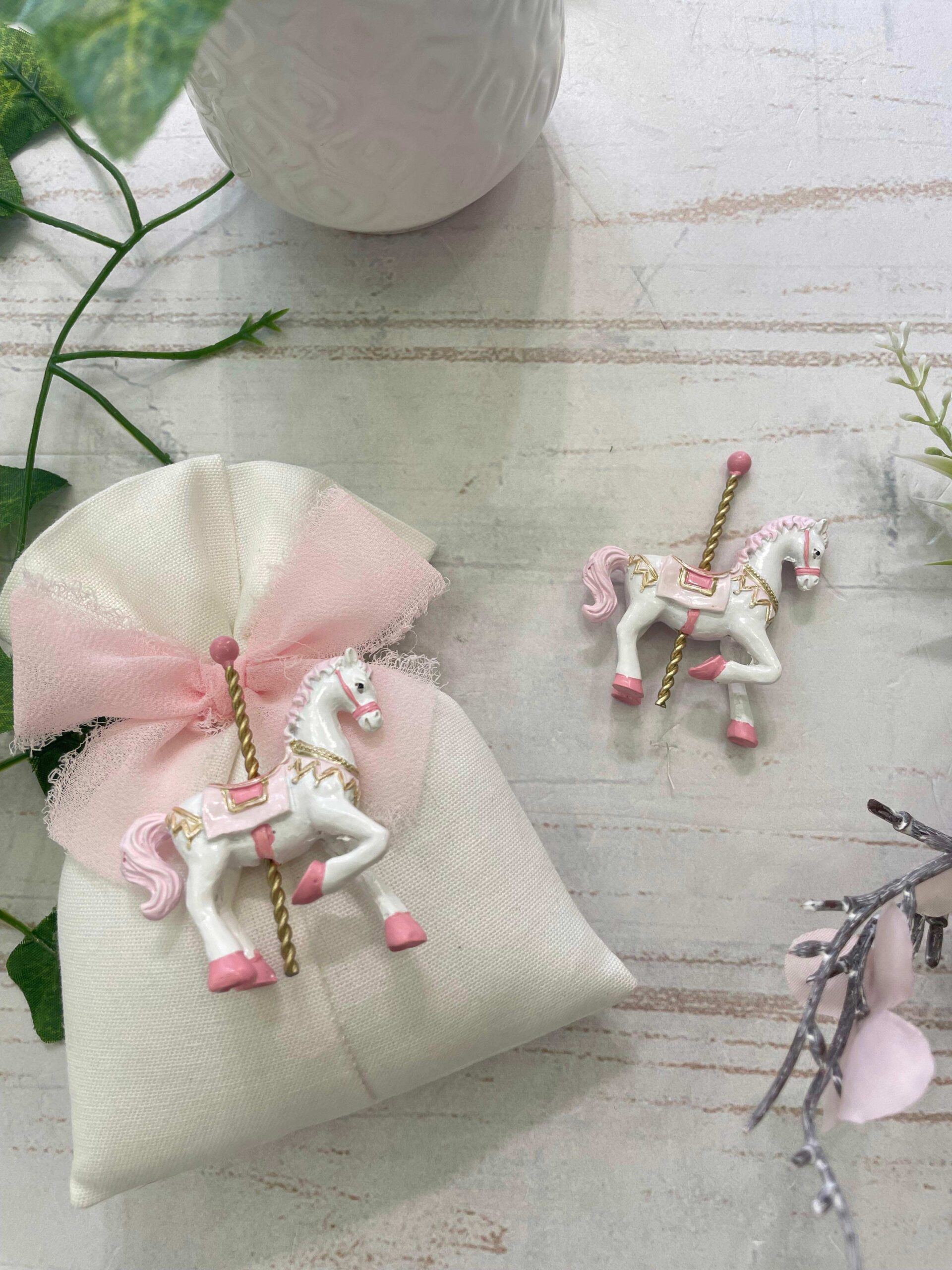 La presenza dell’elemento centrale richiama il classico sostegno dei cavallini da giostra, evocando un immaginario romantico e nostalgico, perfetto per celebrare i momenti più preziosi dedicati ai più piccoli.