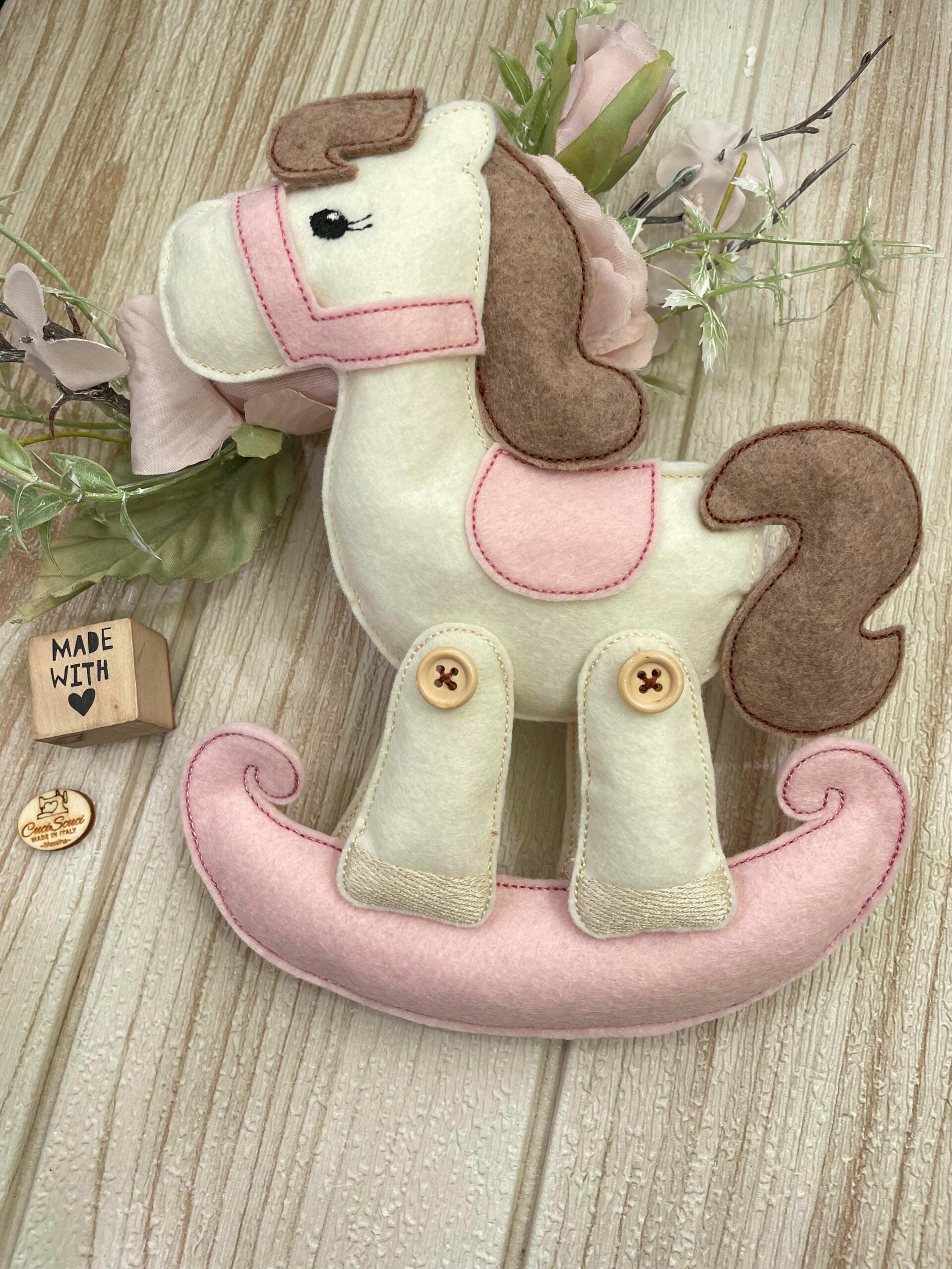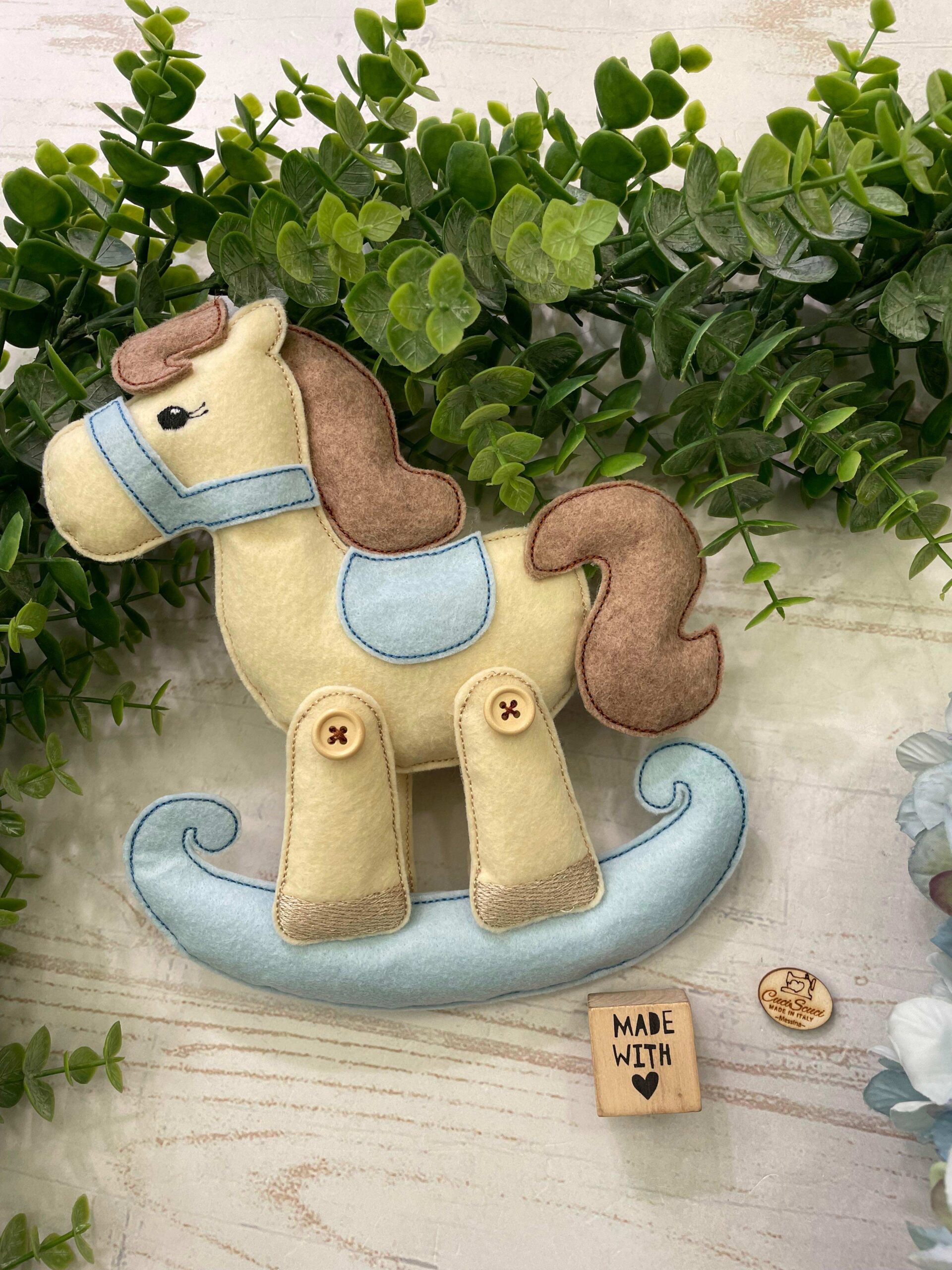 Un tenero cavalluccio a dondolo nei toni del rosa o del celeste realizzato in pannolenci.