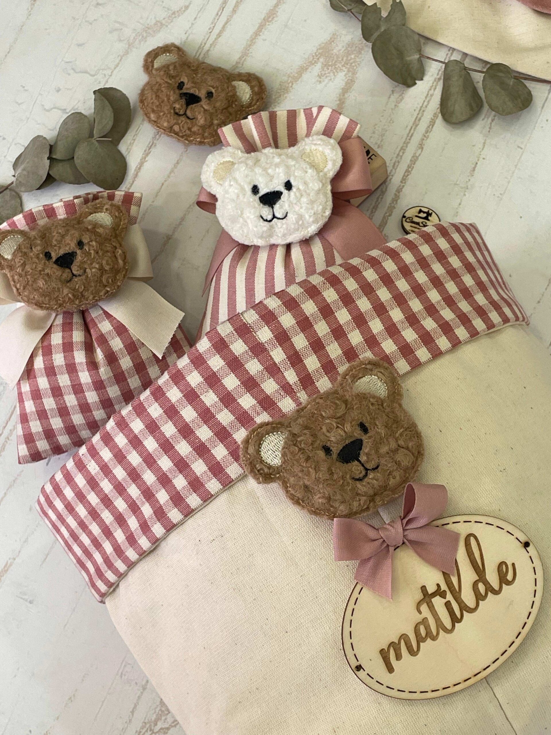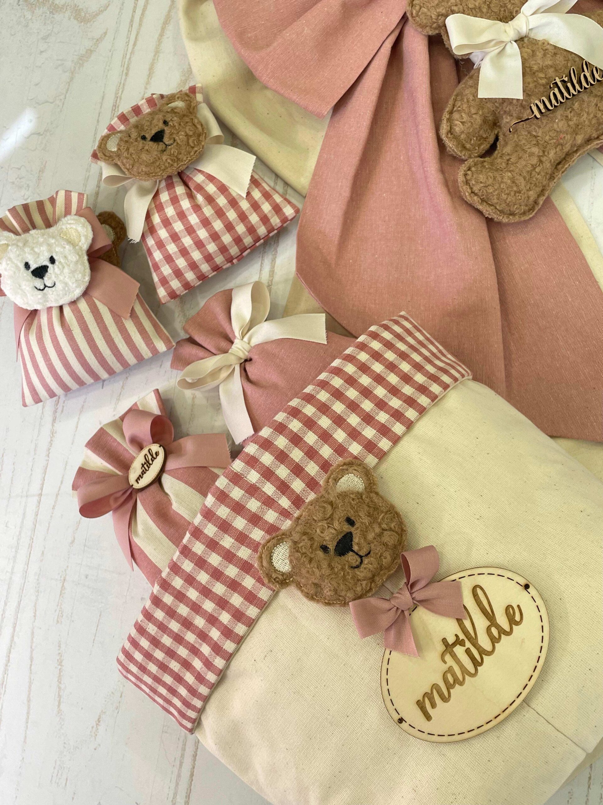 Realizzato in cotone tinto filo, interamente a mano, nei toni del rosa antico e del panna, rifinito con bordo a quadretti, il cestino è impreziosito da una targhetta in legno personalizzata con il nome della bambina e da un orsetto in tessuto bouclè.
