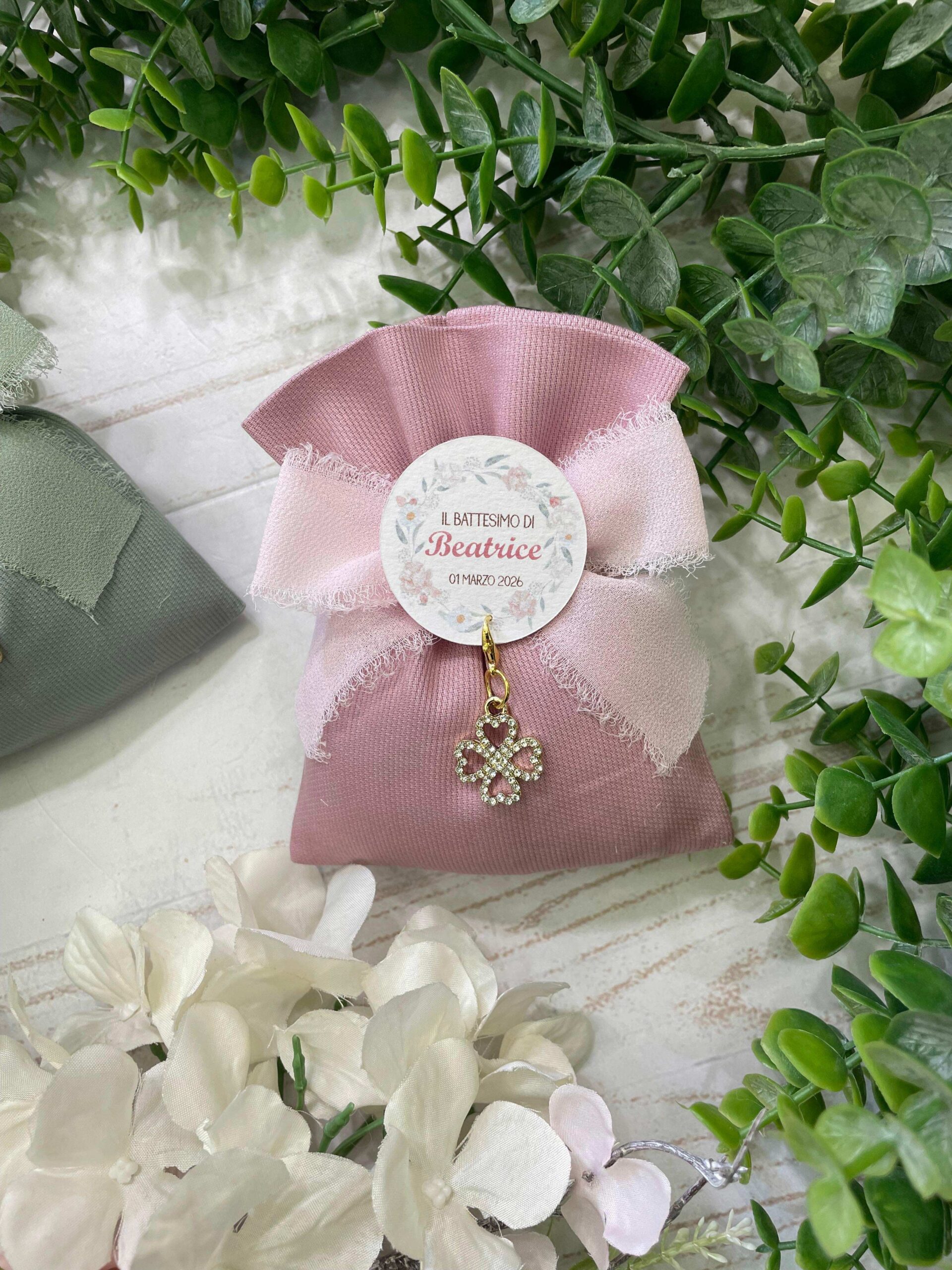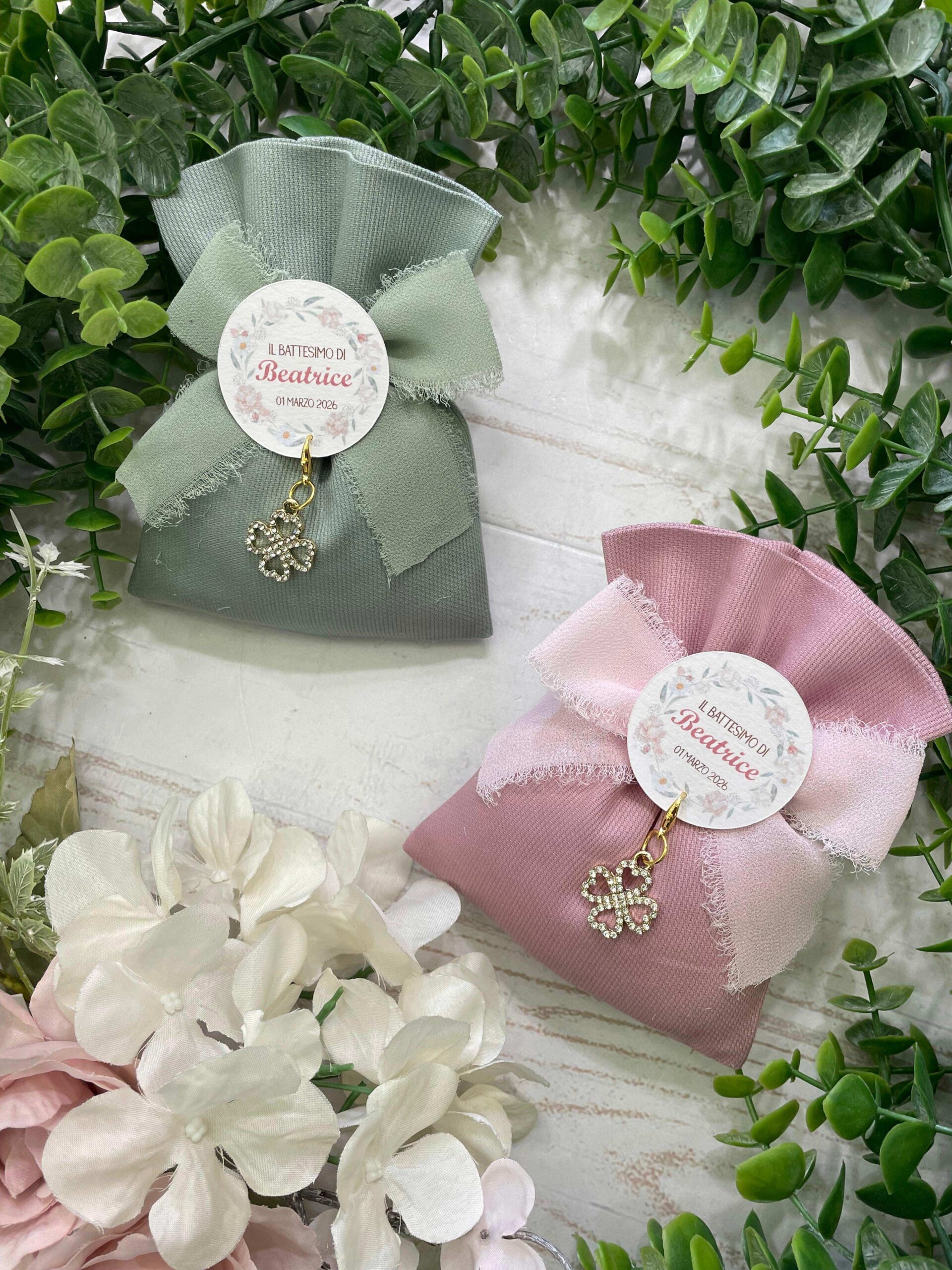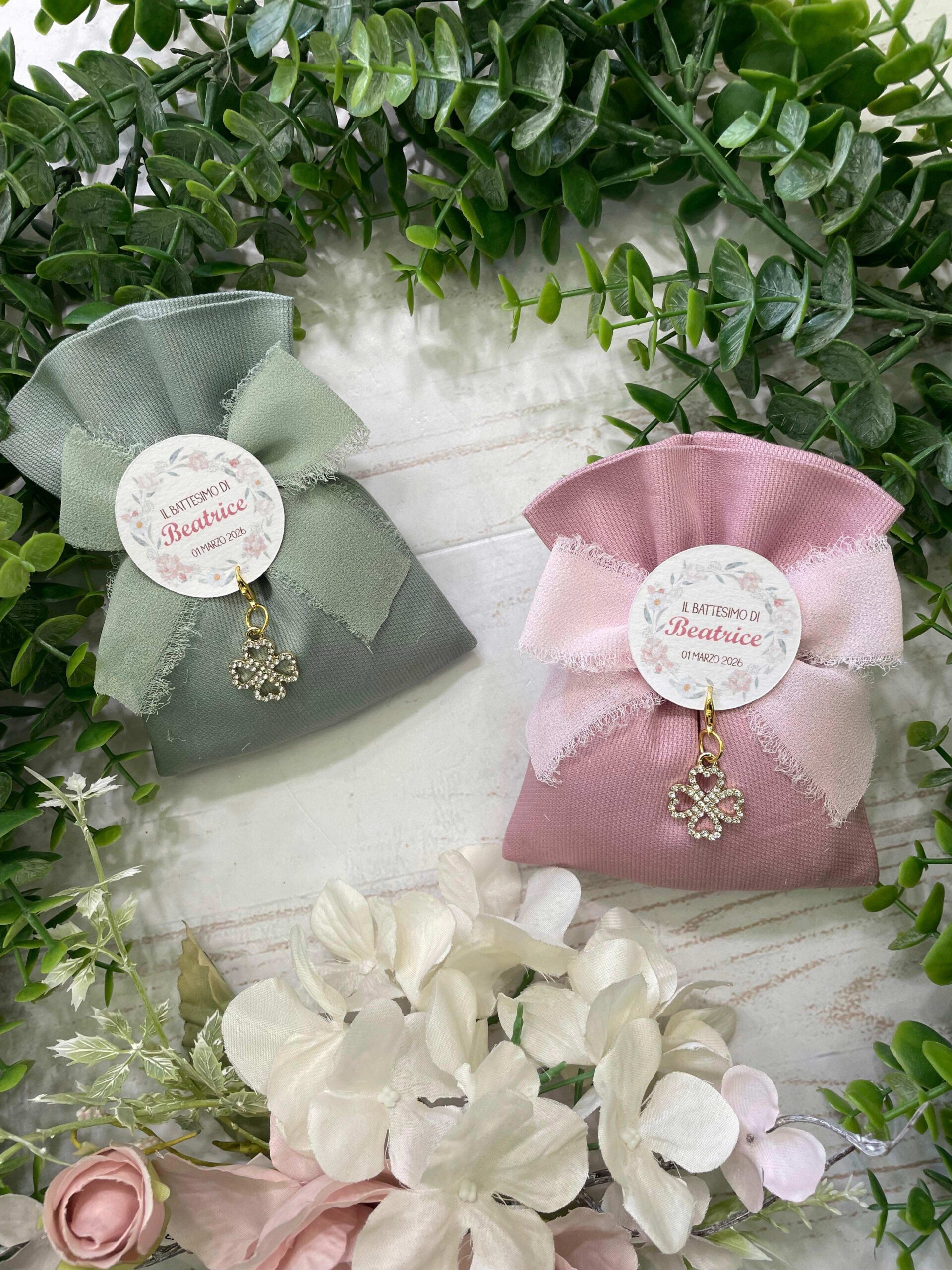Il ciondolo viene applicato a un sacchetto sartoriale, disponibile in colore a scelta, rifinito con cura e attenzione ai dettagli. La confezione è completata da un tag personalizzato e include 5 confetti a scelta, per un risultato armonioso, elegante e pronto per essere donato.