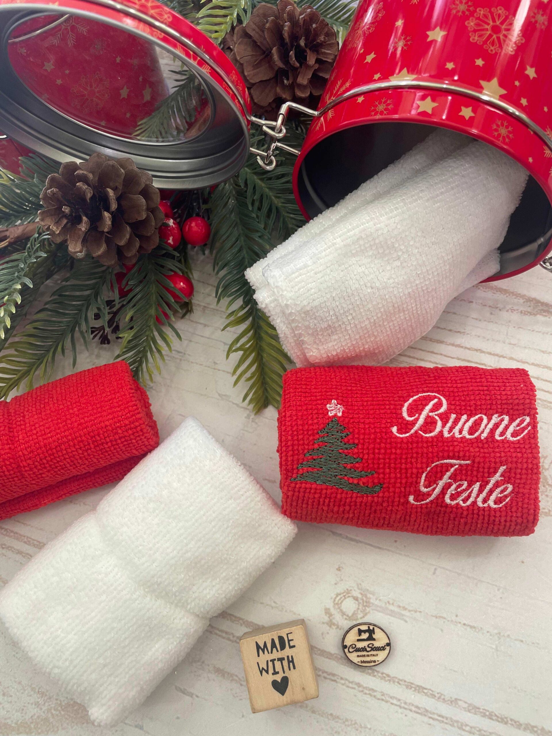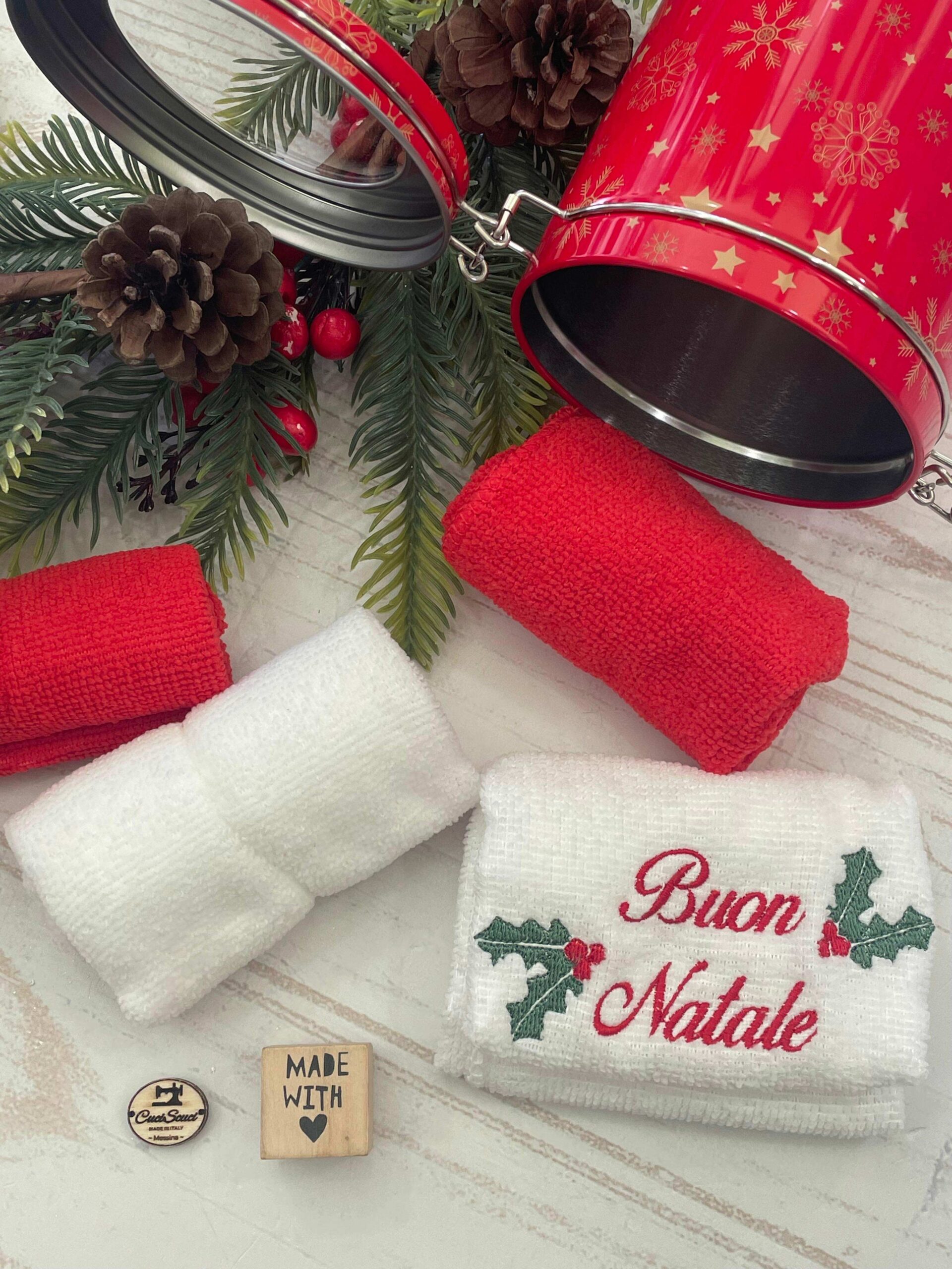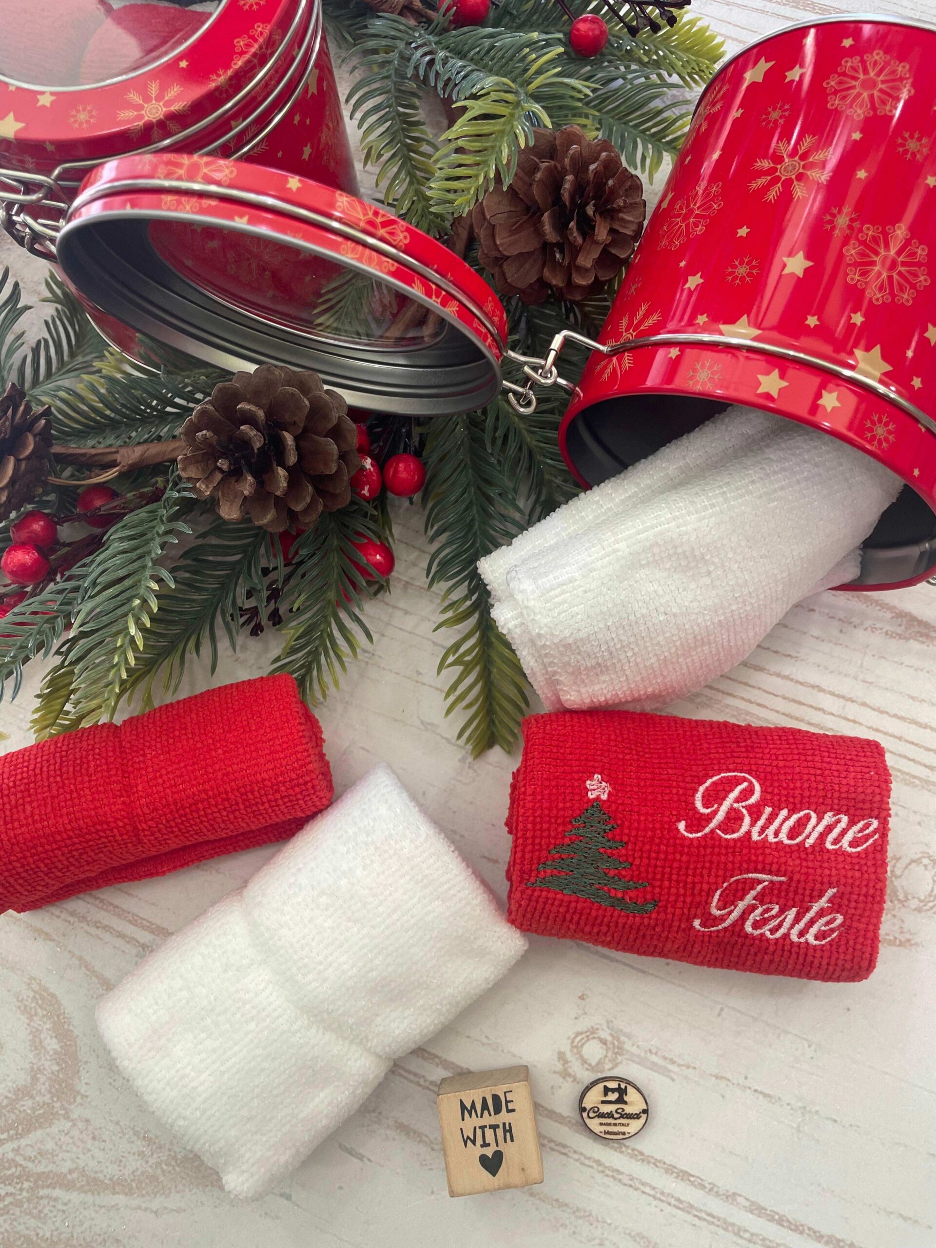 La confezione in metallo custodisce con cura 4 morbide lavette (2 bianche e 2 rosse), una delle quali impreziosita dal ricamo “Buone Feste”, per aggiungere un dettaglio caldo e celebrativo alla stagione natalizia 🎄