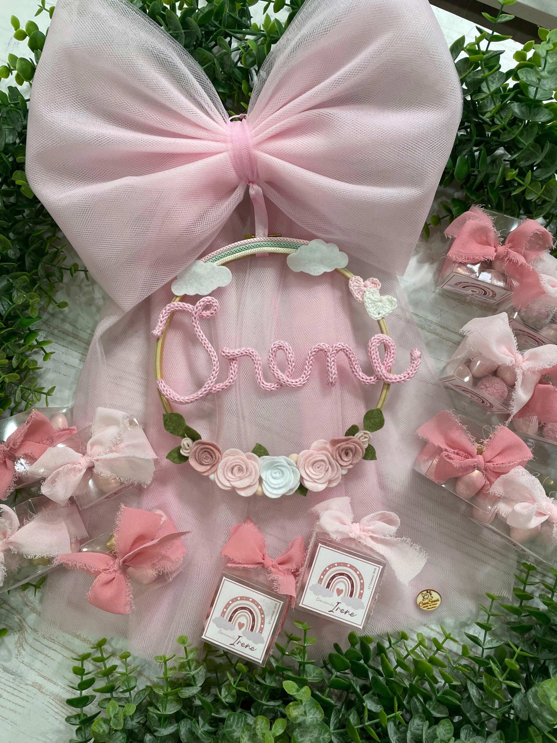• Fiocco nascita in tulle rosa, leggero e scenografico, impreziosito da un mini telaio in legno decorato con rose in pannolenci, un delicato arcobaleno e piccoli cuori in crochet. Al centro, il nome della bimba prende forma in un elegante tricotin rosa, creando un dettaglio personalizzato e raffinato.