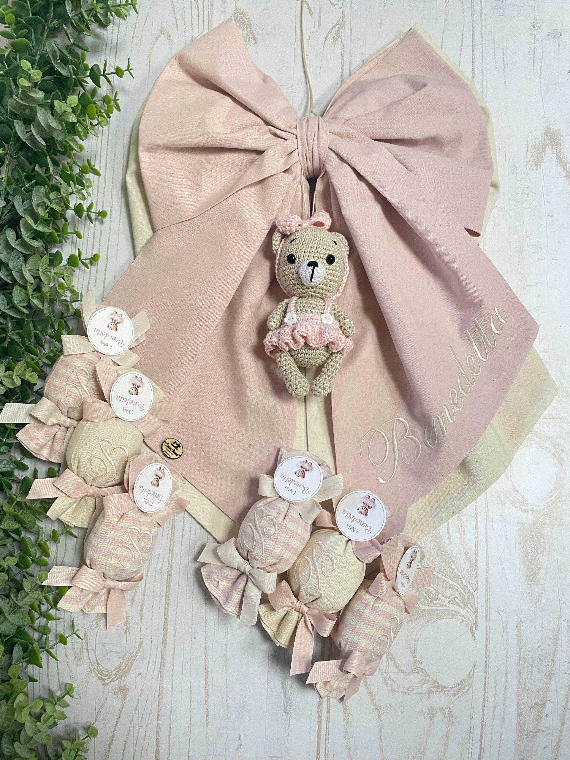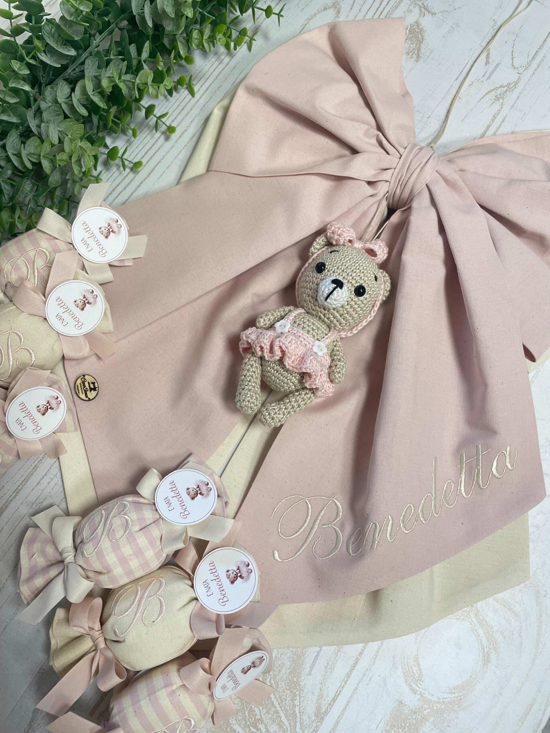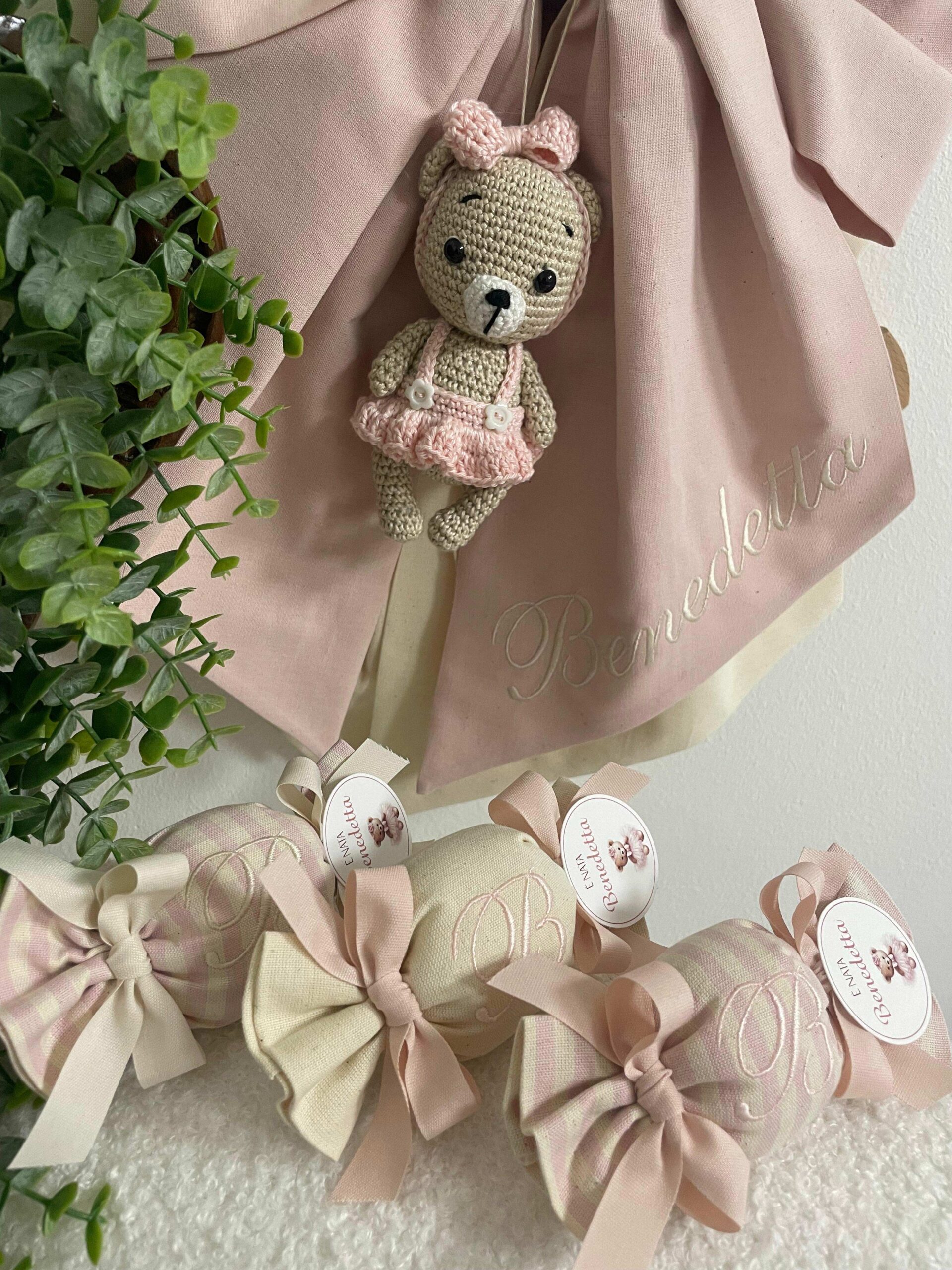 - Fiocco nascita personalizzato, con il nome ricamato e un tenero orsetto in amigurumi applicato, vestito con un dolce tutù lavorato a mano