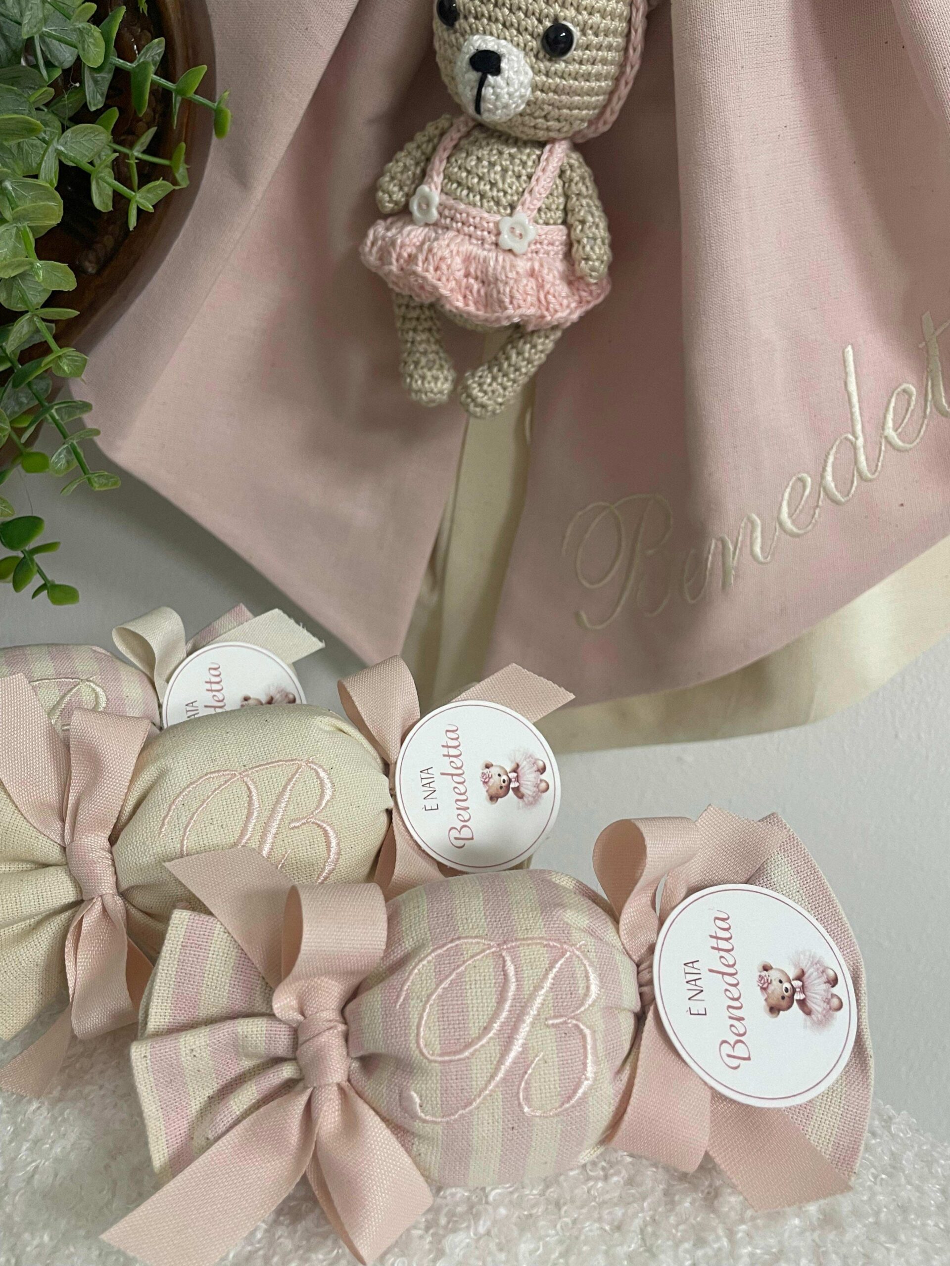 Un coordinato nascita romantico e raffinato, nei delicati toni del rosa cipria e crema, perfetto per accogliere la tua bambina con eleganza. Ogni dettaglio è curato con amore e realizzato artigianalmente, impreziosendo il corredo con tessuti di qualità e ricami personalizzati.