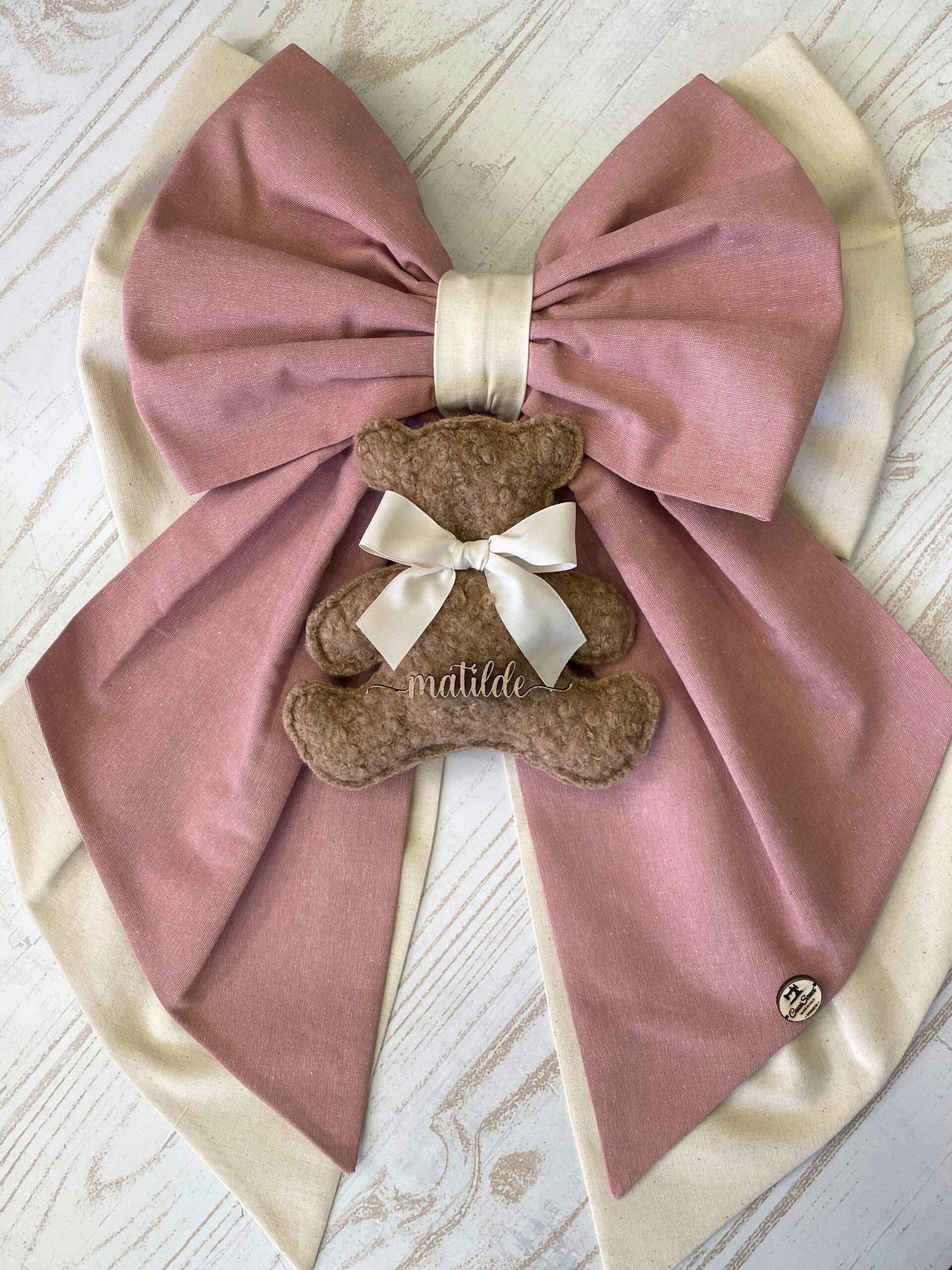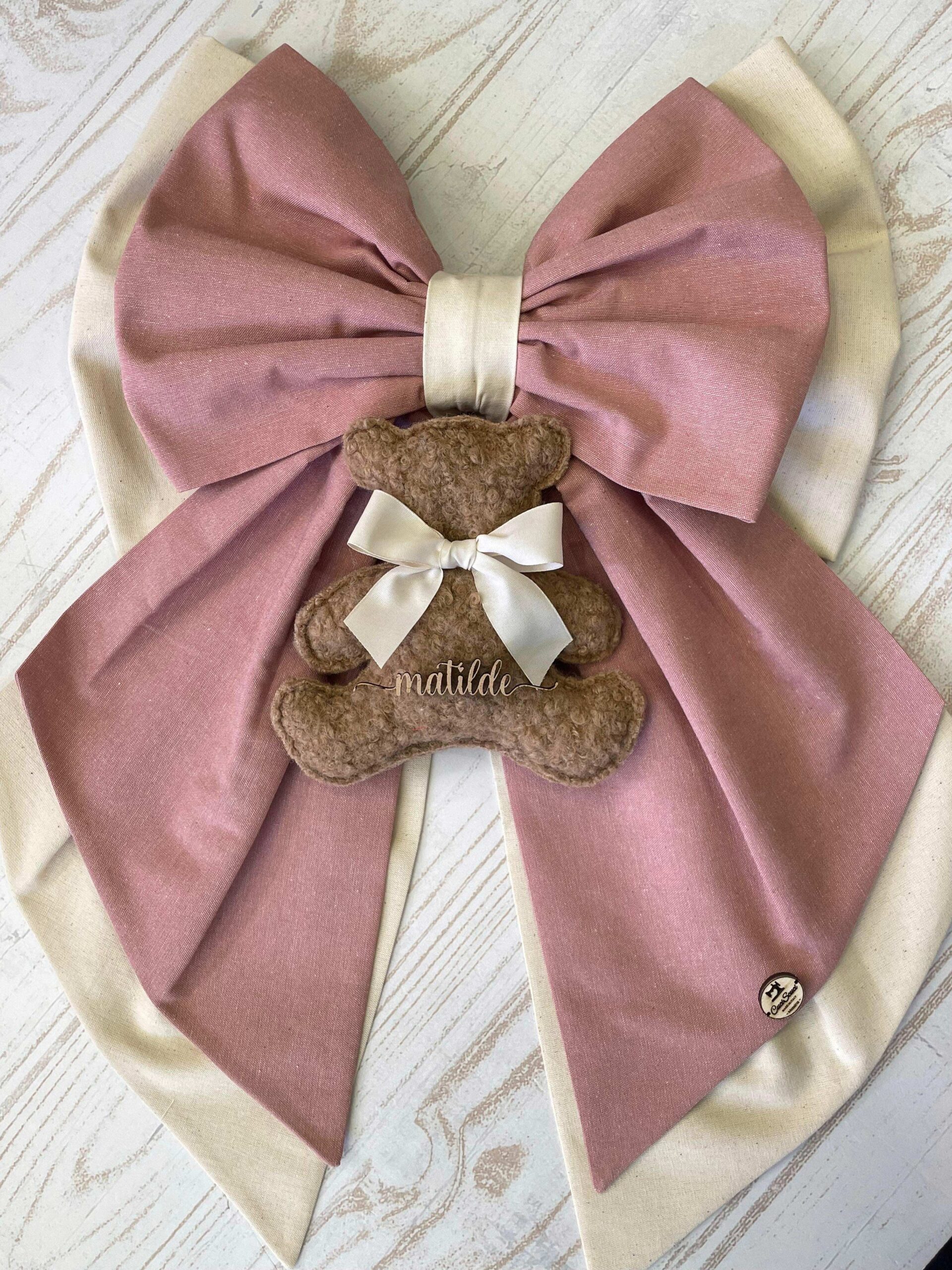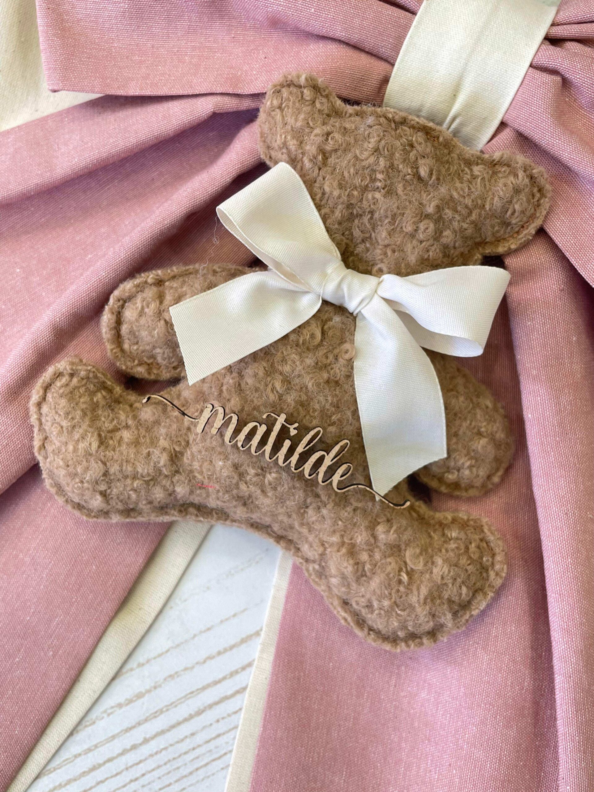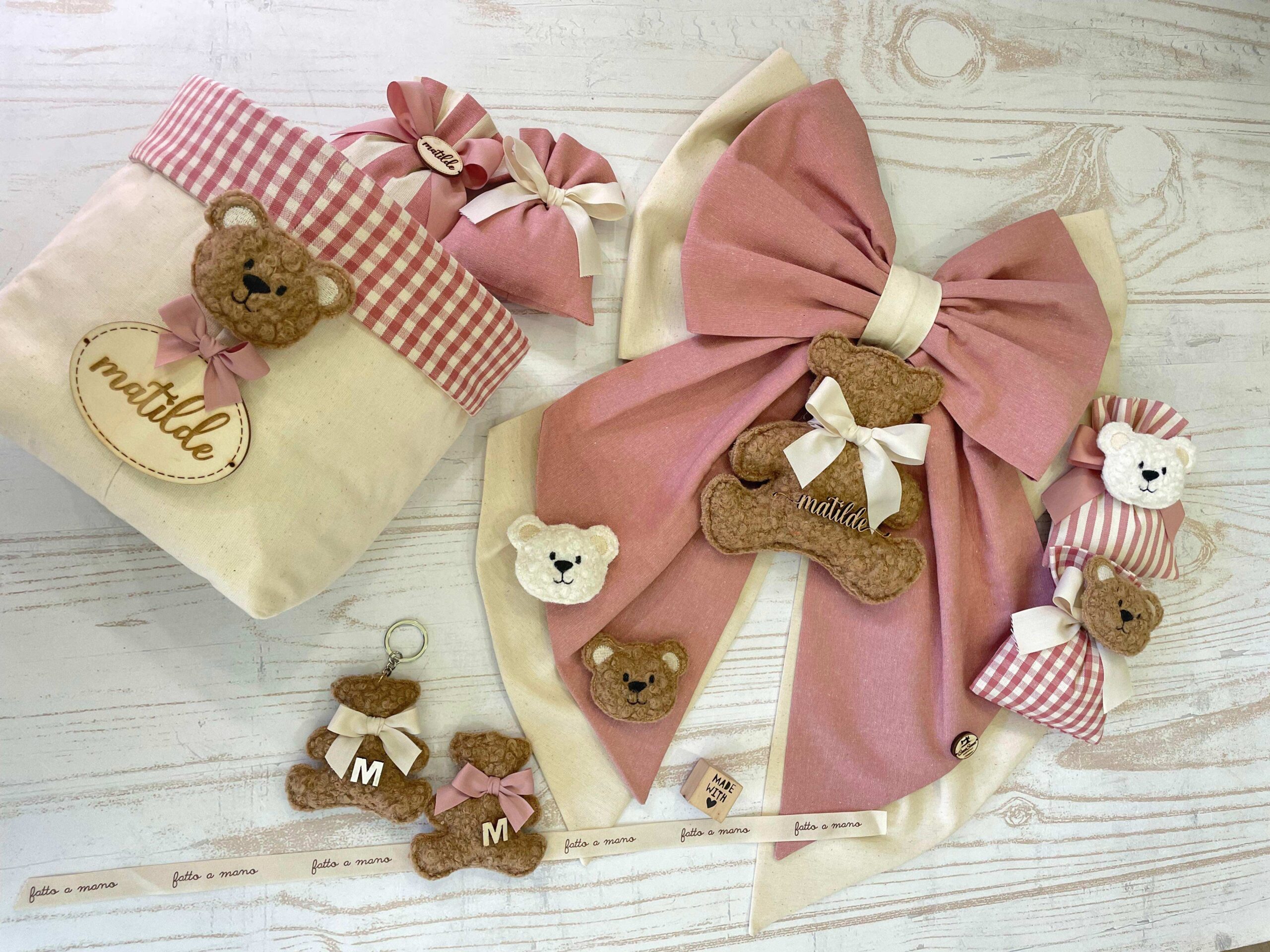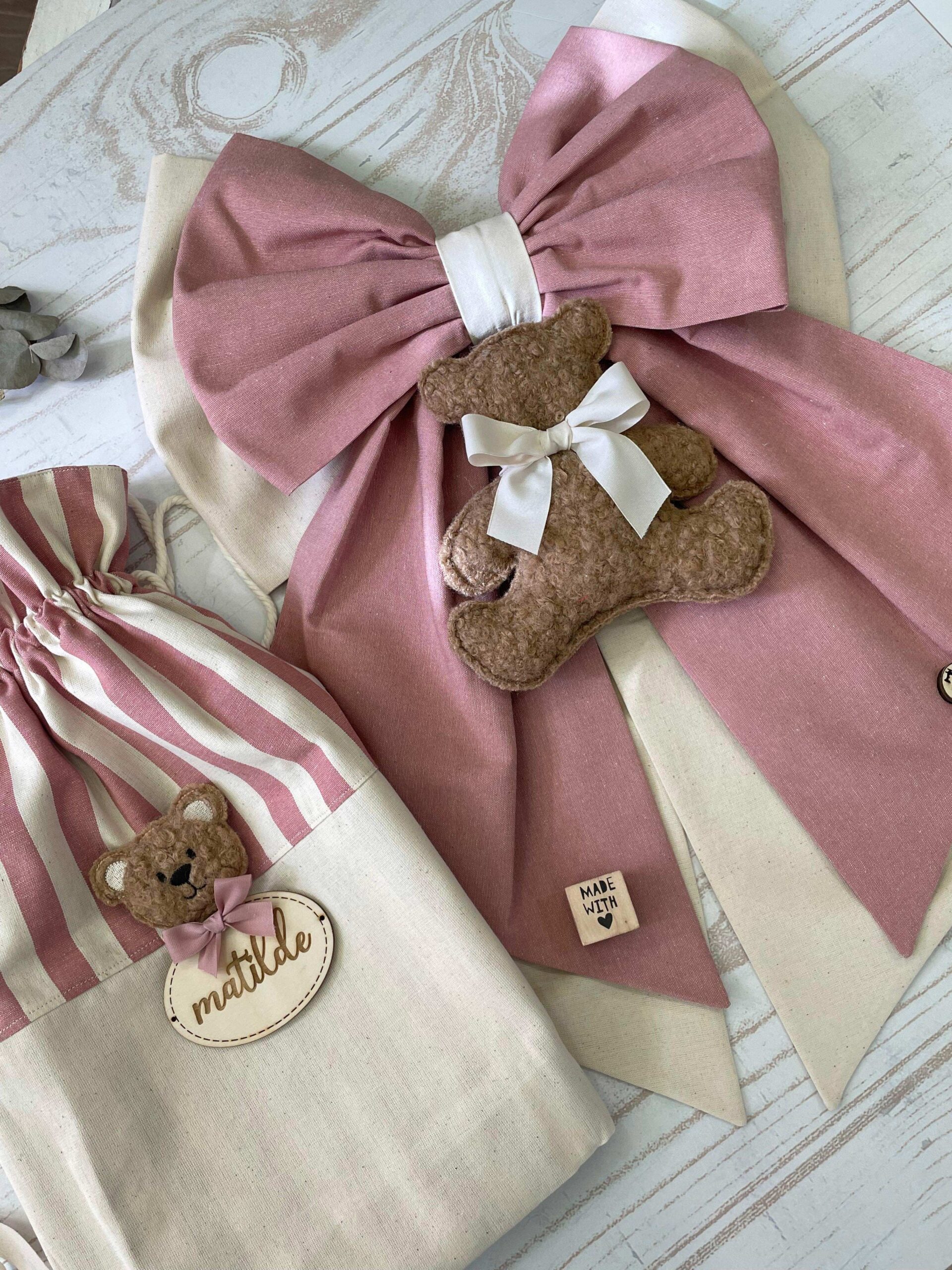 Una collezione raffinata e delicata, perfetta per accogliere con dolcezza una nuova vita. Ogni articolo è realizzato in morbido cotone naturale nei toni del rosa antico e crema, impreziosito da un un orsetto in tessuto bouclè e una targhetta in legno personalizzata.