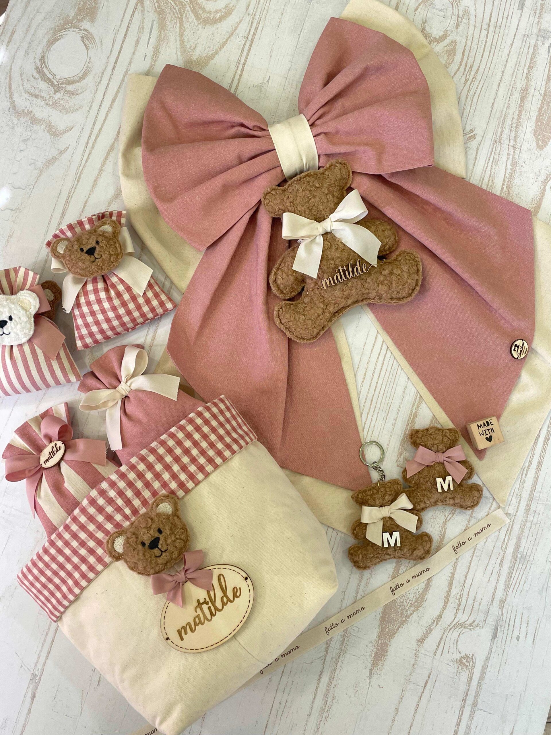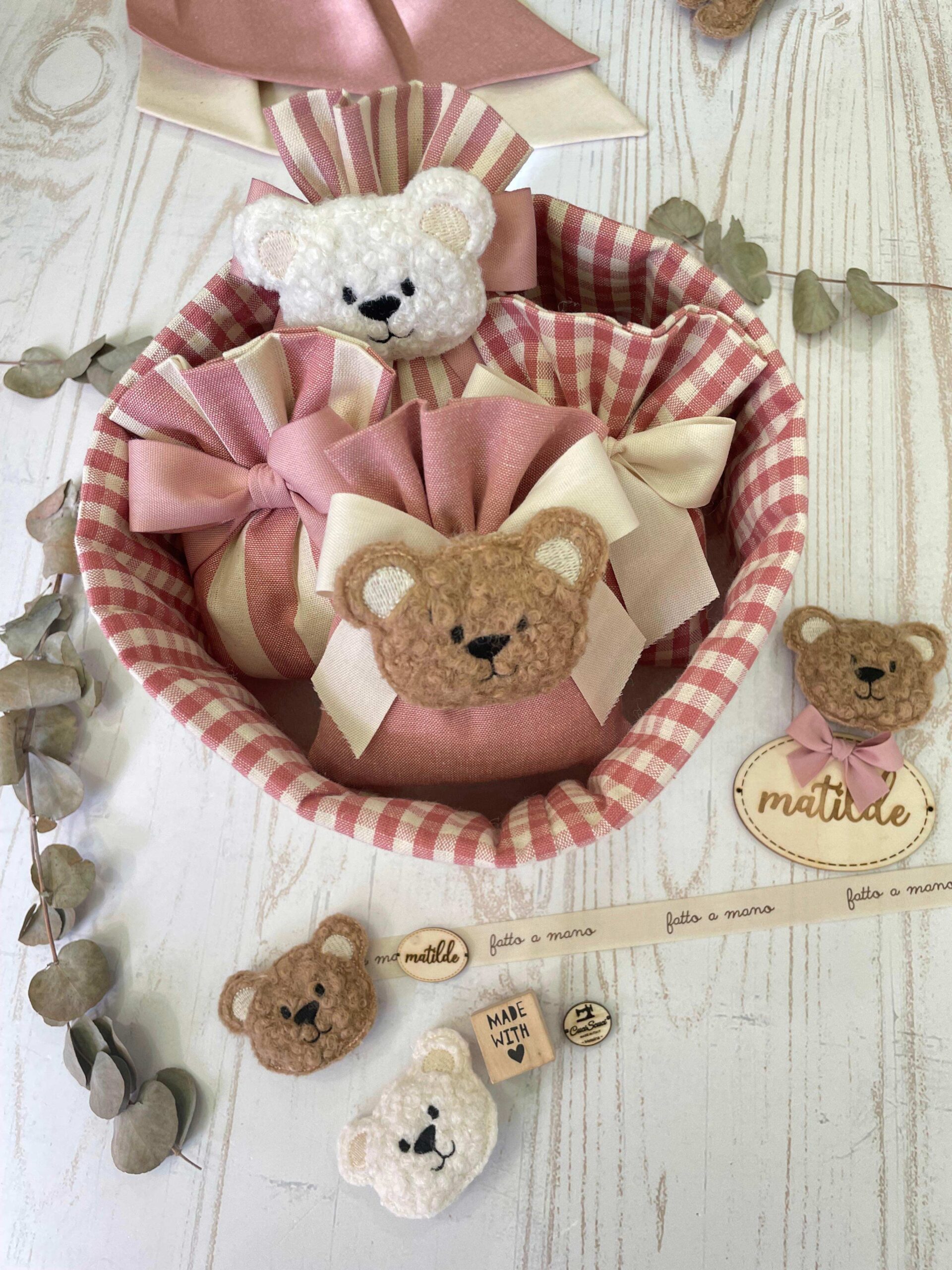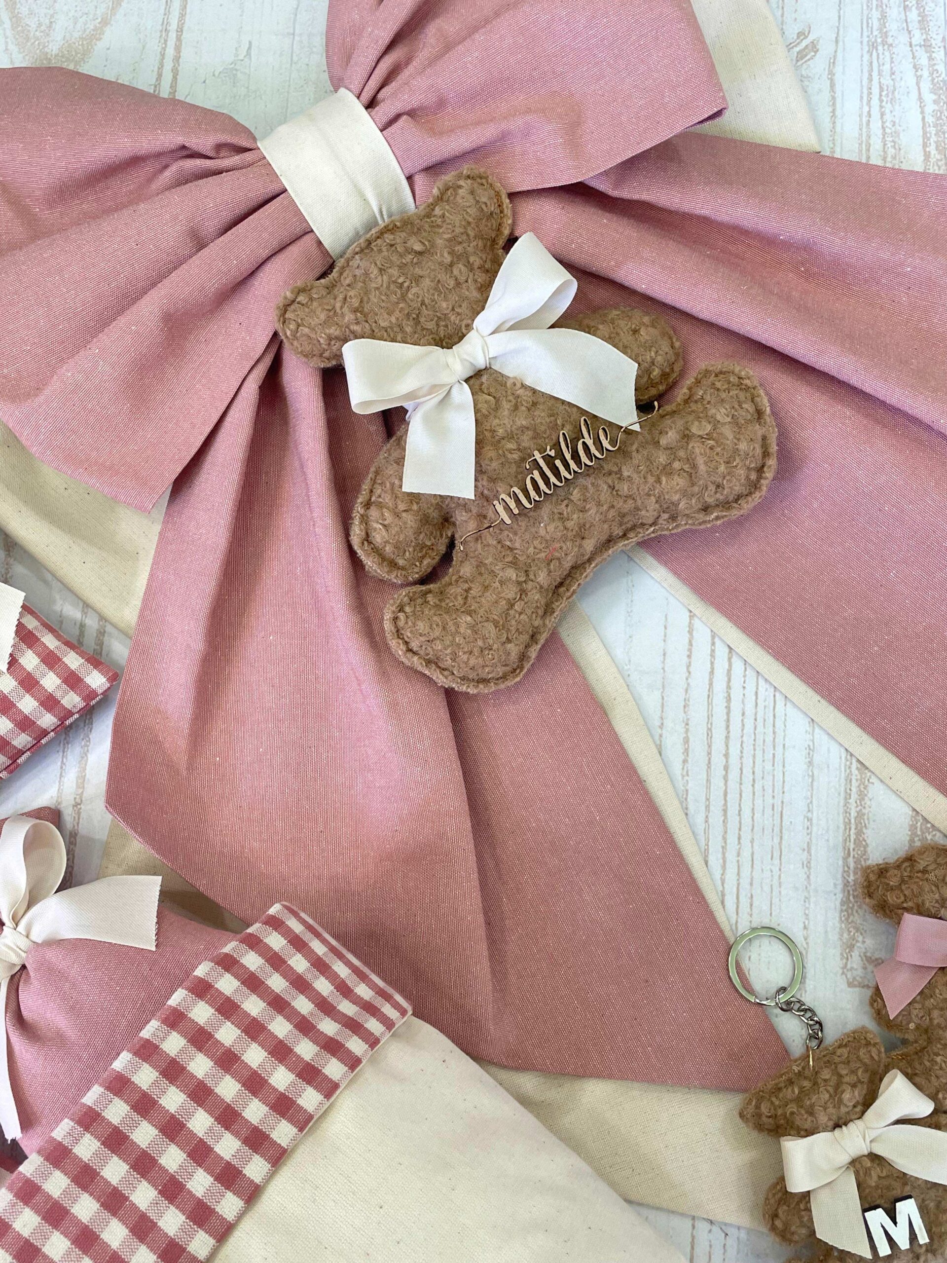 - Sacchetto sartoriale, confezionato con confetti (con orsetto o targhetta in legno personalizzata)