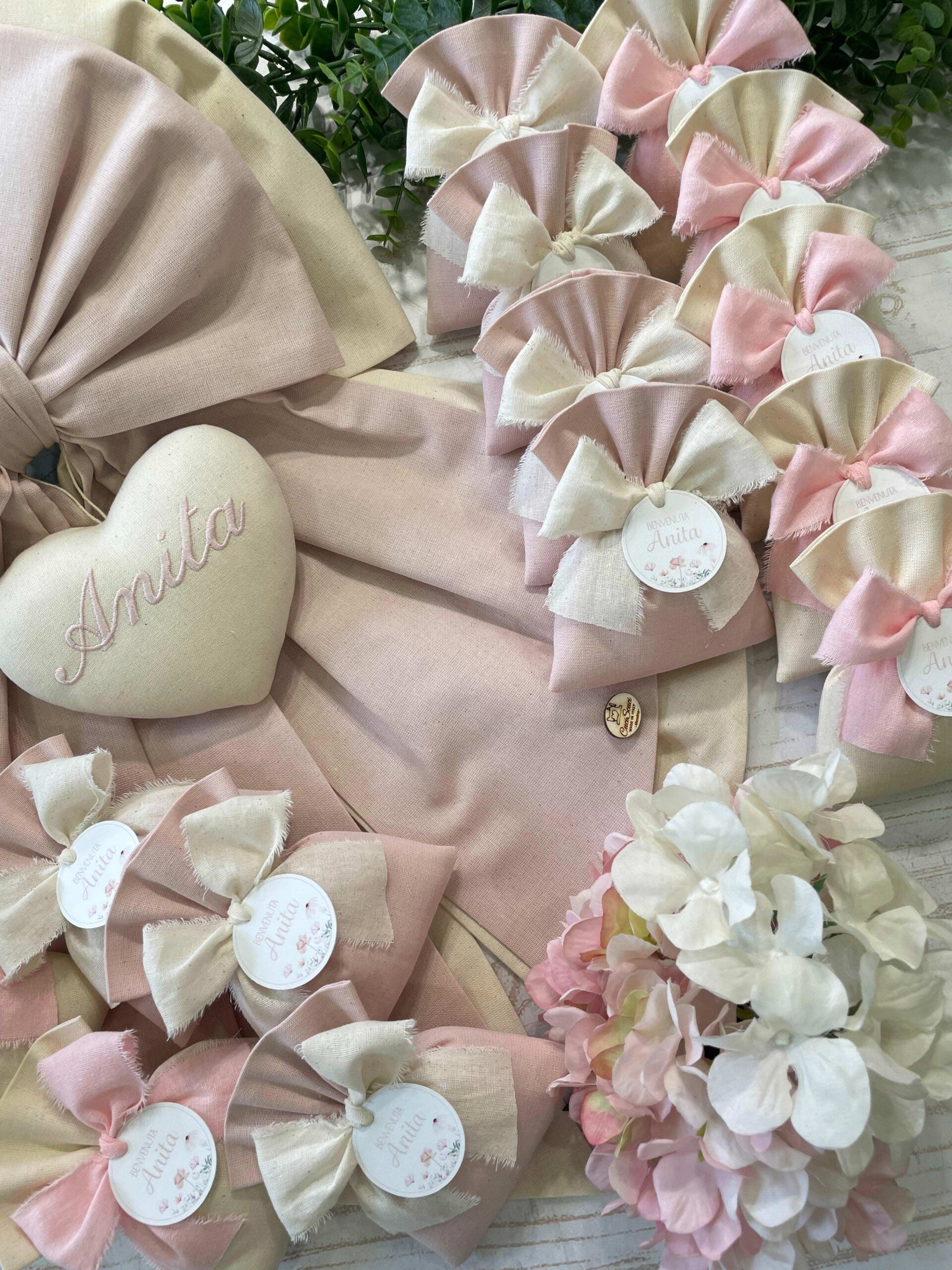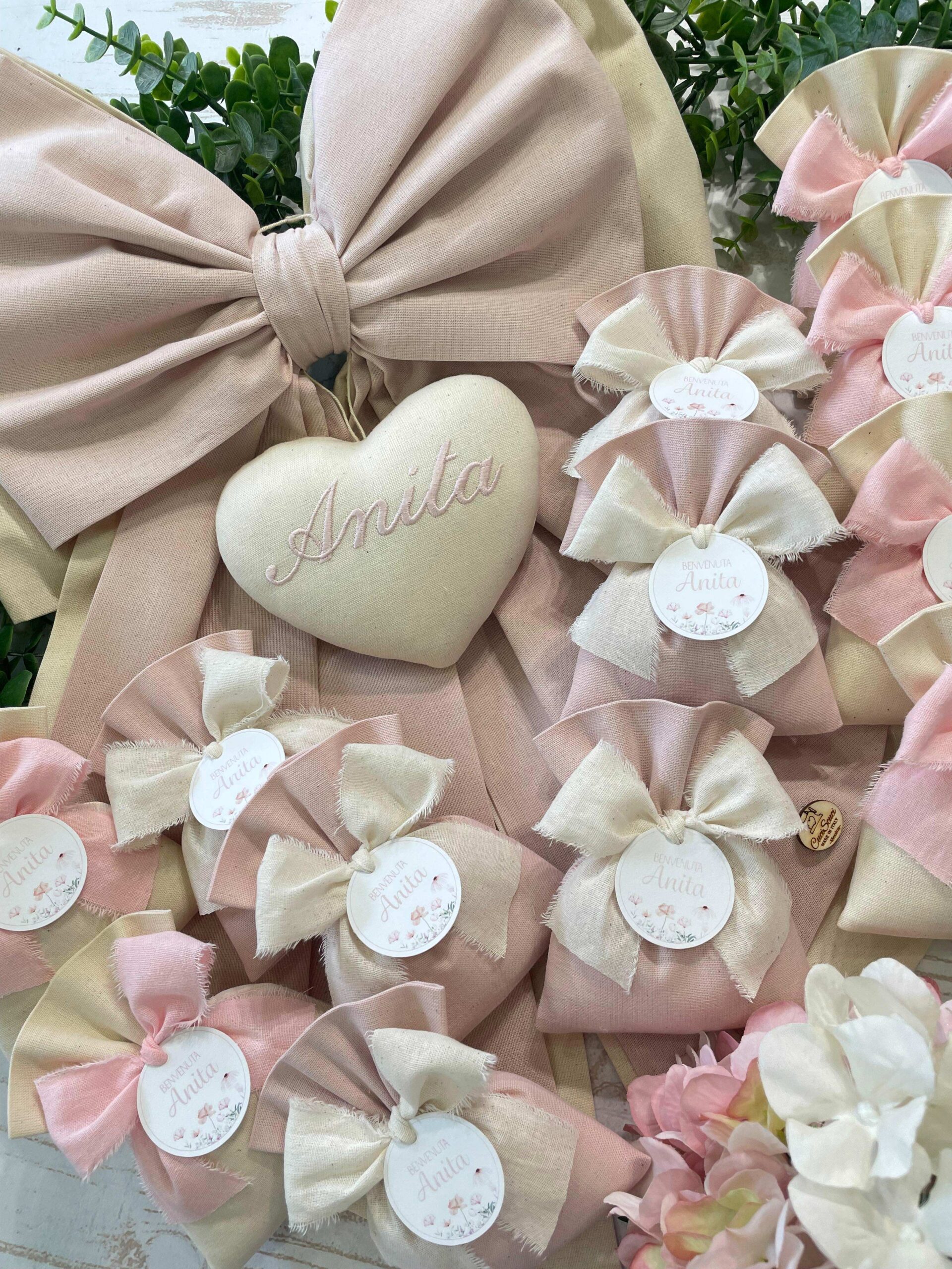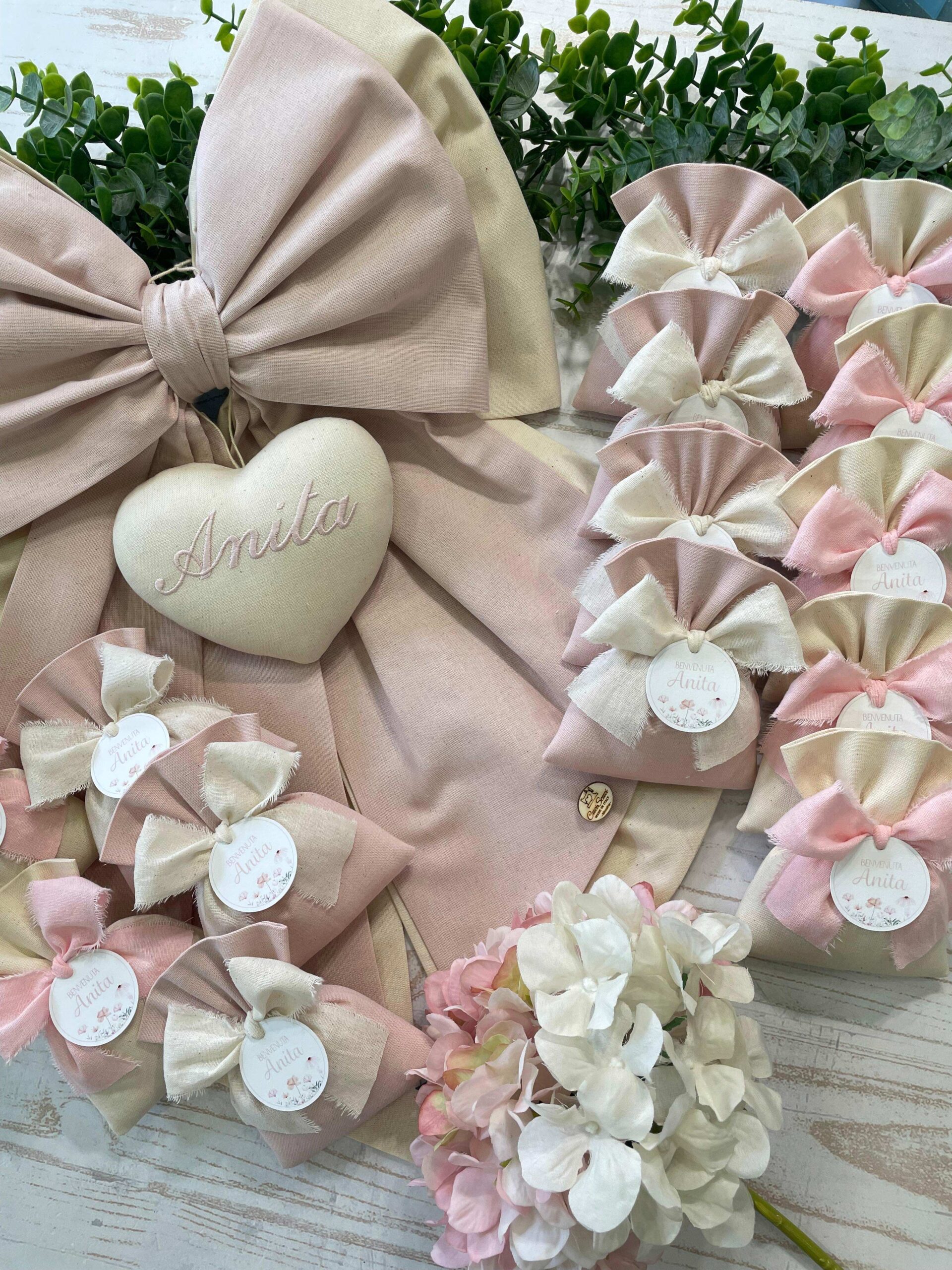 • Sacchetto sartoriale, realizzato in due tonalità in tinta unita, rosa cipria e panna, arricchito da tag personalizzato. Una bomboniera raffinata e coordinata, perfetta per completare l’allestimento nascita.