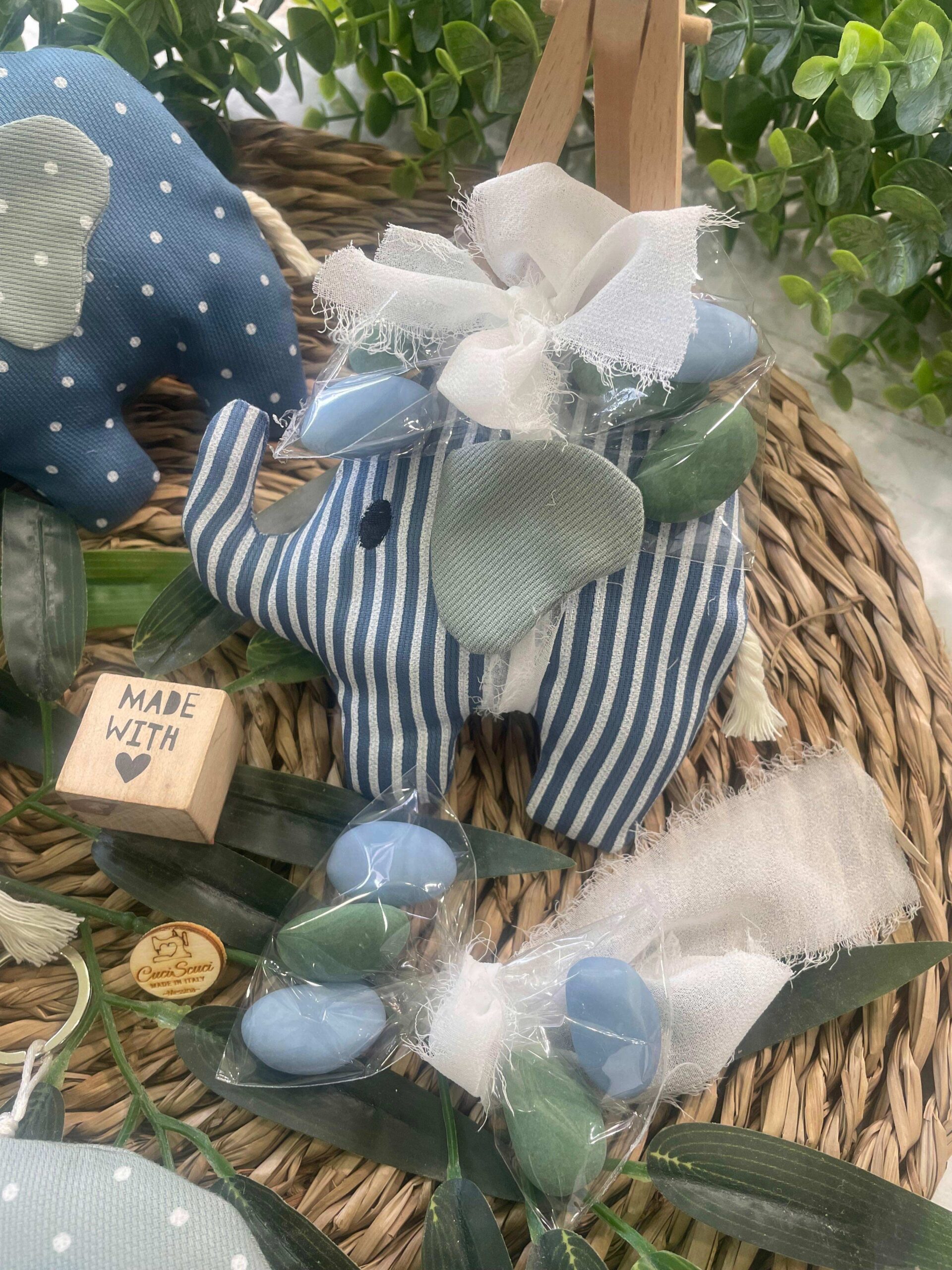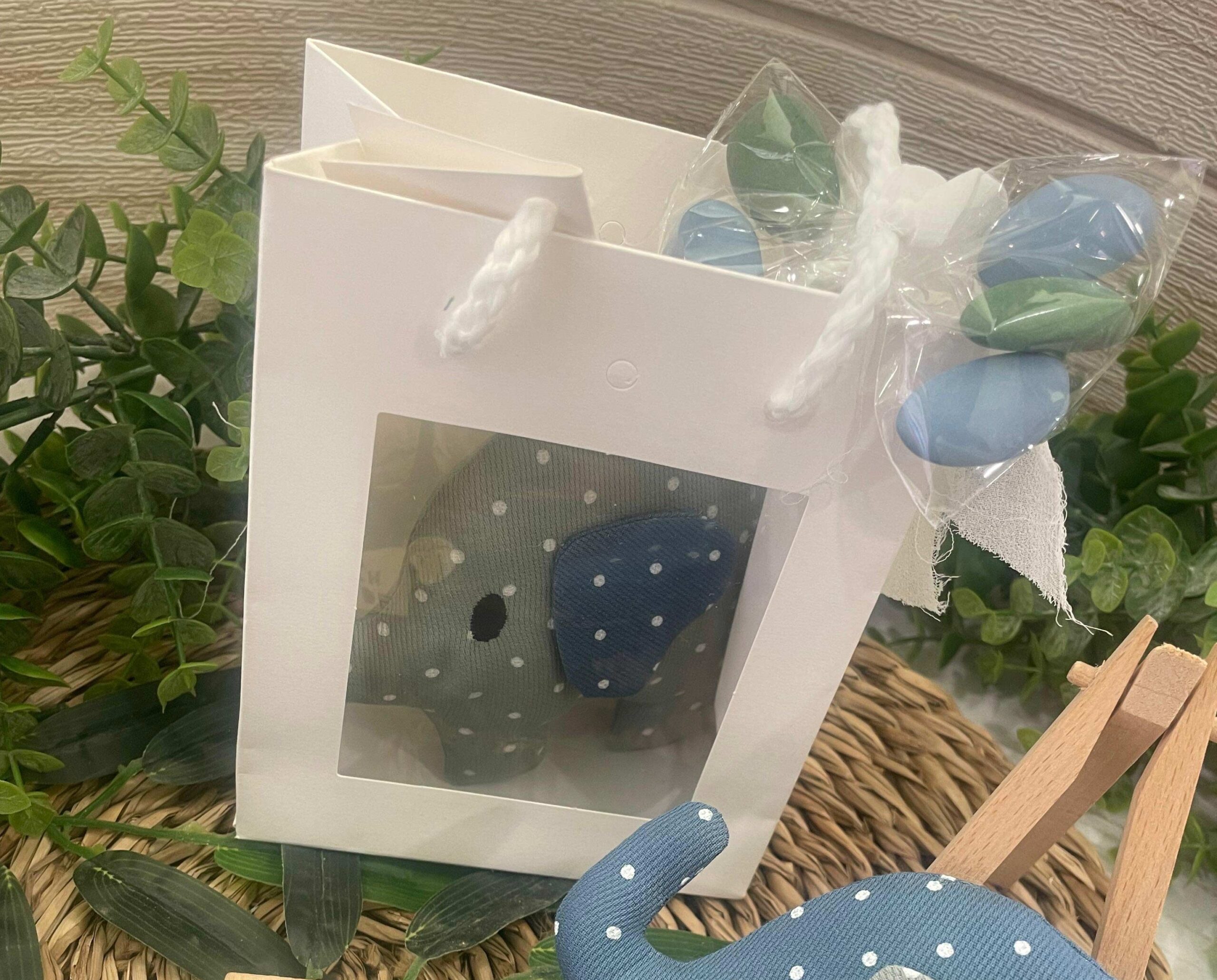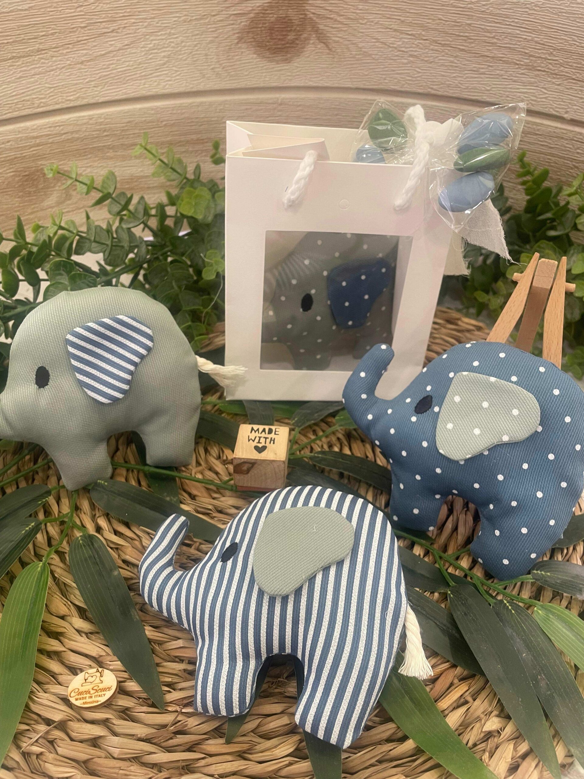 • Elefantino + shopper – elefantino con piccola shopper, papillon realizzato con bustina trasparente porta confetti e 5 confetti in busta sigillata