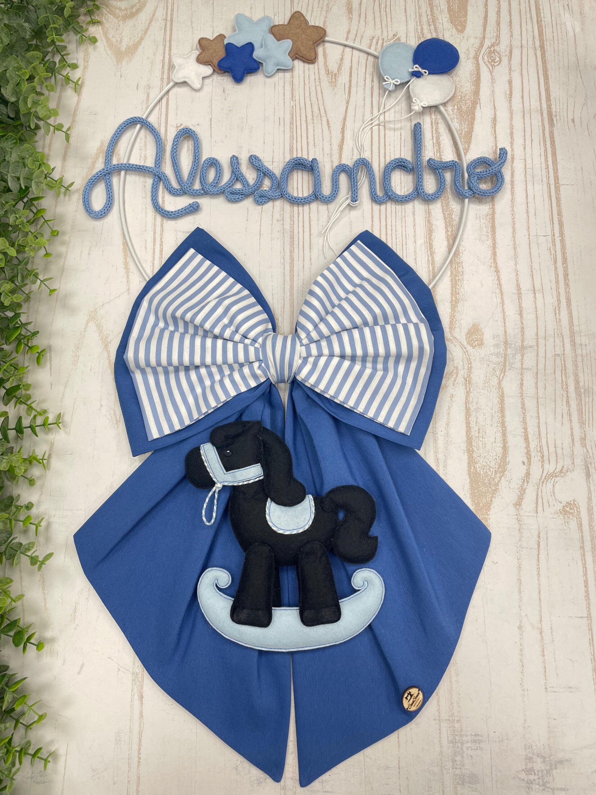 Fiocco Nascita Azzurro con Nome in Tricotin e Cavallo a Dondolo Blu