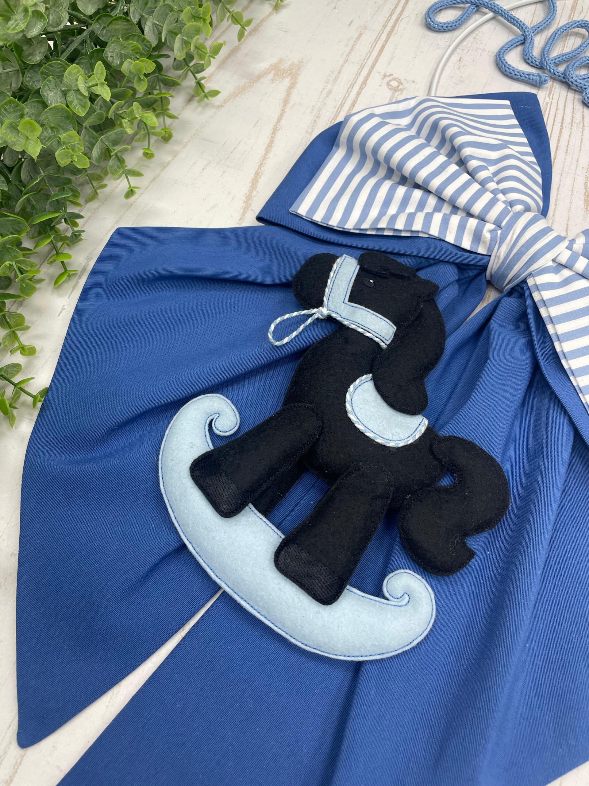 Dal fiocco pende un tenero cavalluccio a dondolo blu in pannolenci tridimensionale.