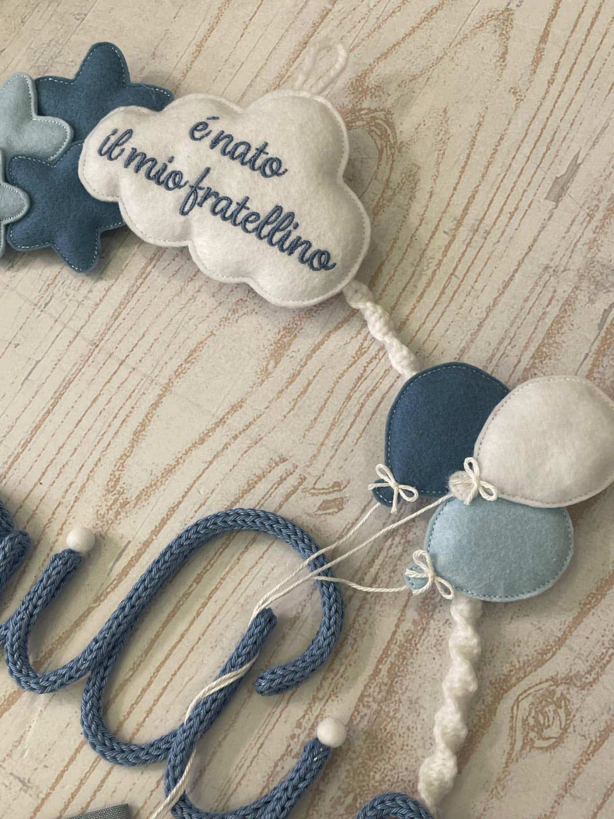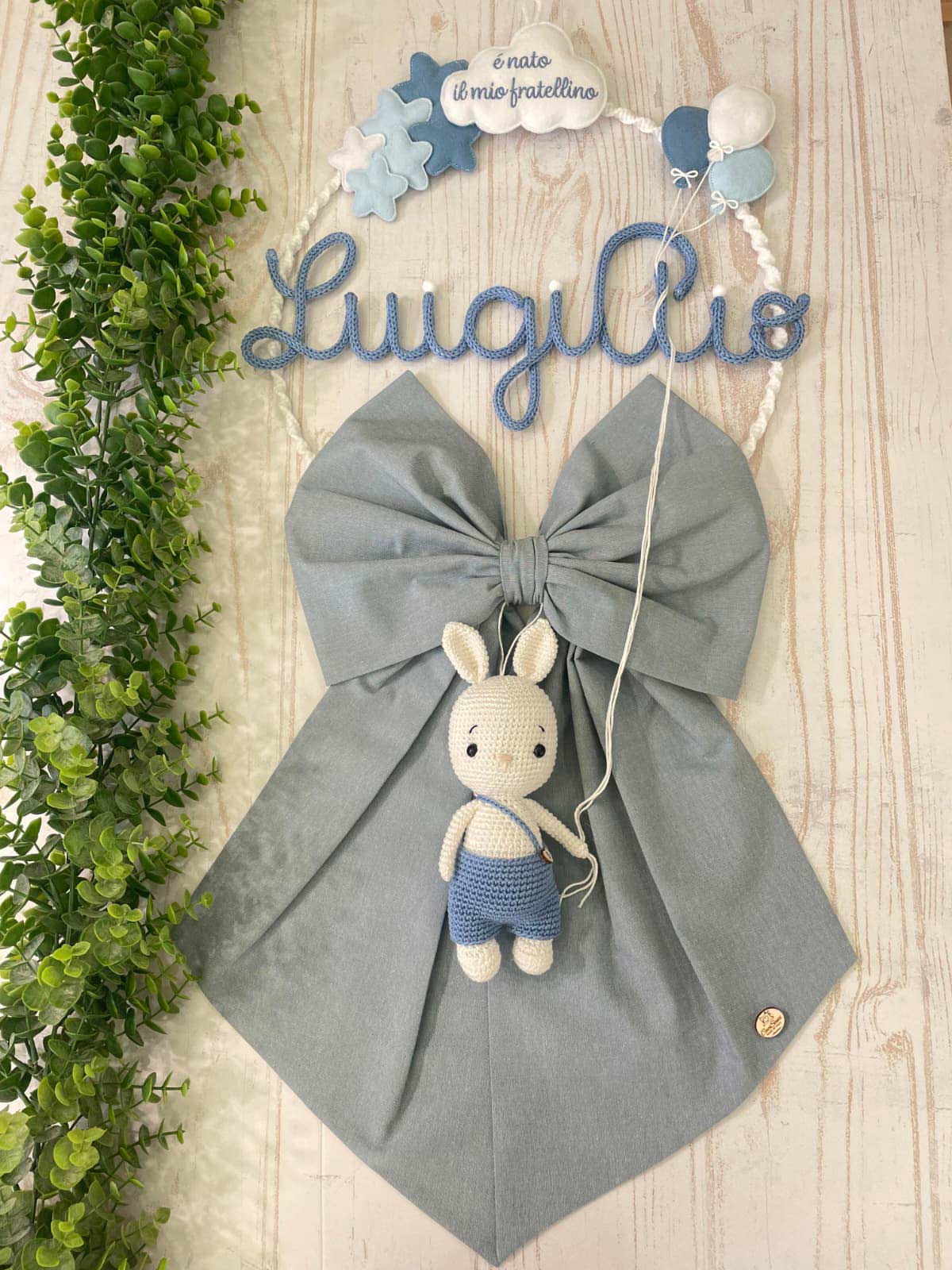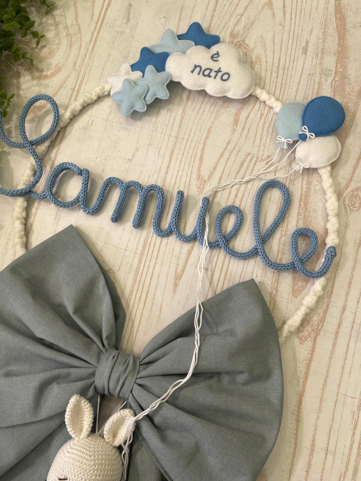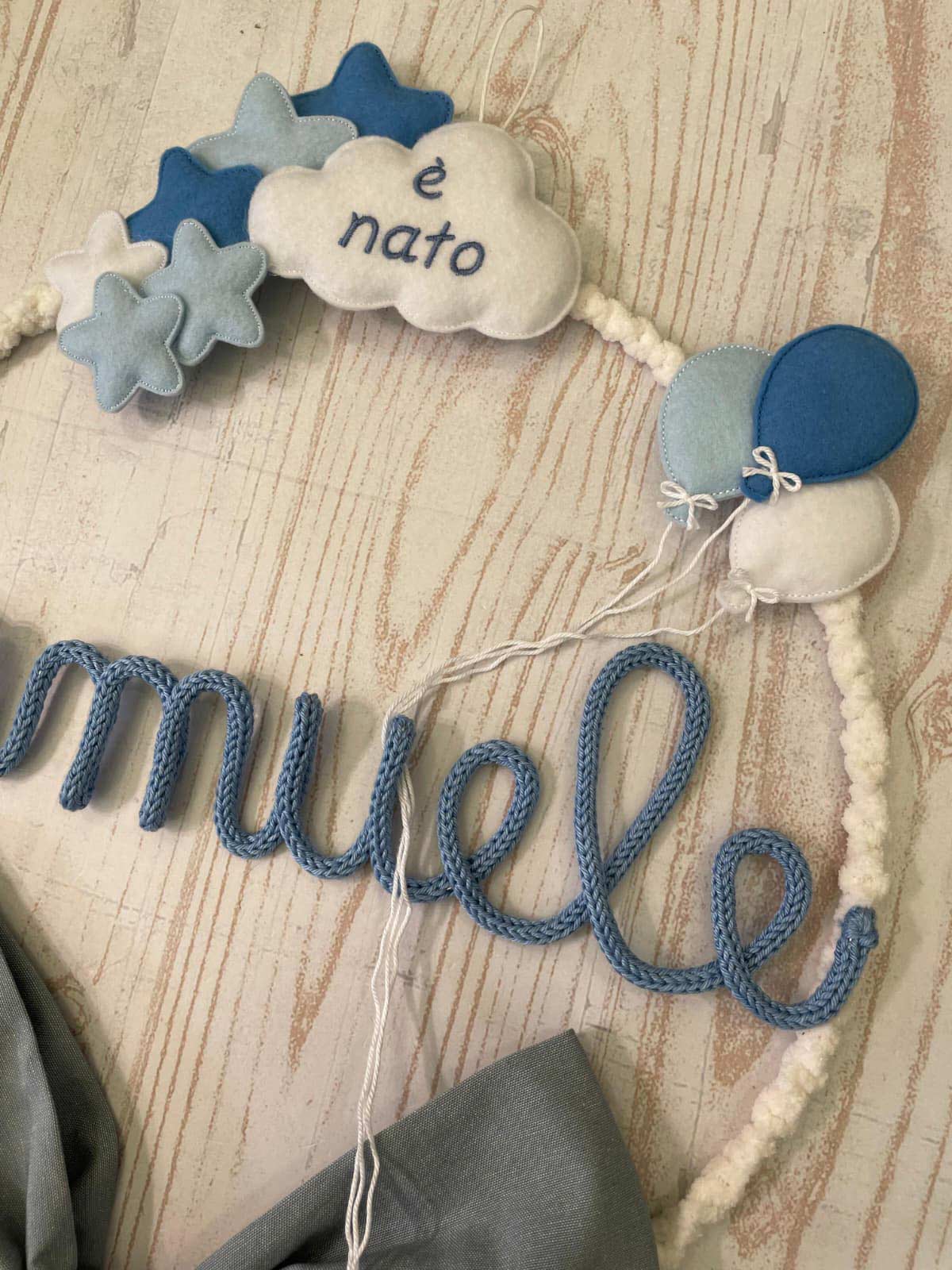 Al centro il nome del bimbo in tricotin celeste.