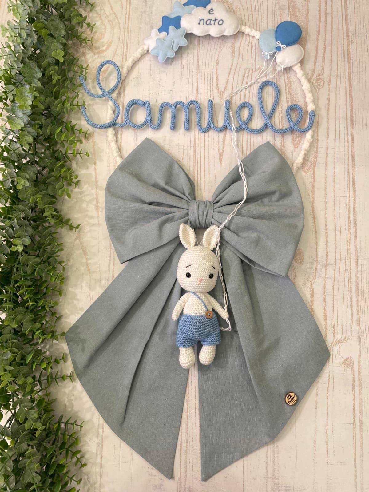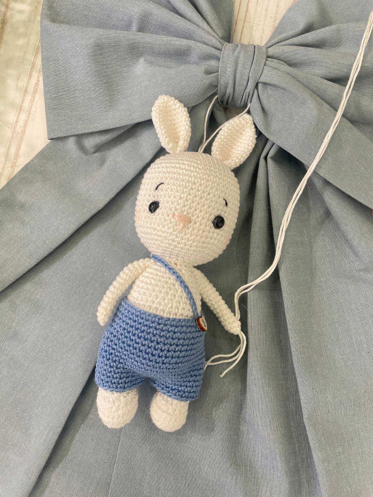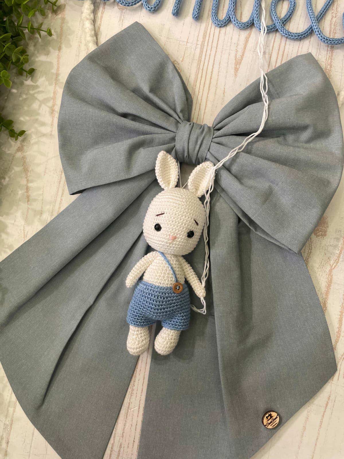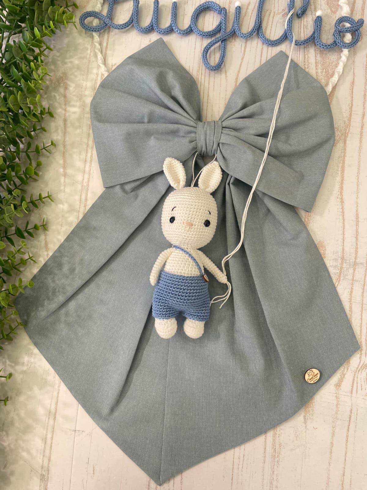 Dal fiocco pende un tenero coniglietto realizzata con la tecnica amigurumi.