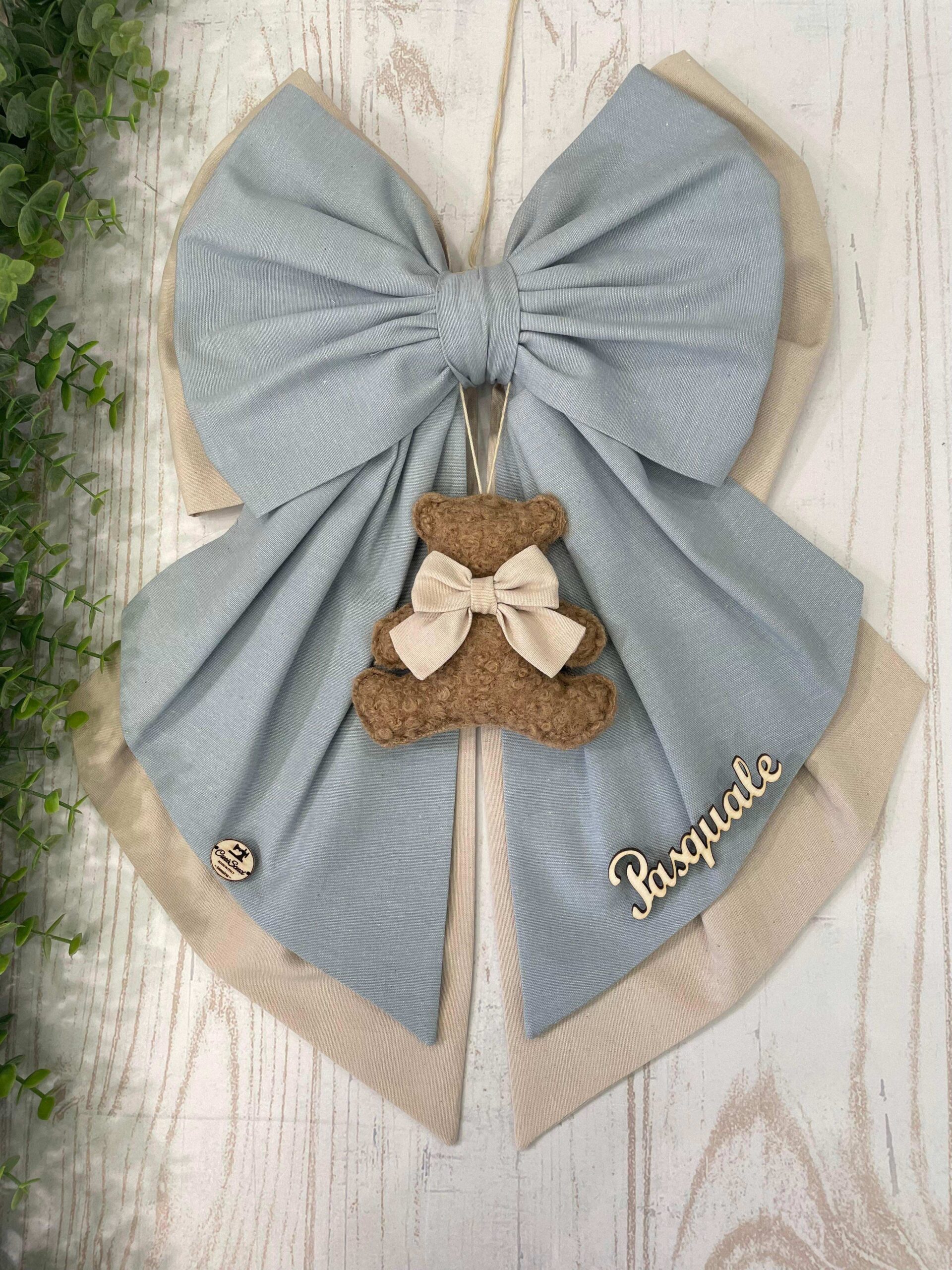 In una coda del fiocco è applicato il nome del bimbo in legno.