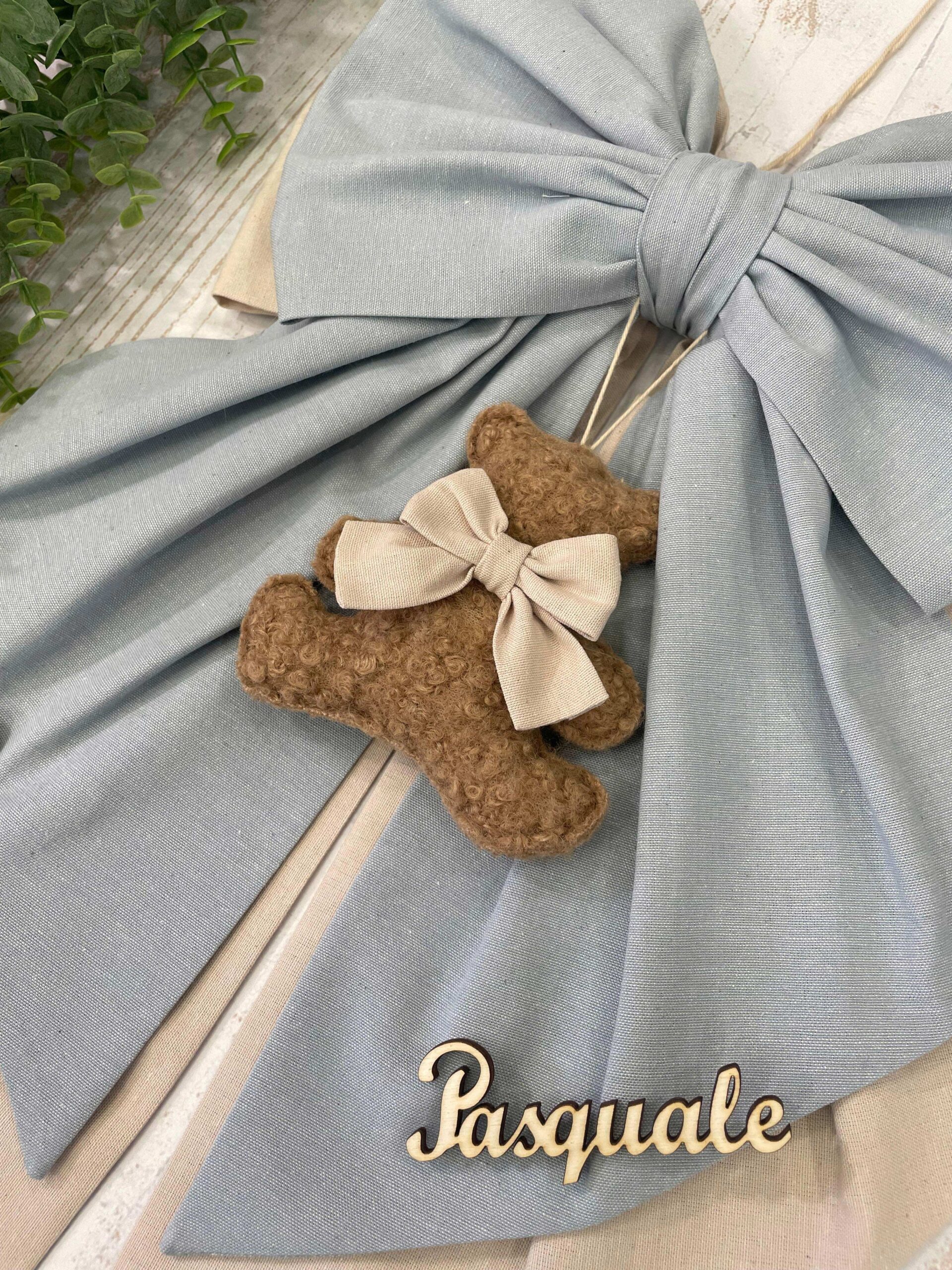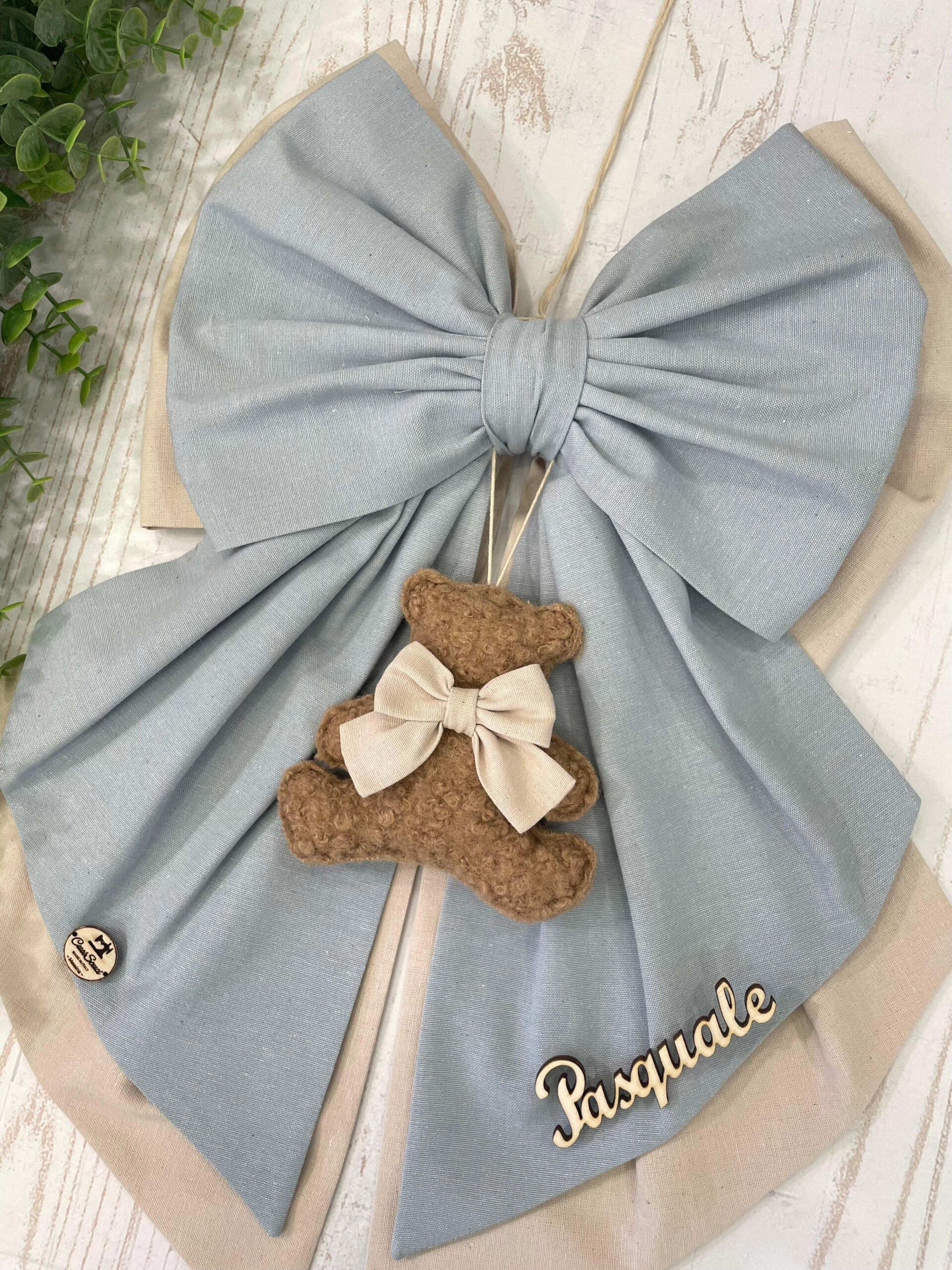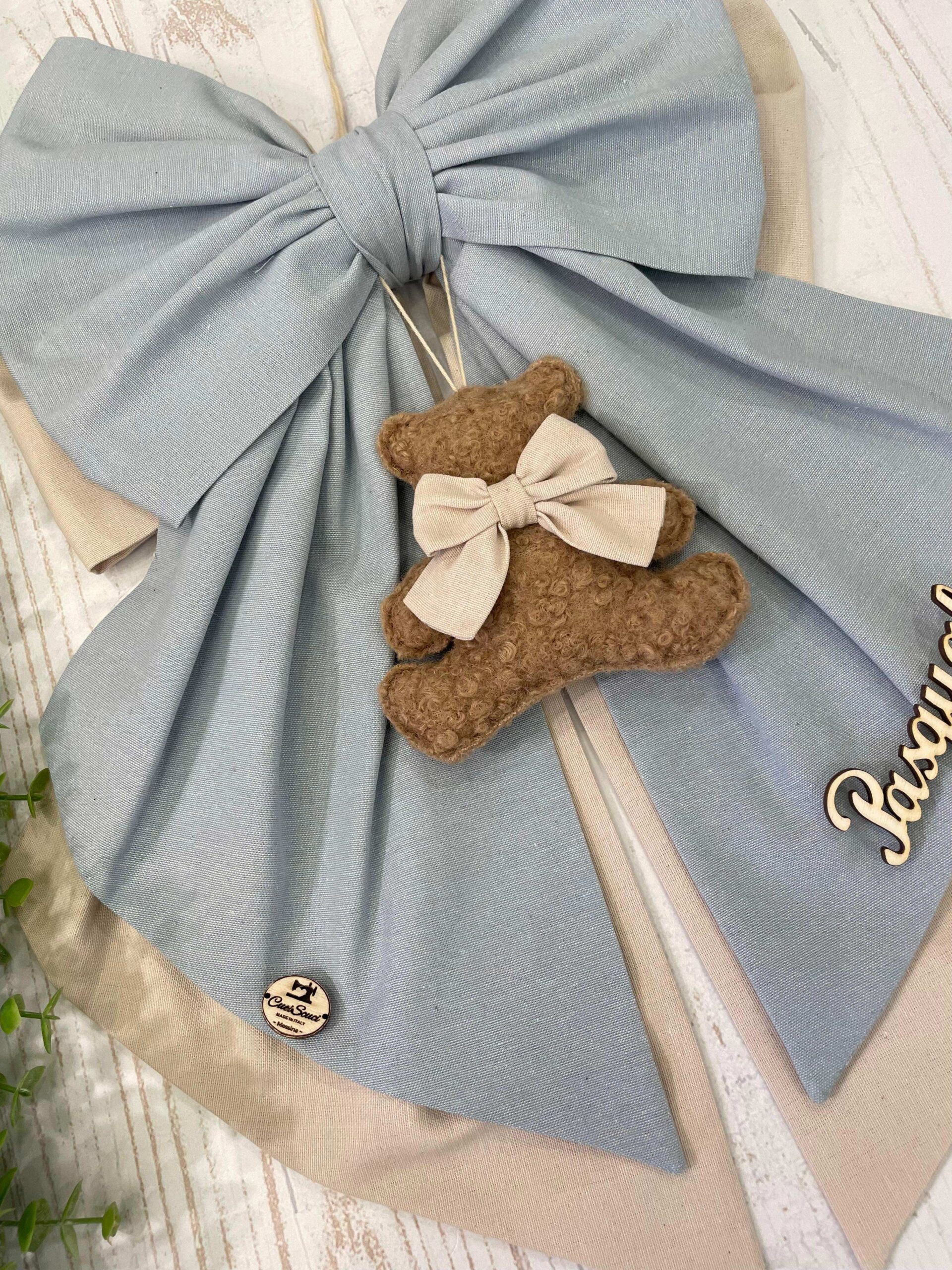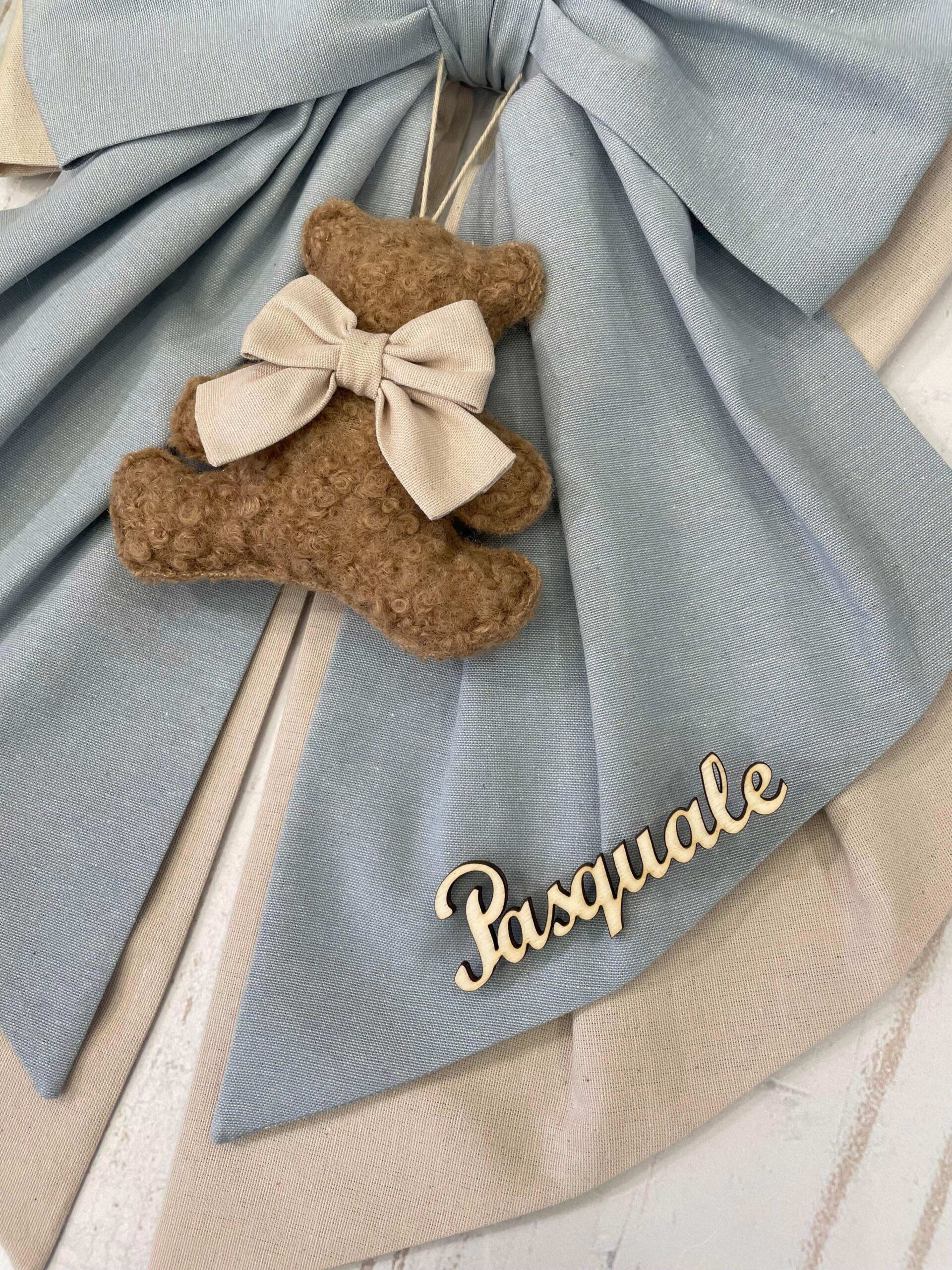 Dal fiocco pende un orsetto in tessuto bouclè