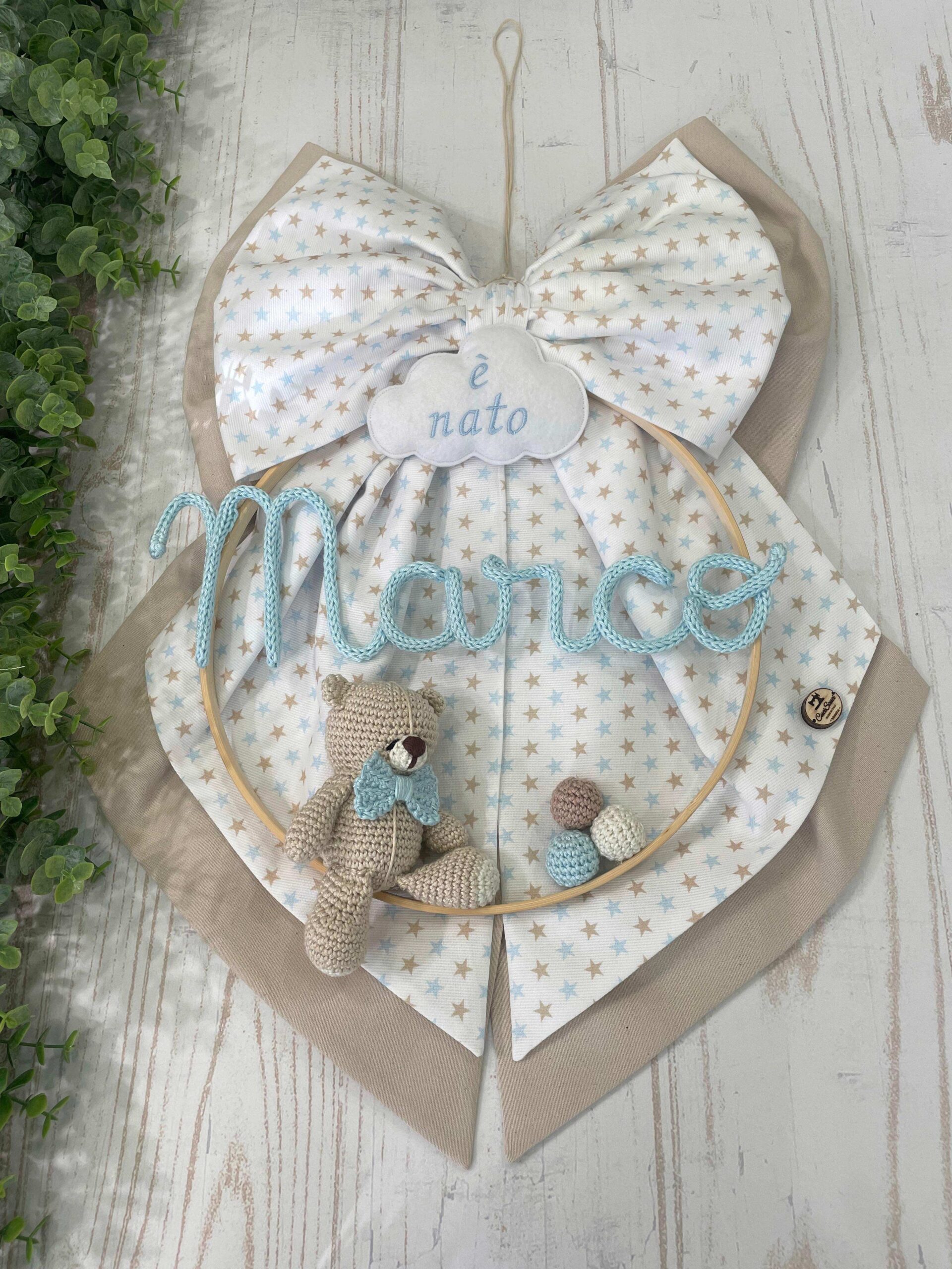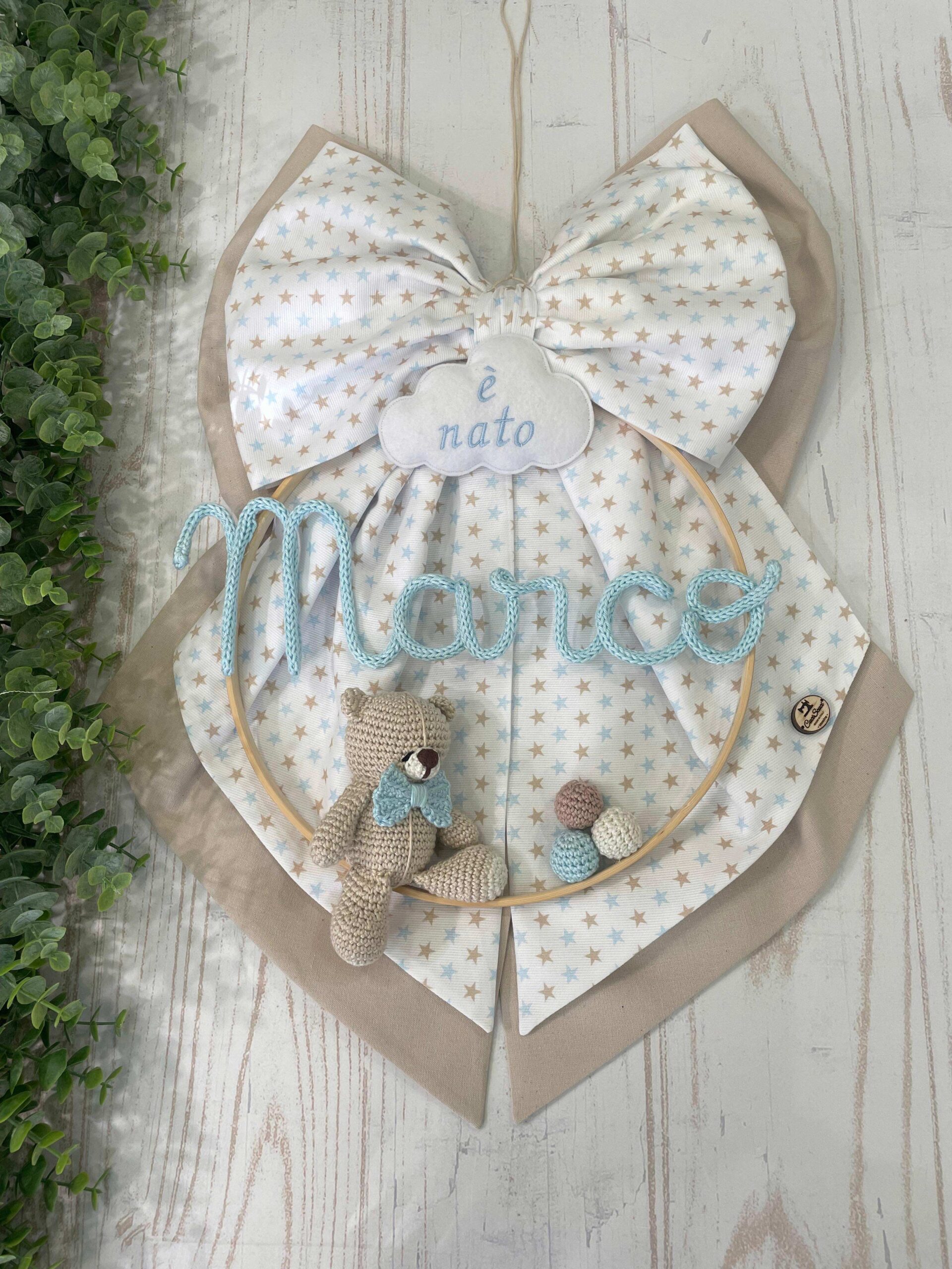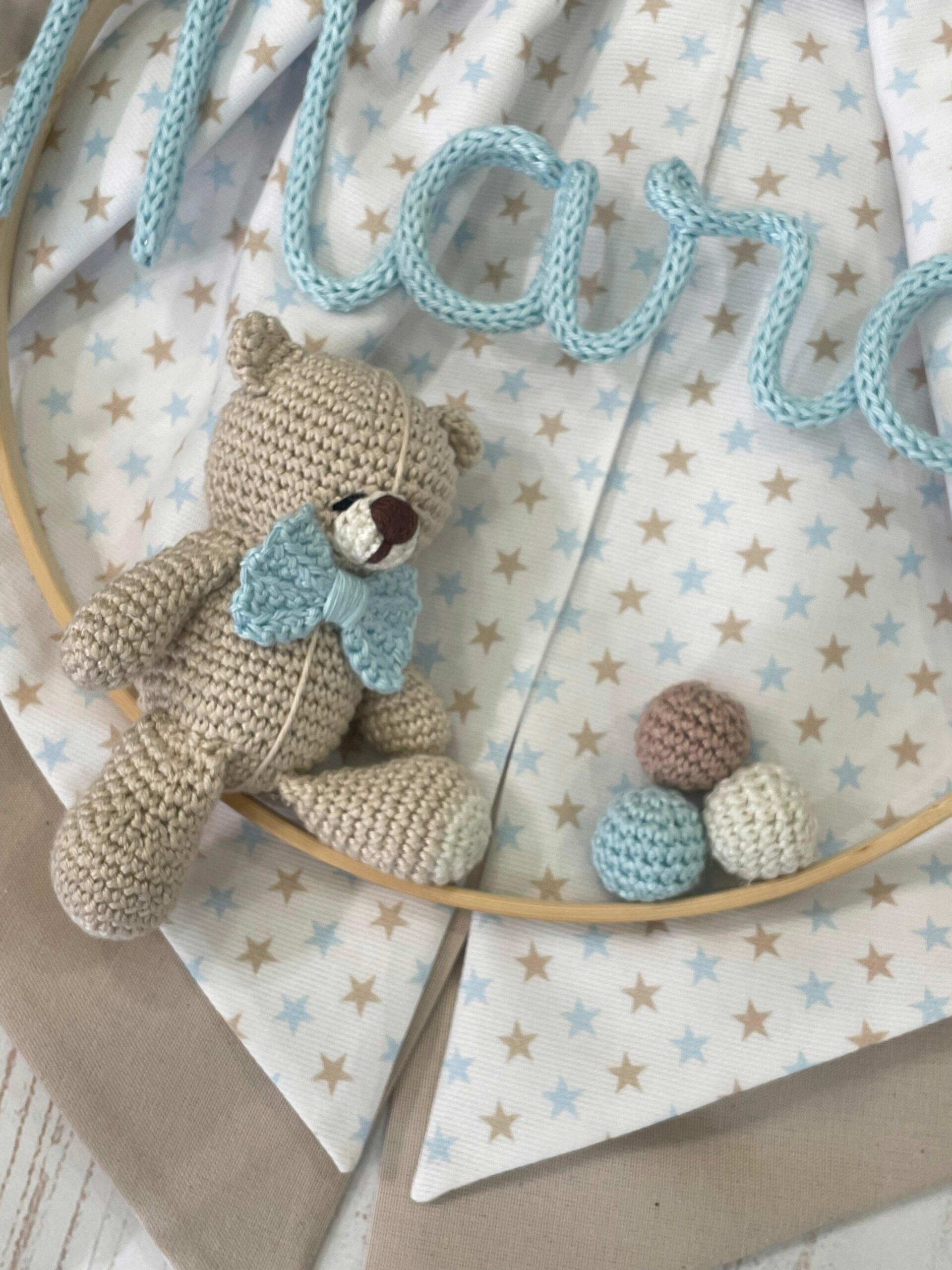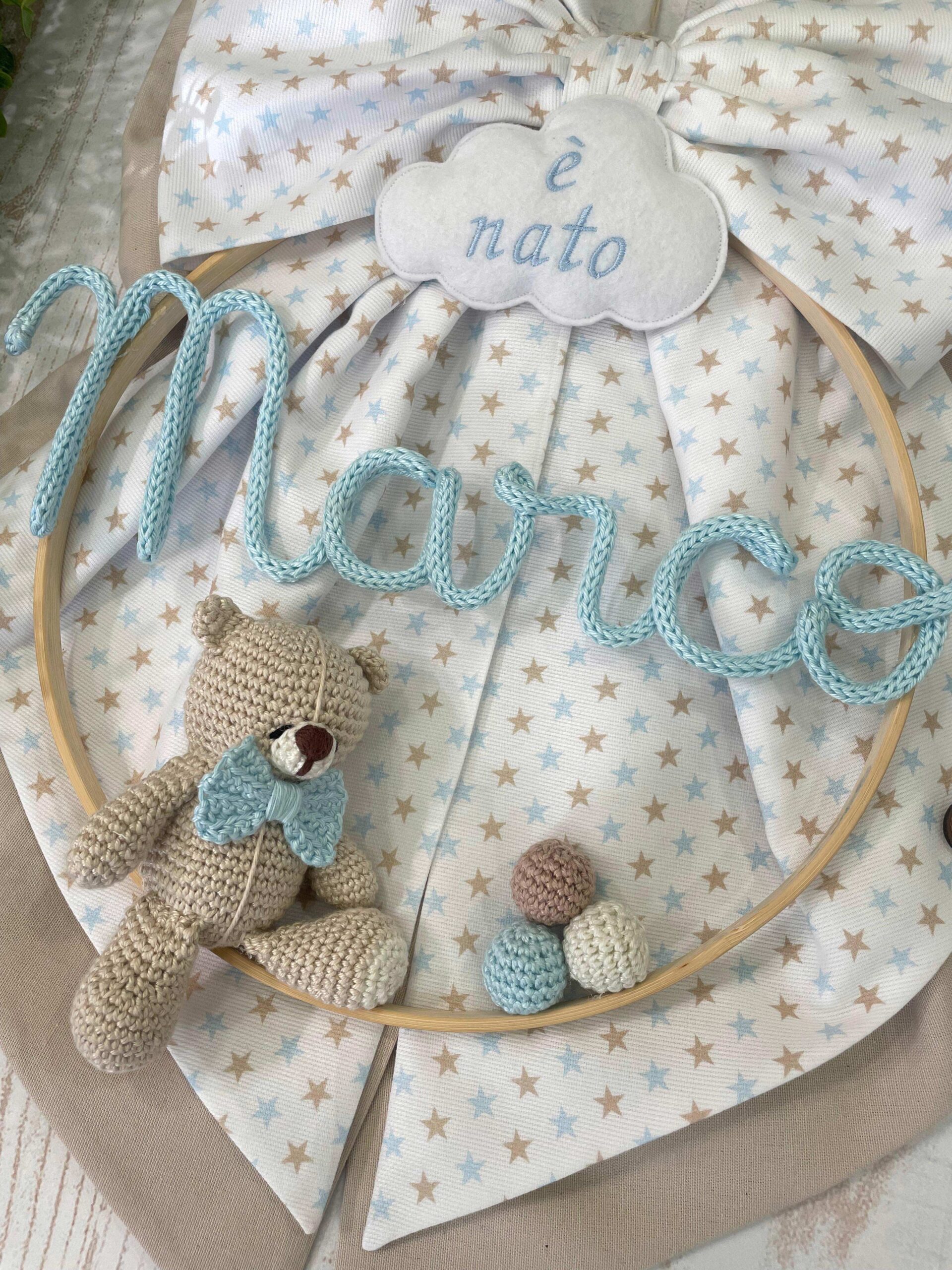 Dal fiocco pende un telaio con nome in tricotin celeste e un orsetto in amigurumi.