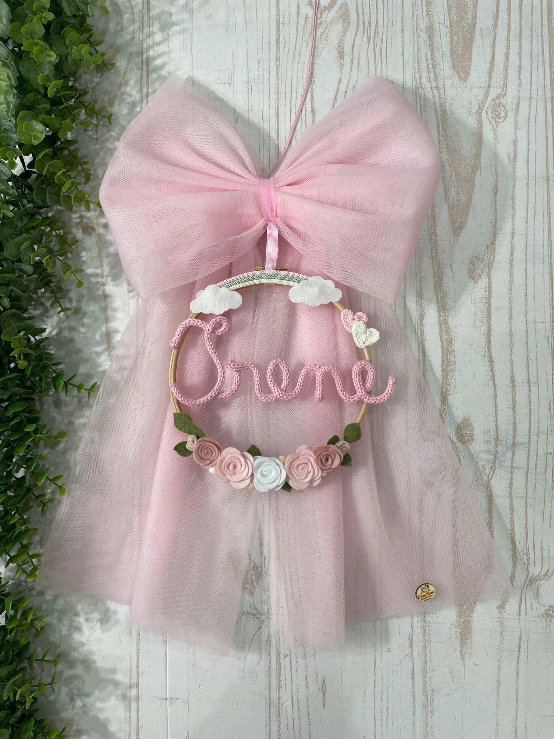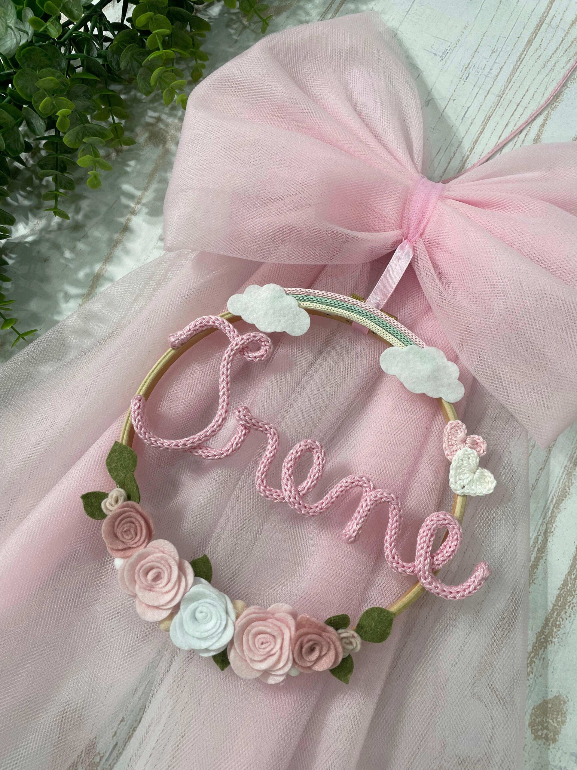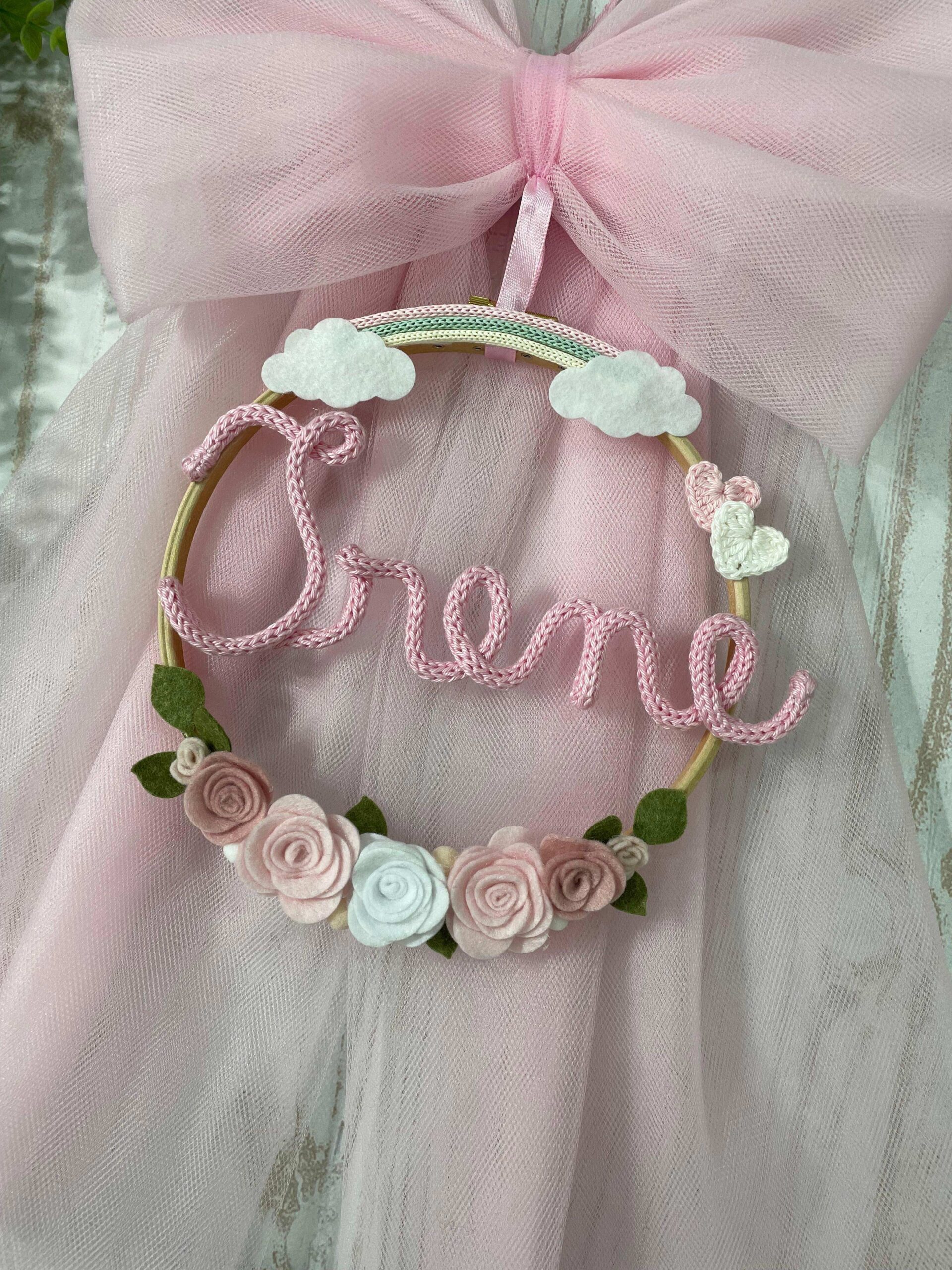Dal fiocco pende un mini telaio in legno decorato con rose in pannolenci, arcobaleno e cuori in crochet e al centro il nome in tricotin rosa della bimba.