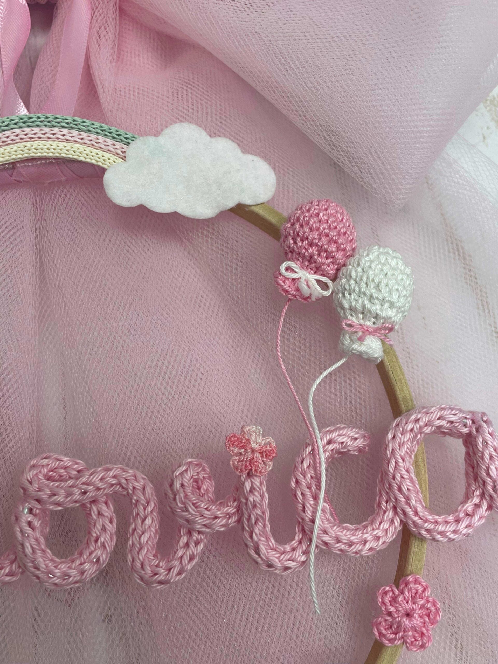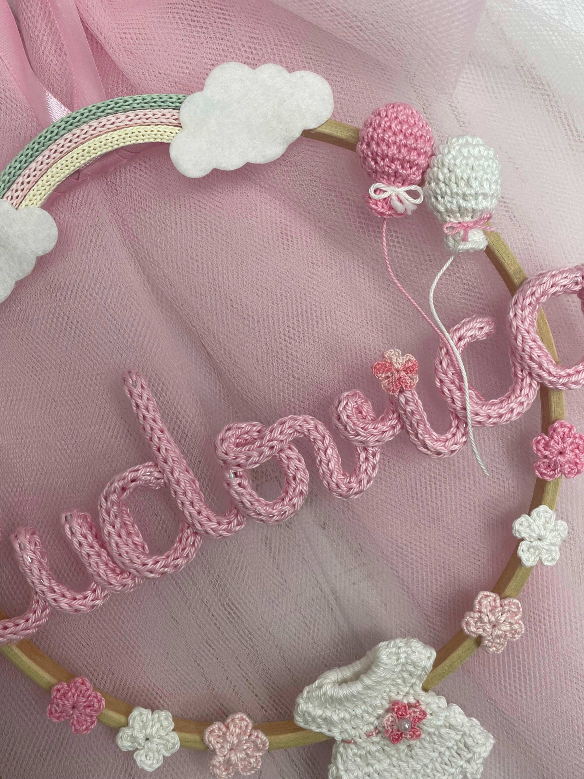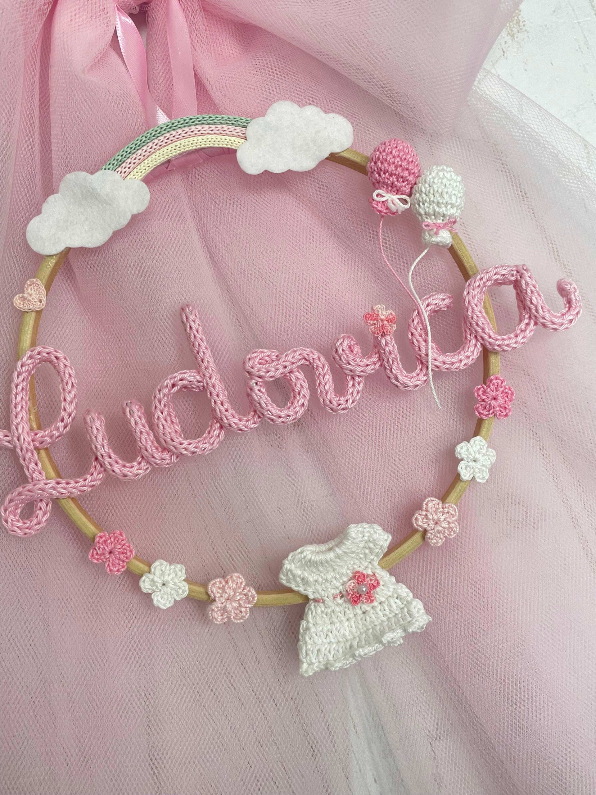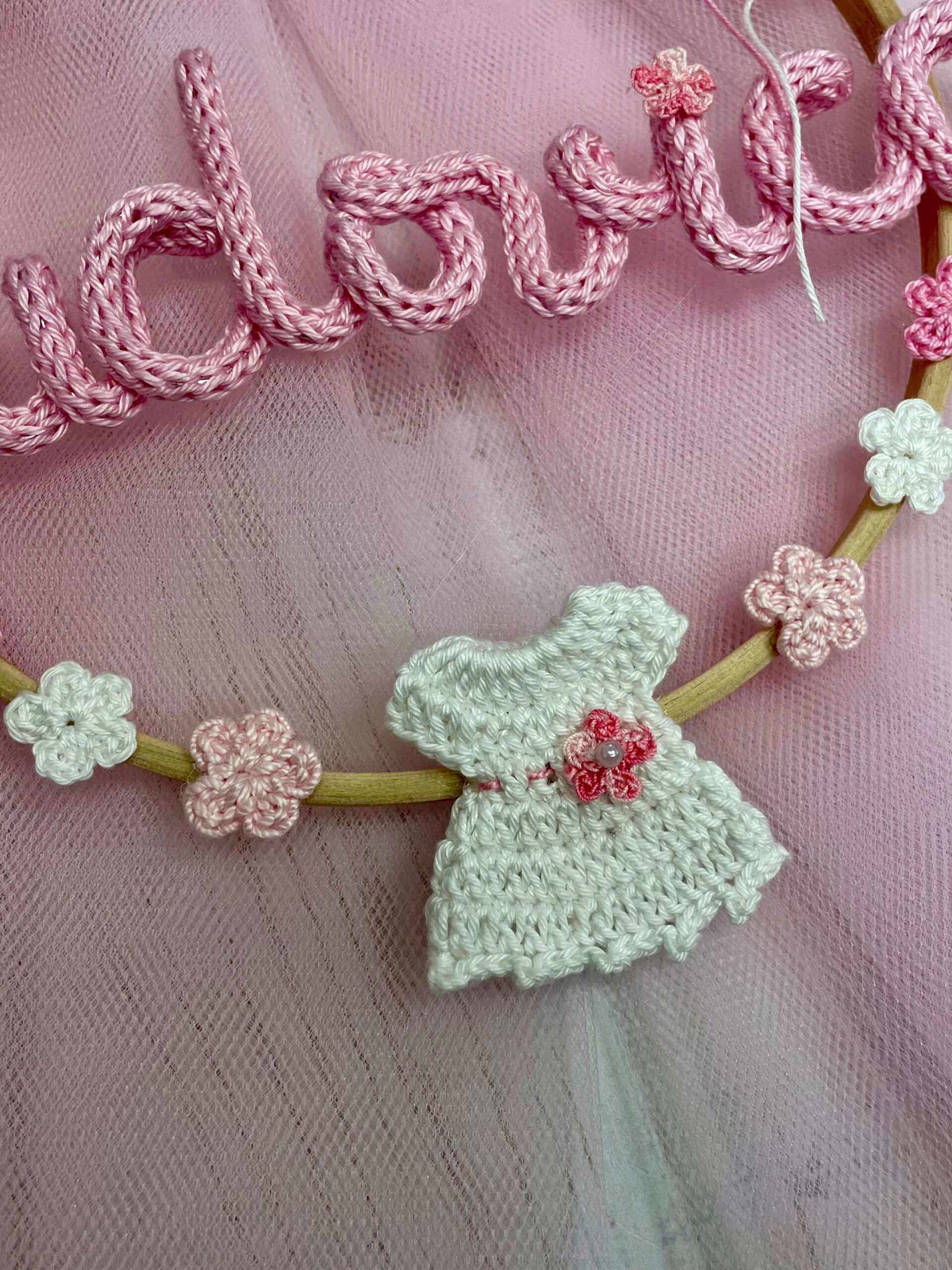 Dal fiocco pende un mini telaio in legno arricchito da decori in crochet, con al centro il nome della bimba in tricotin rosa (personalizzabile).