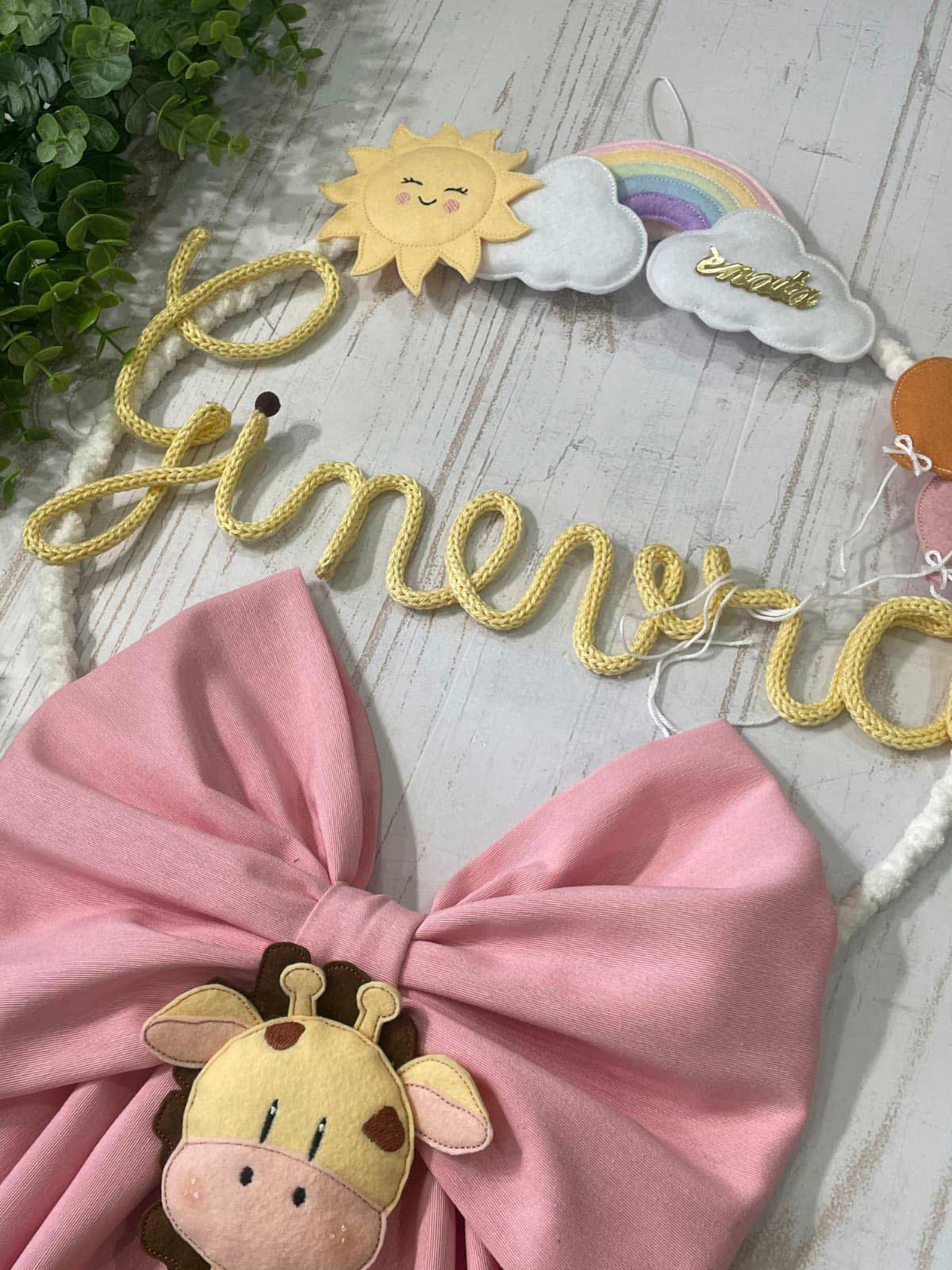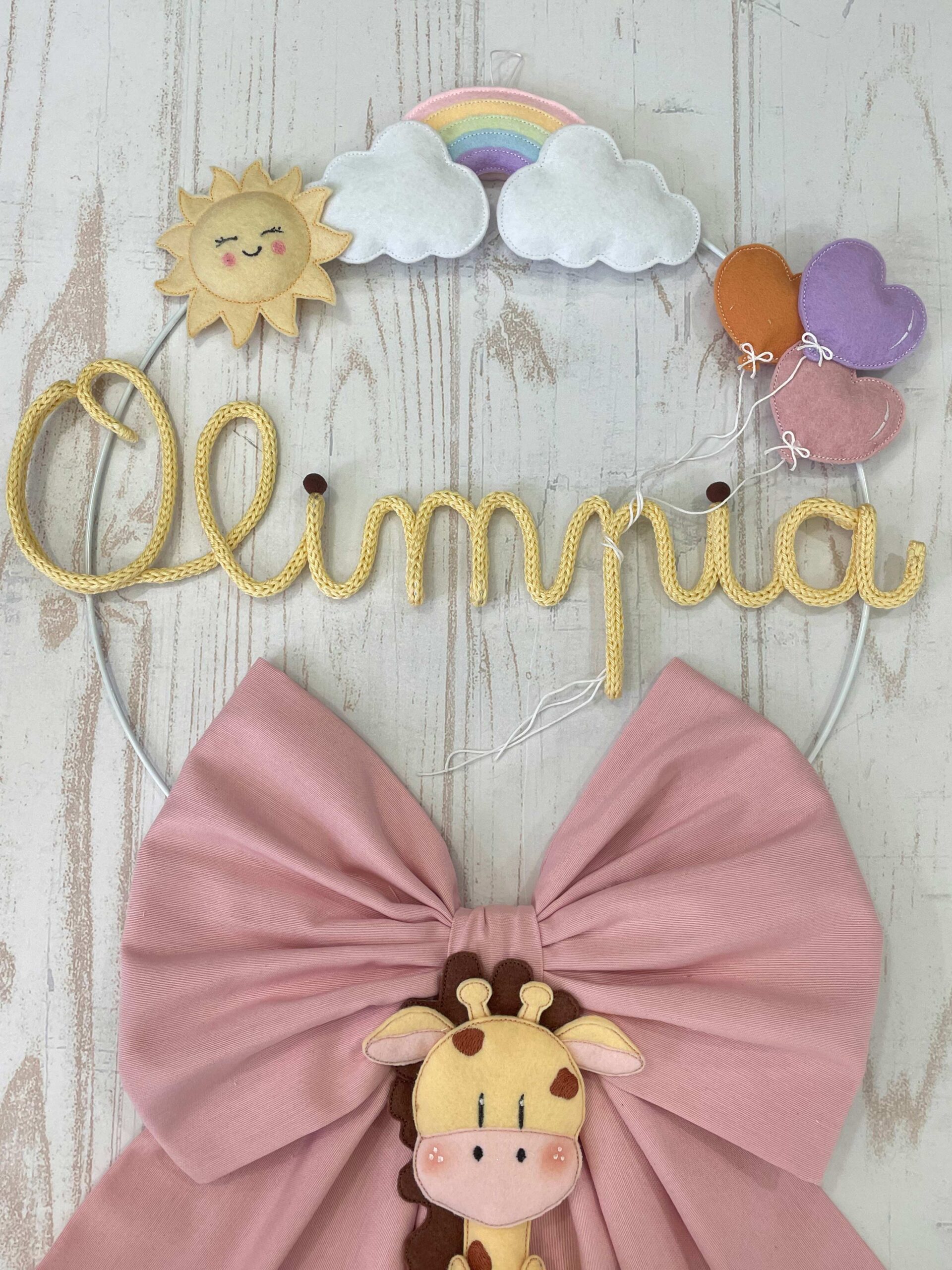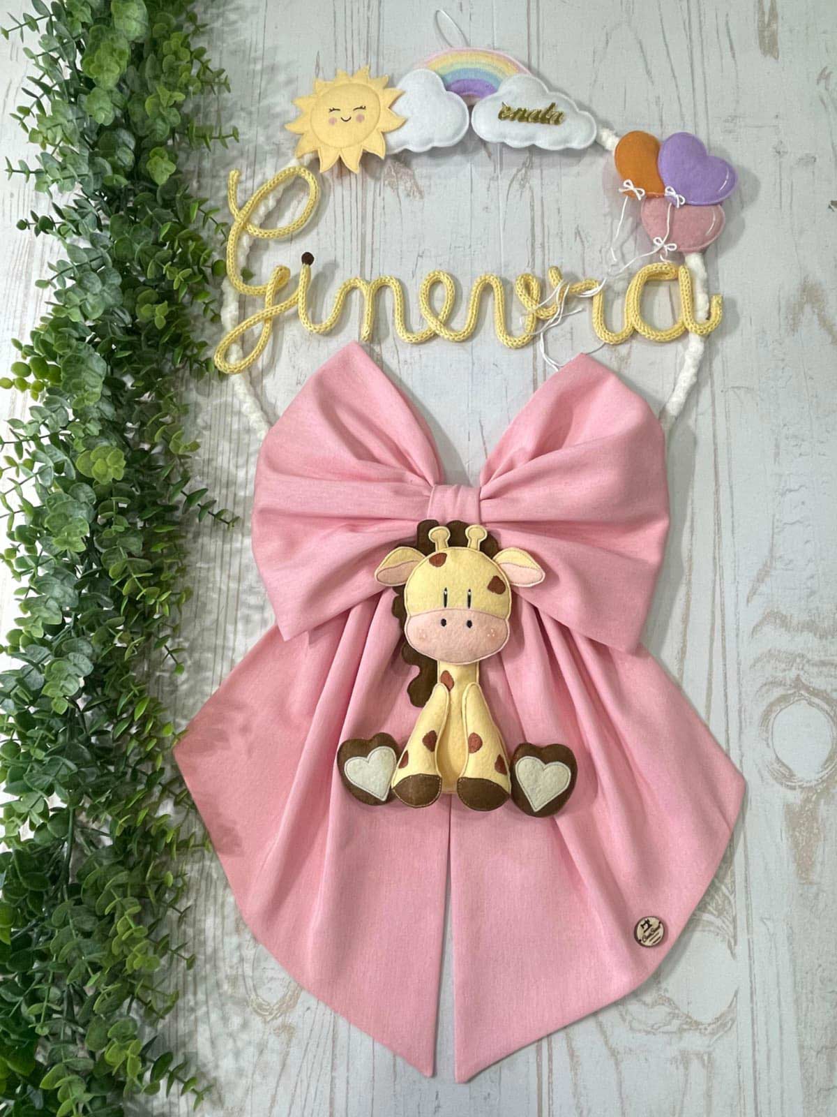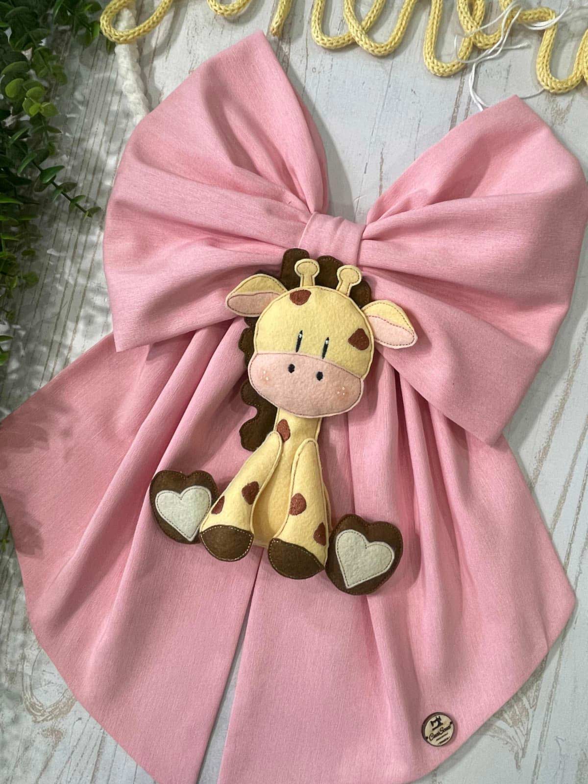 Dal fiocco pende una tenera giraffa in pannolenci tridimensionale.