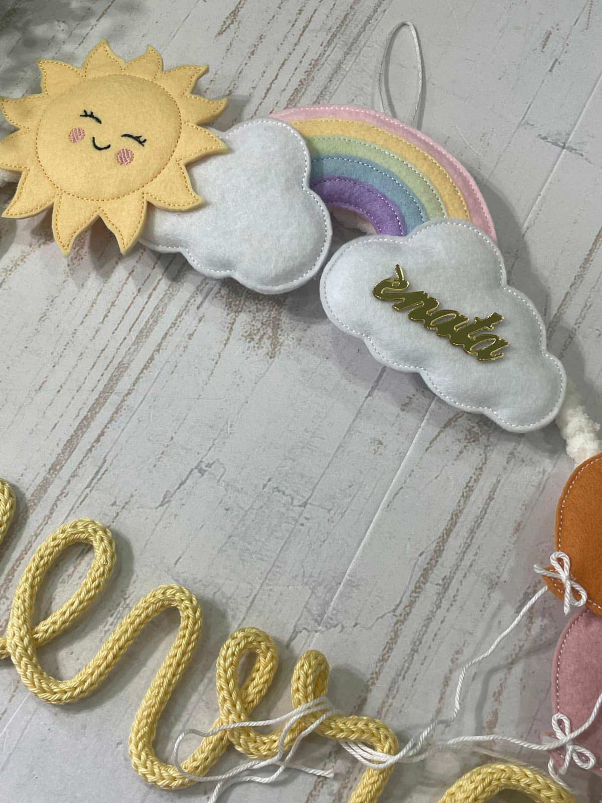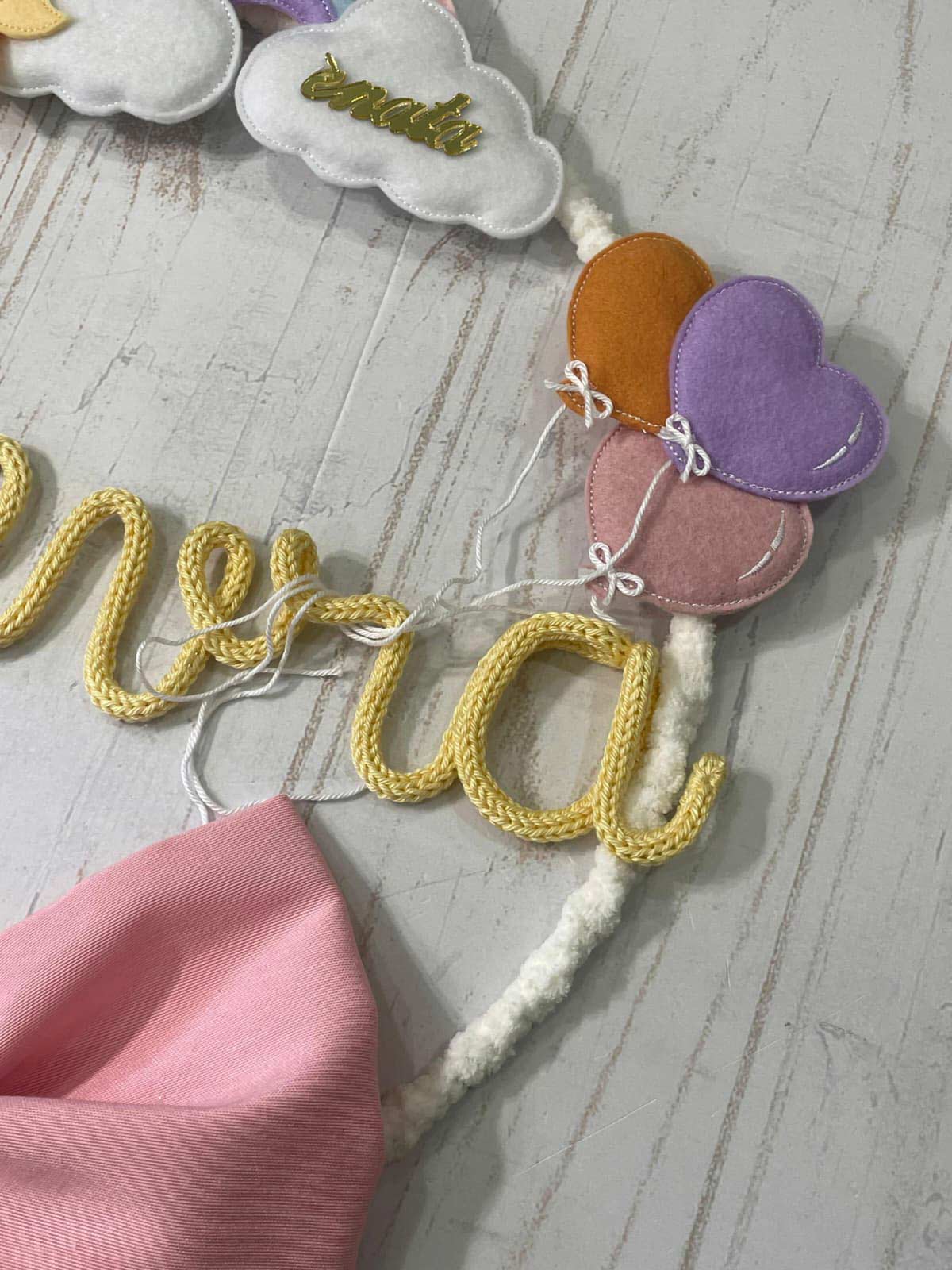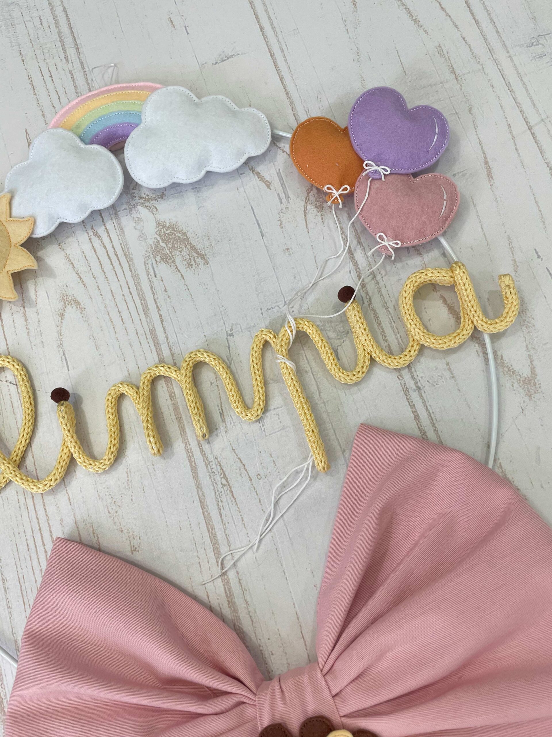 Al centro il nome della bimba in tricotin, colore a scelta.