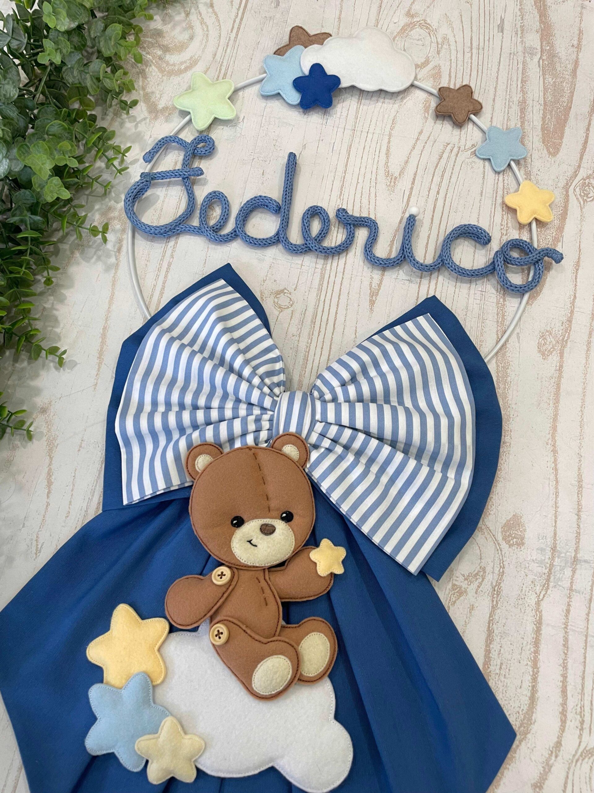 Un cerchio in metallo bianco decorato con nuvolette e stelline in pannolenci, fanno da cornice a questo fiocco originale.