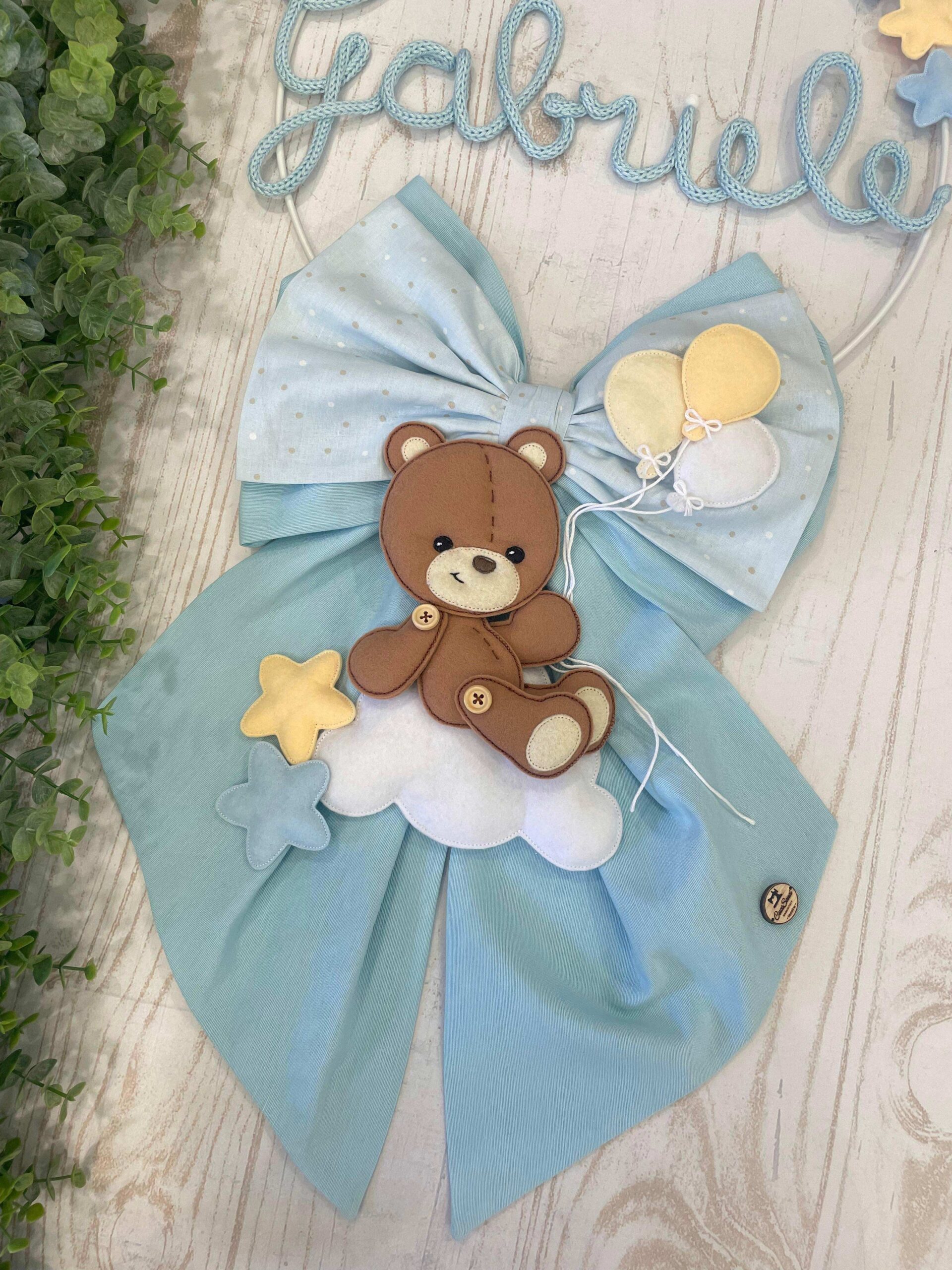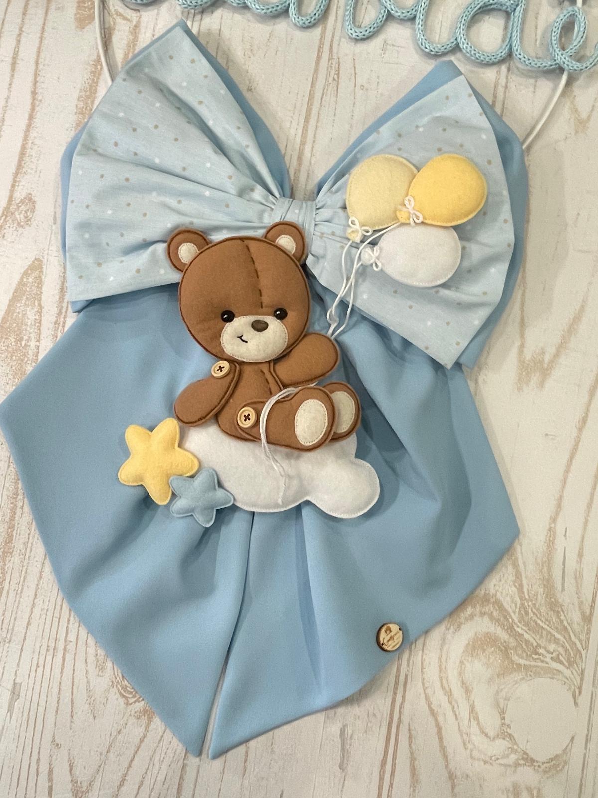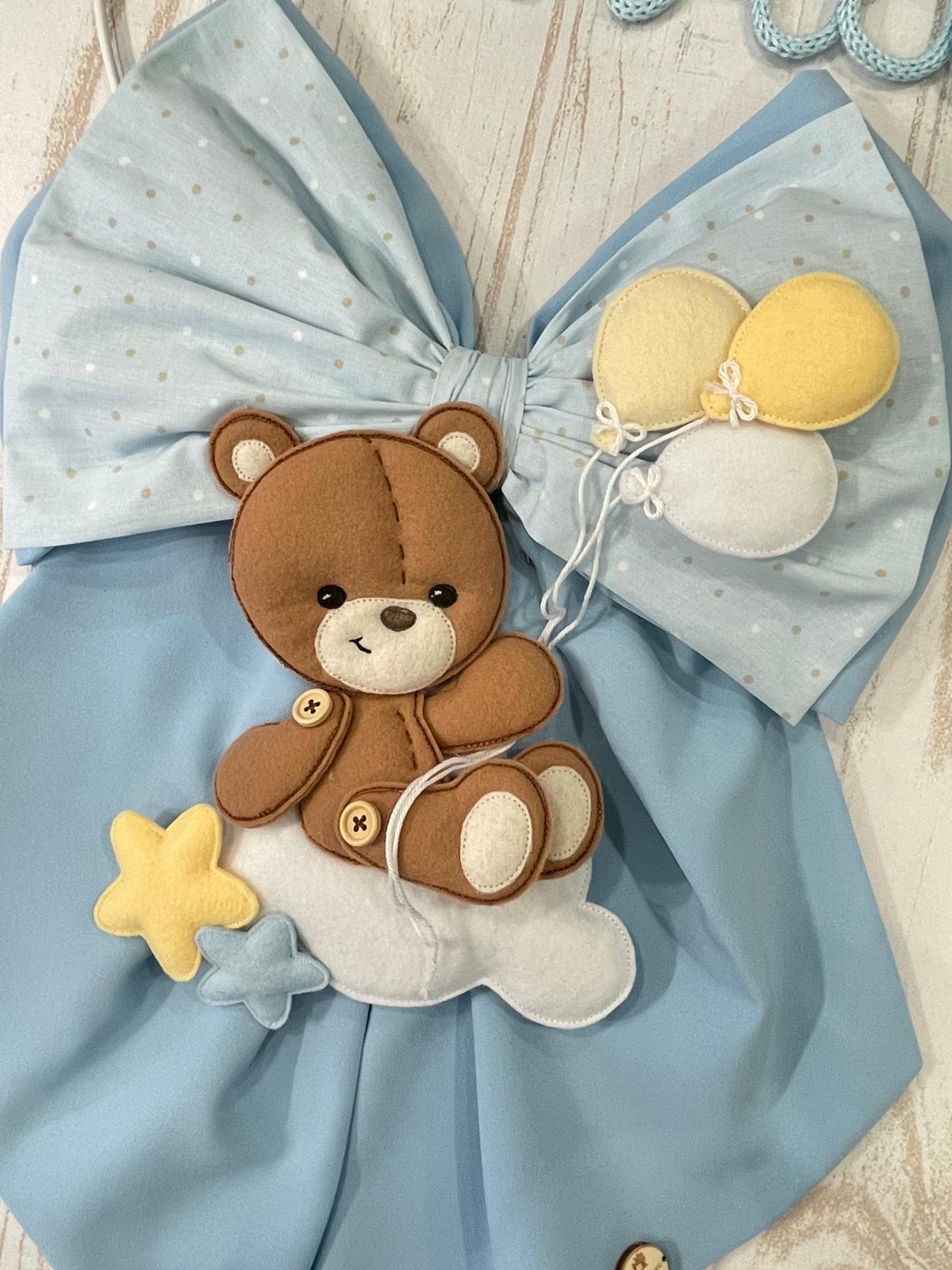 Dal fiocco pende un tenero orsetto in pannolenci tridimensionale seduto su una nuvoletta bianca.