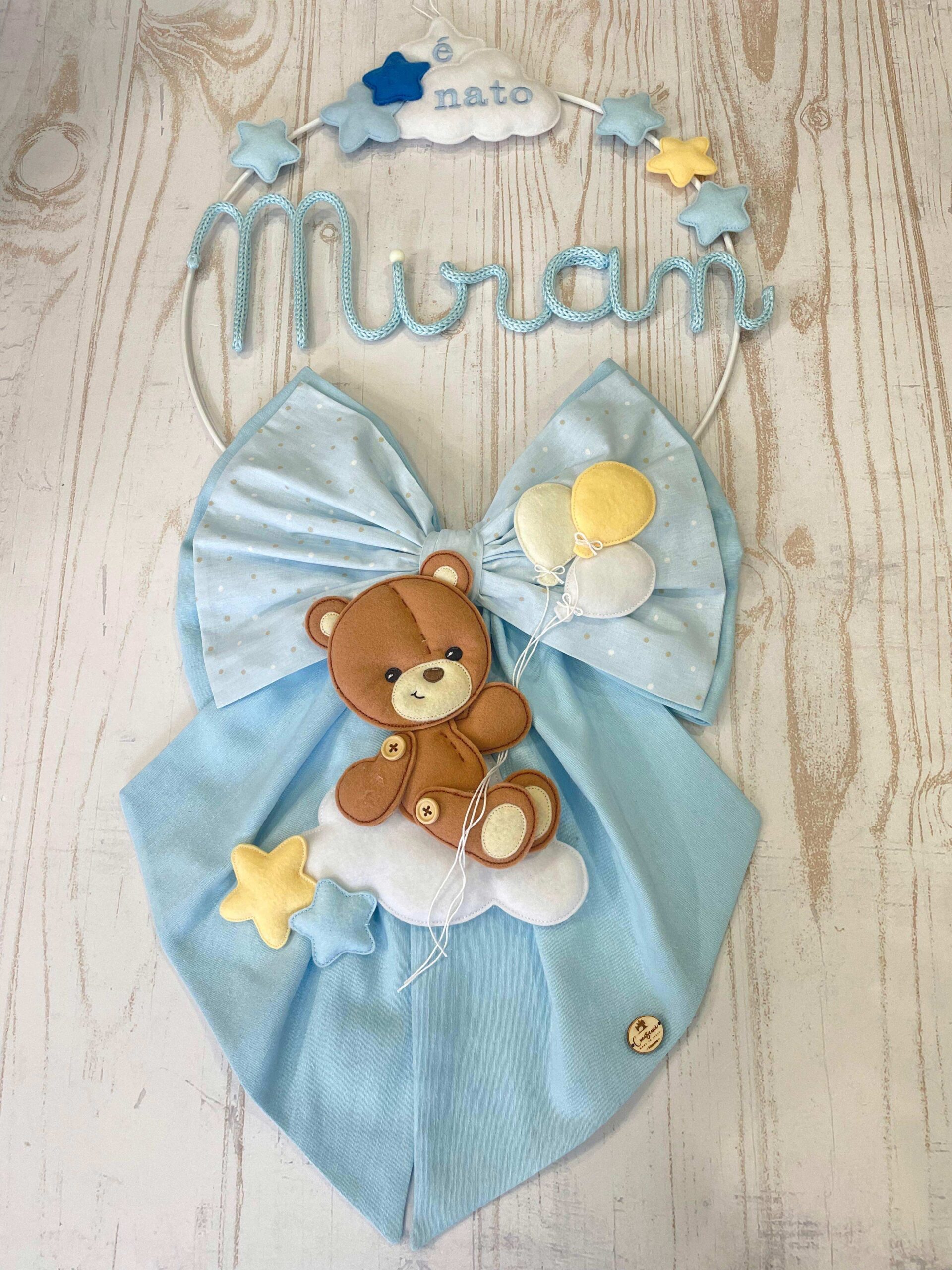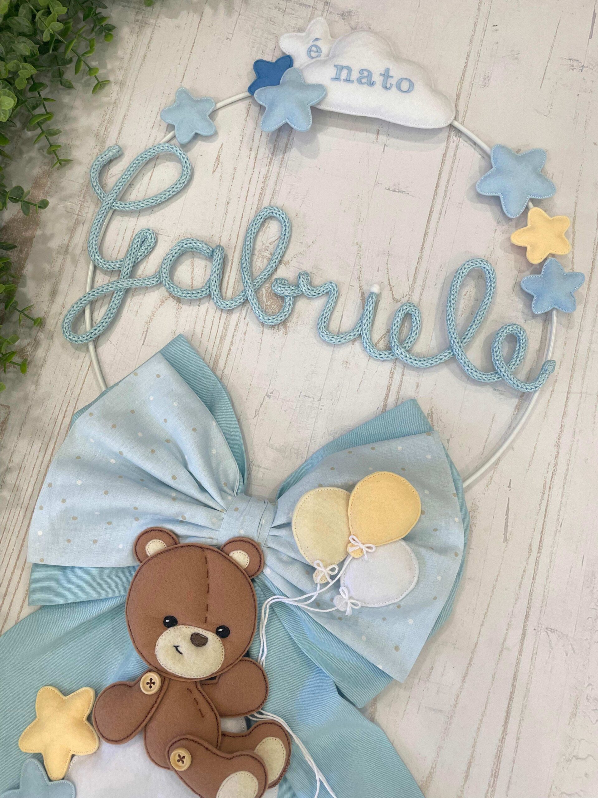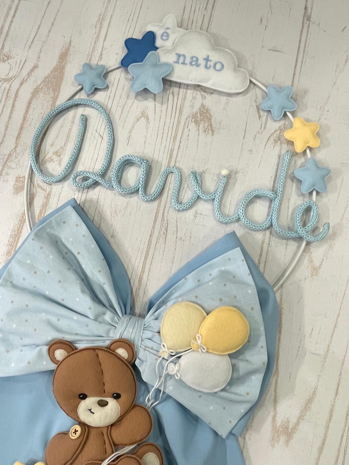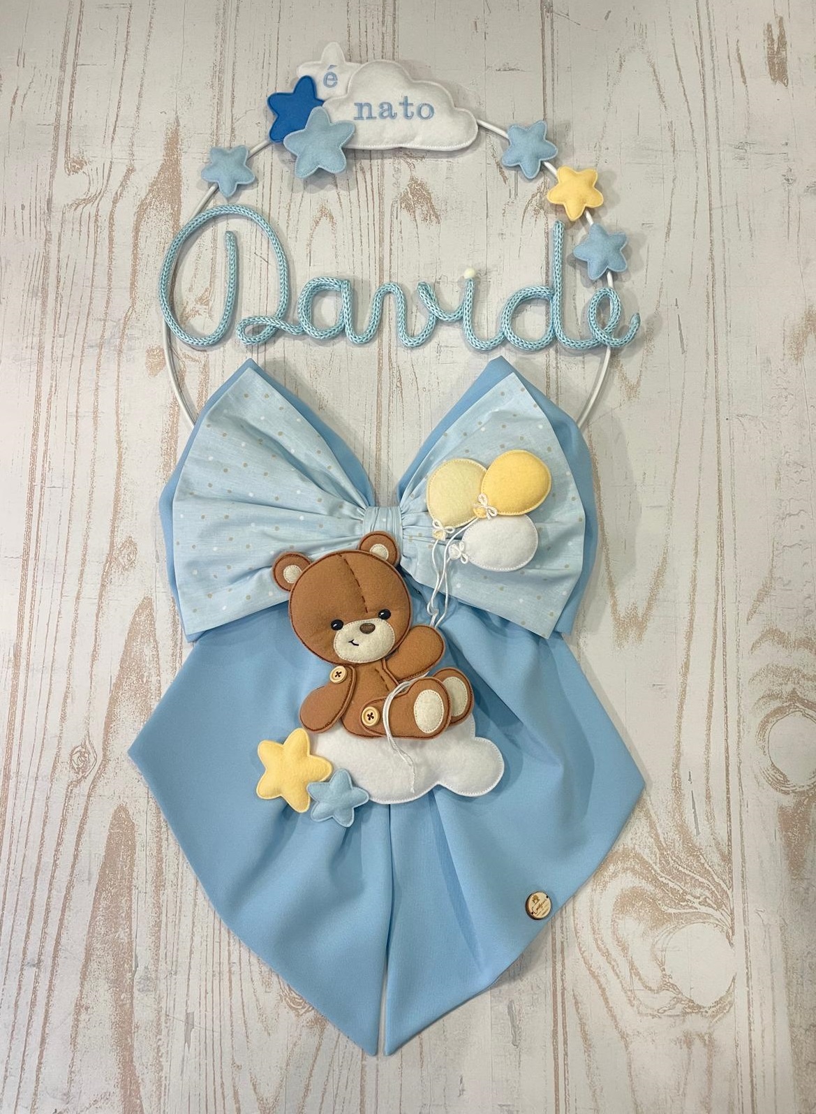 Dal fiocco pende un tenero orsetto in pannolenci tridimensionale seduto su una nuvoletta bianca.