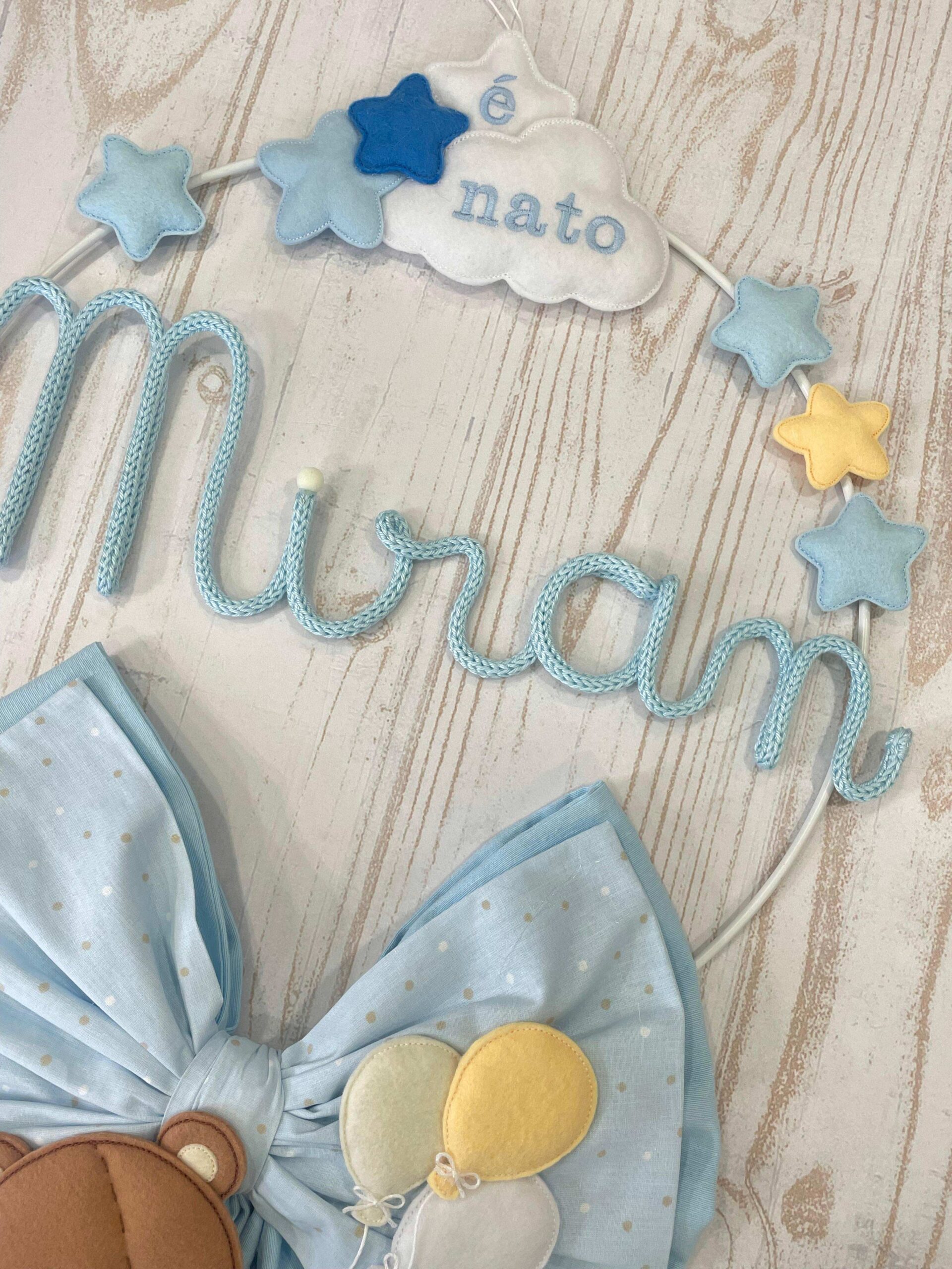 Un cerchio in metallo bianco decorato con nuvolette e stelline in pannolenci, fa da cornice a questo fiocco originale.