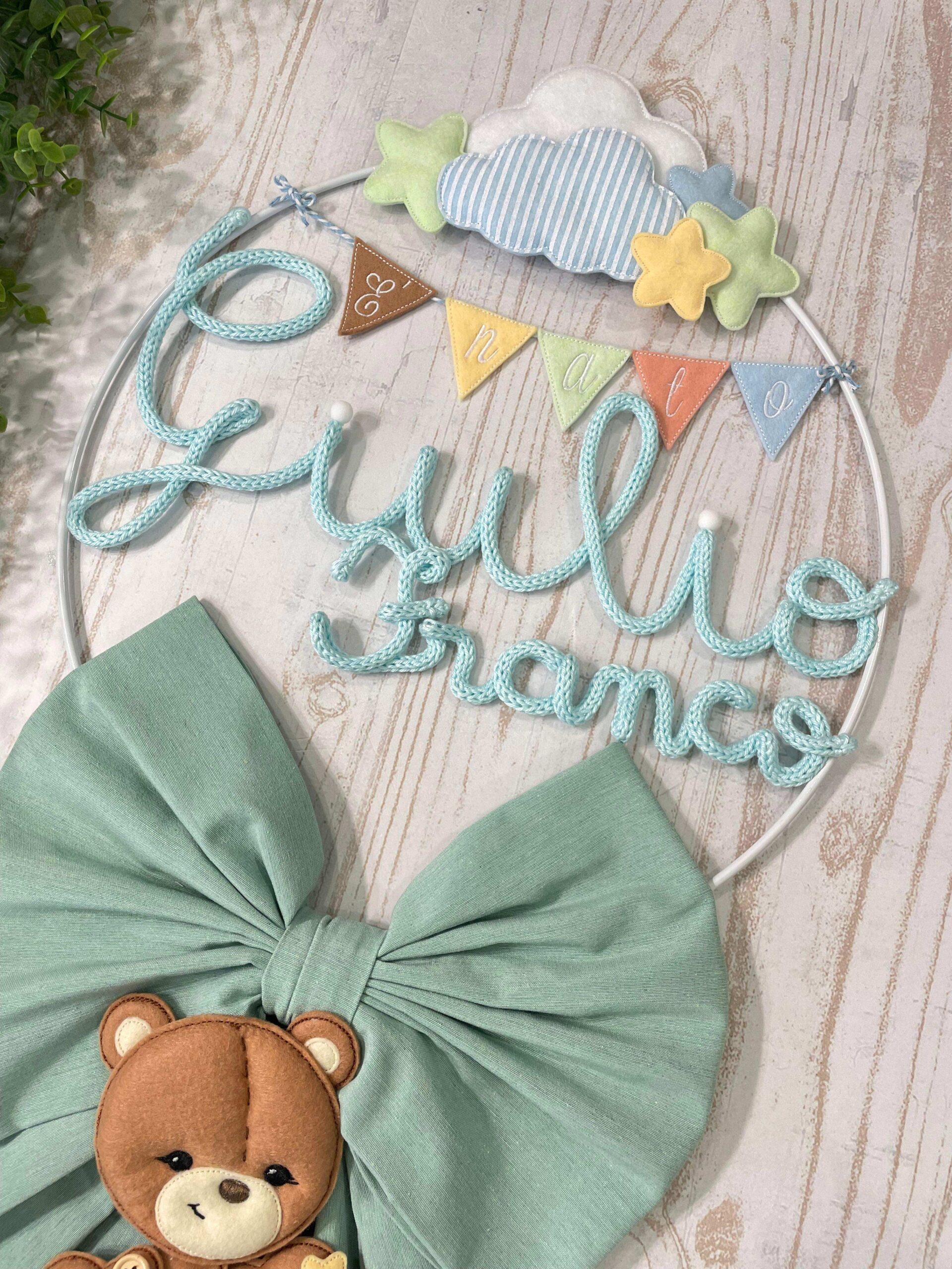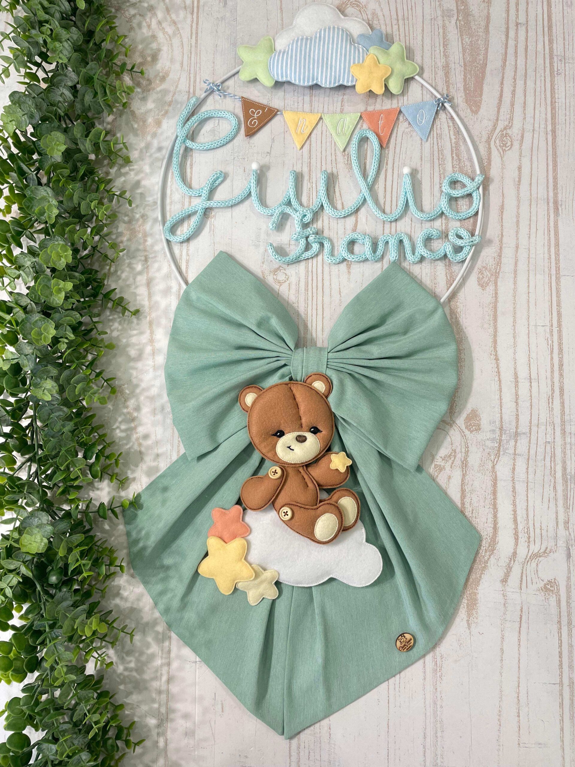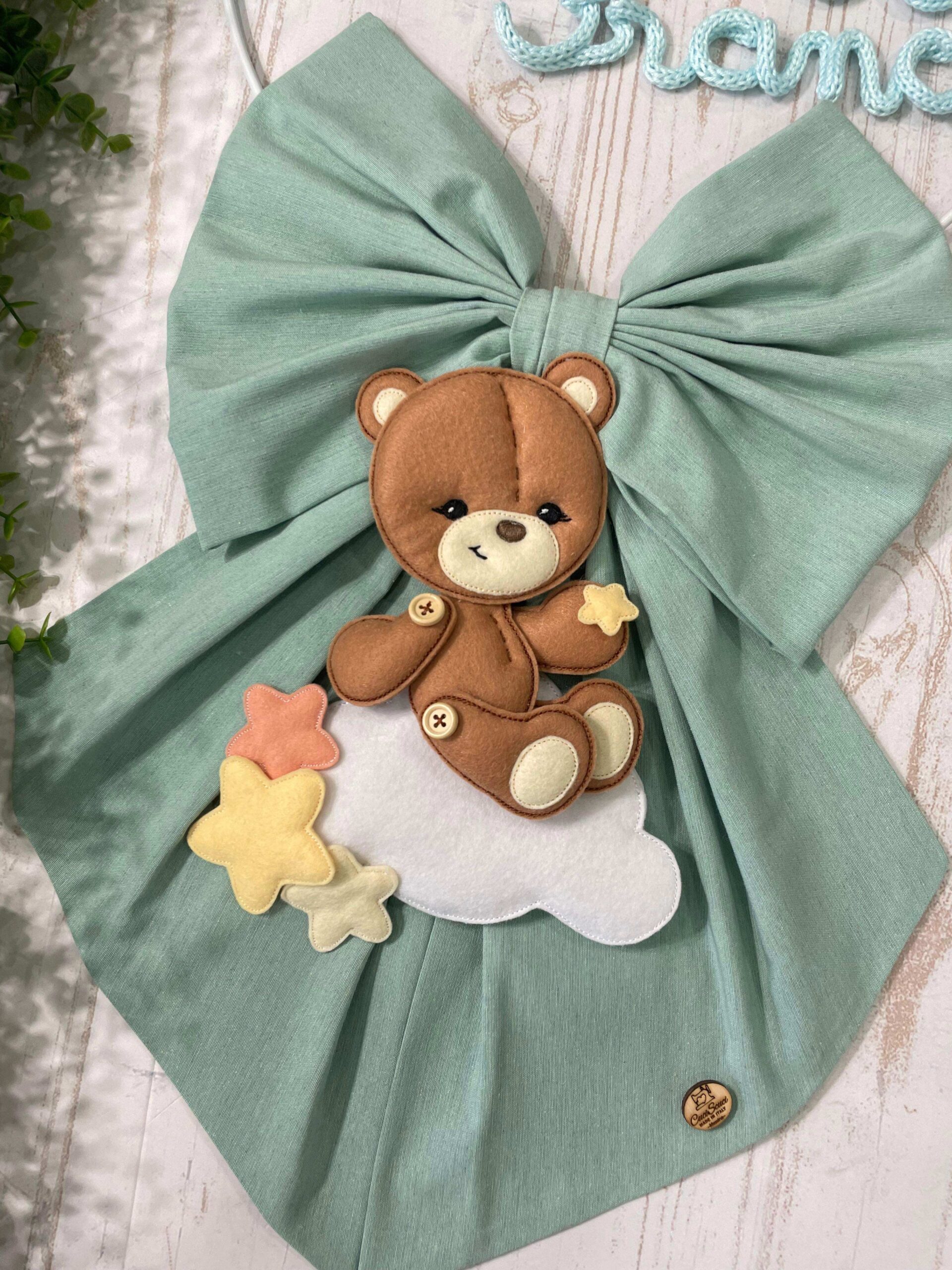 Dal fiocco pende un tenero orsetto in pannolenci tridimensionale seduto su una nuvoletta bianca.