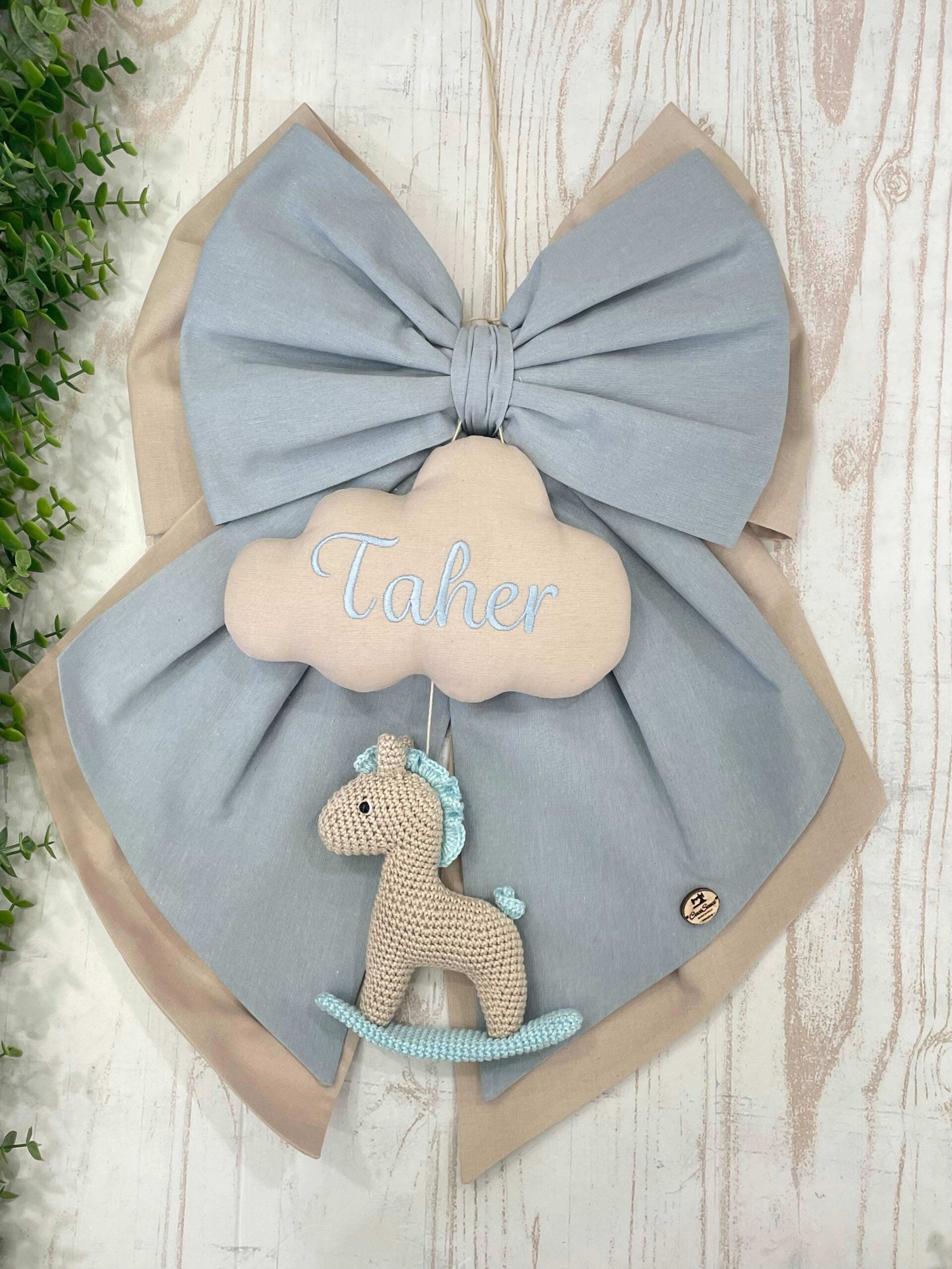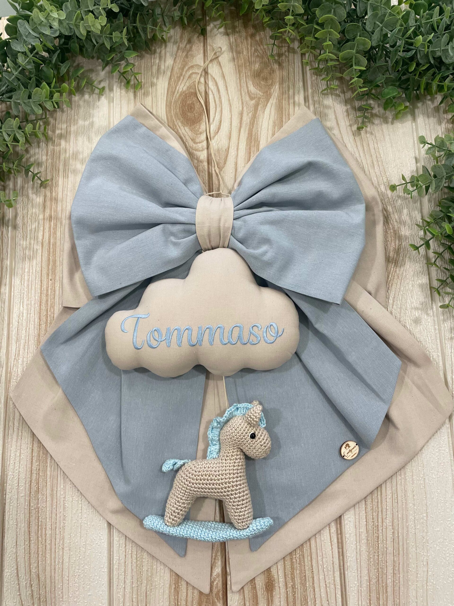 Sul fiocco è applicata una nuvola in tela di cotone con ricamato il nome del bimbo (personalizzabile), da cui pende un cavallino a dondolo realizzato con la tecnica amigurumi.