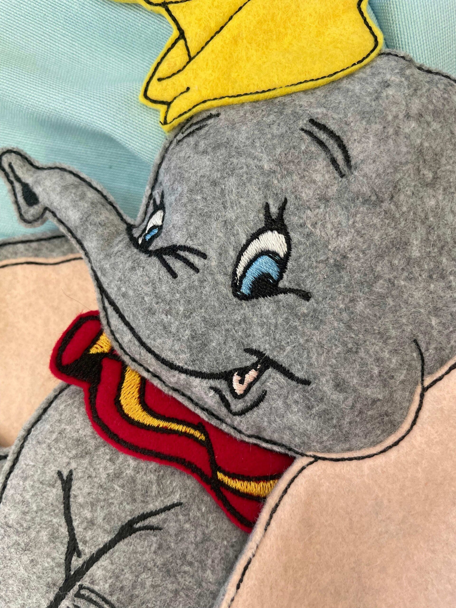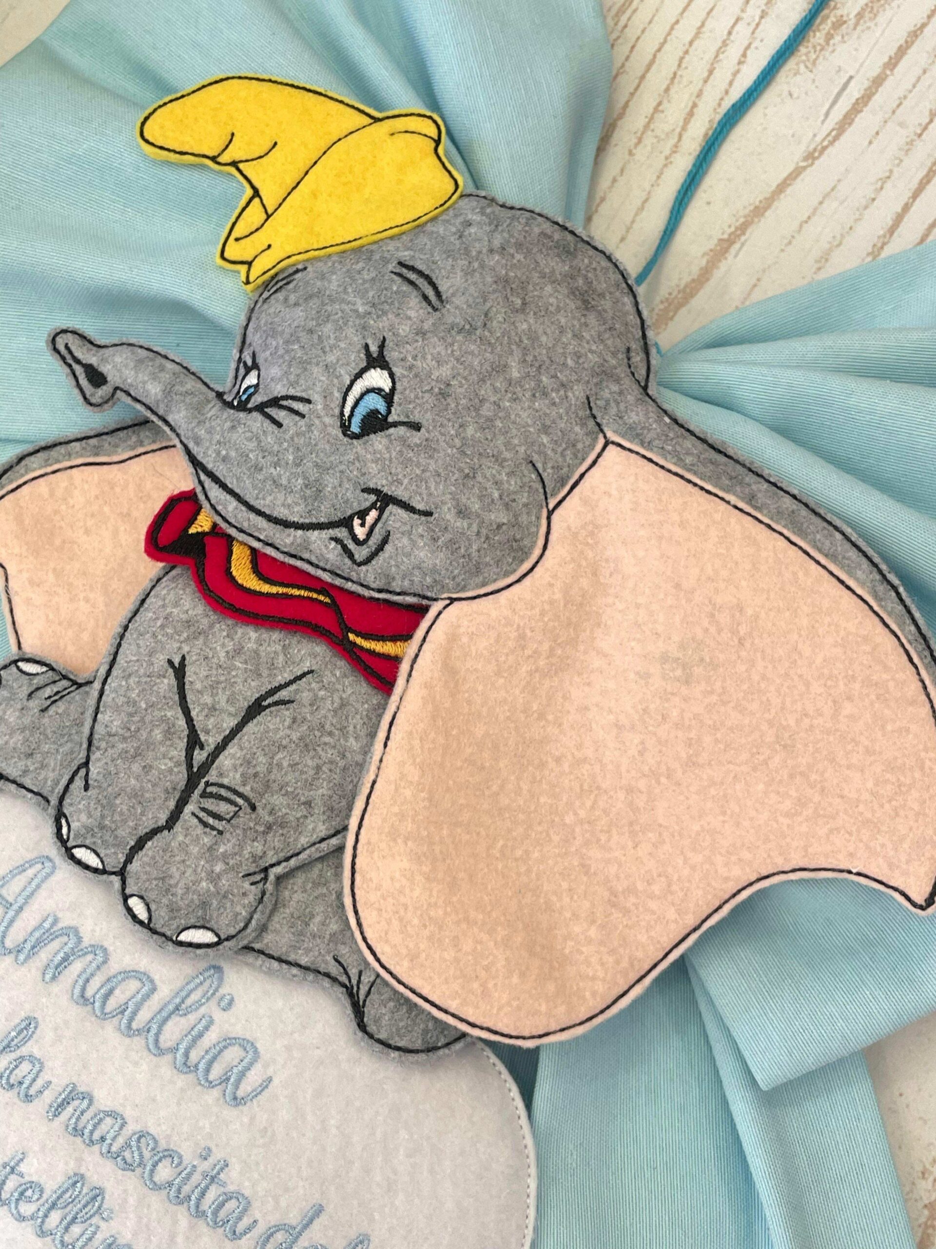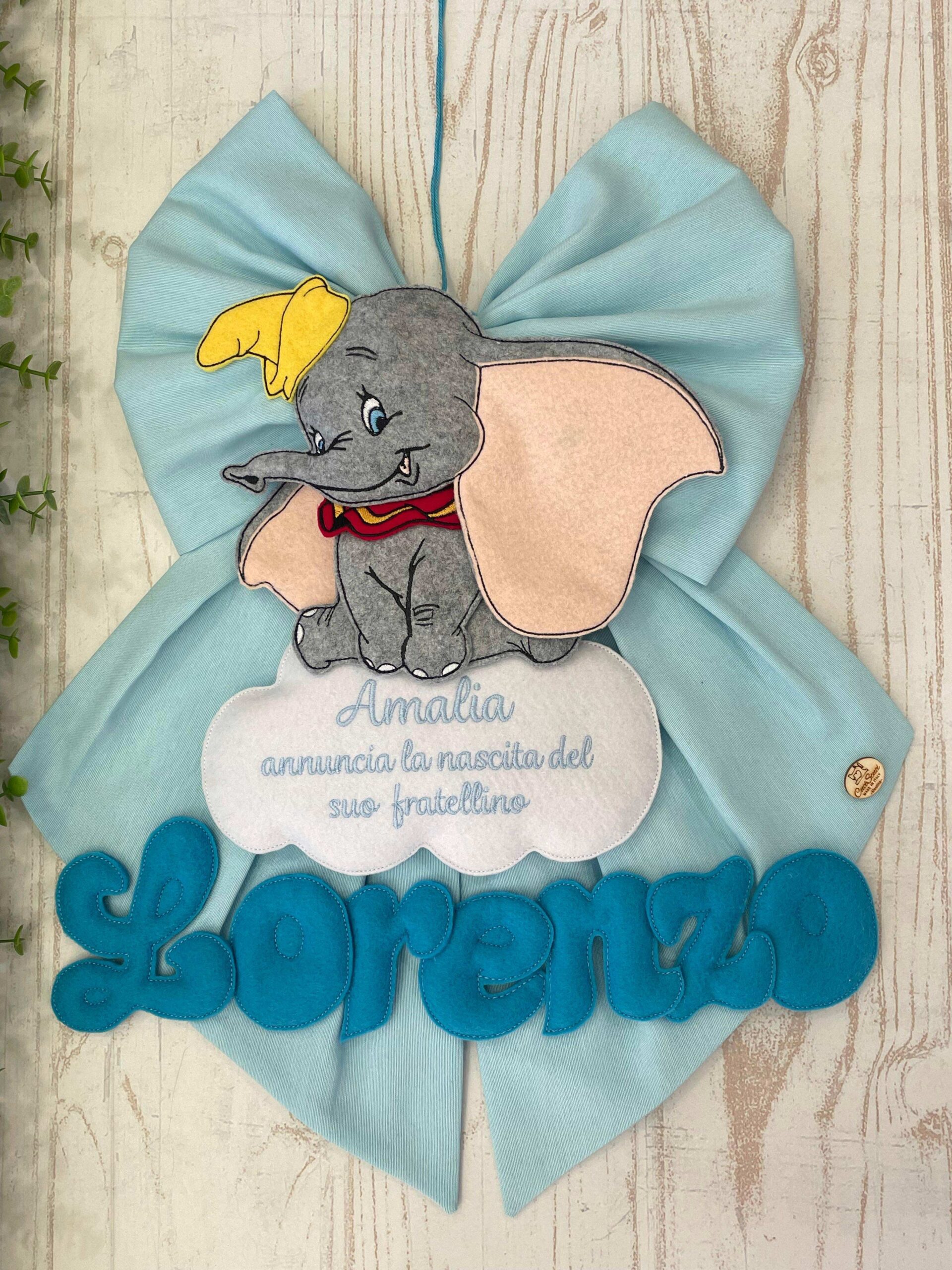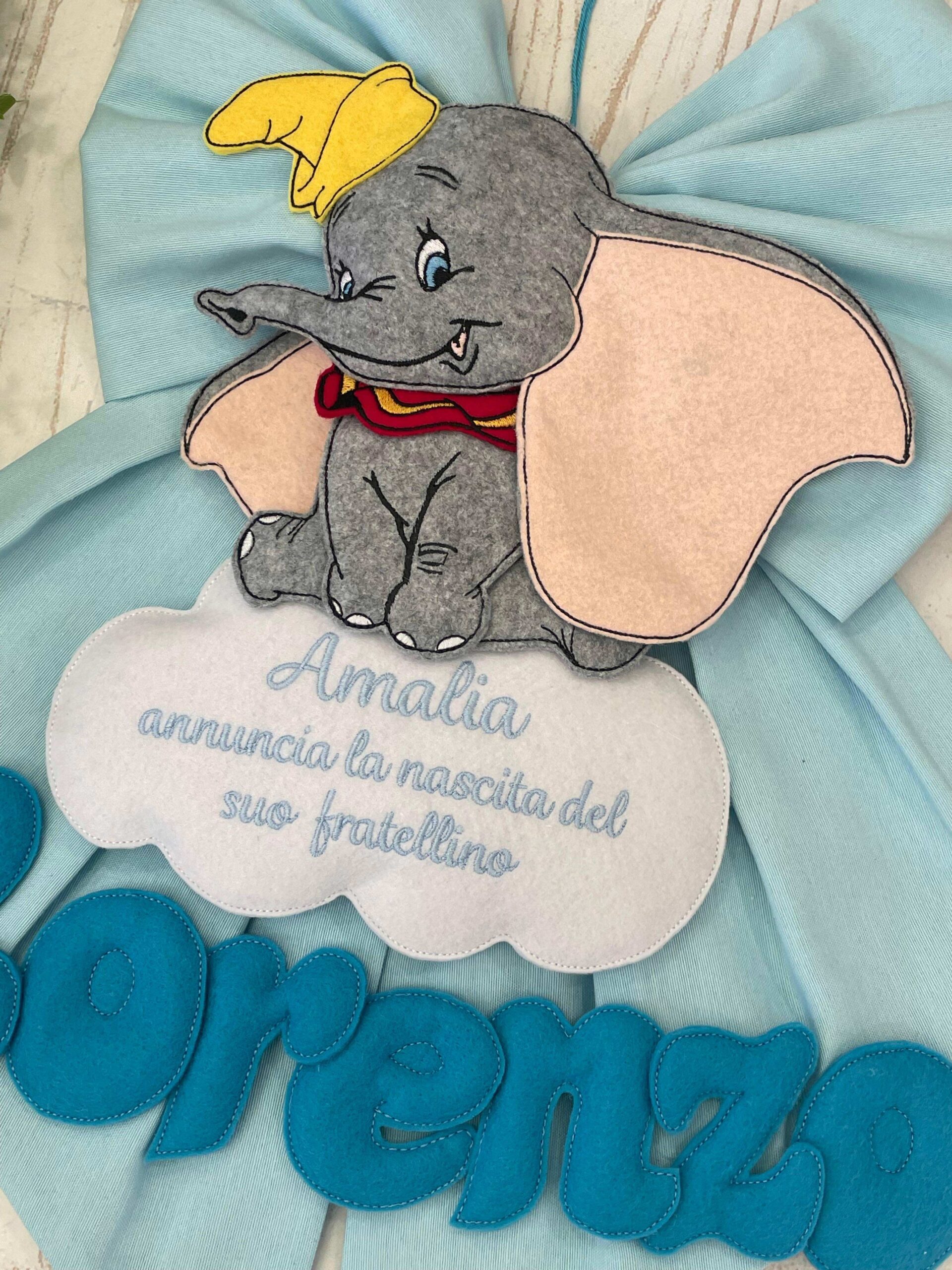 Al fiocco è applicato il dolcissimo Dumbo, realizzato in pannolenci, su una nuvoletta bianca, dove delle lettere formano la frase “è nato”o dove è possibile ricamare una frase.