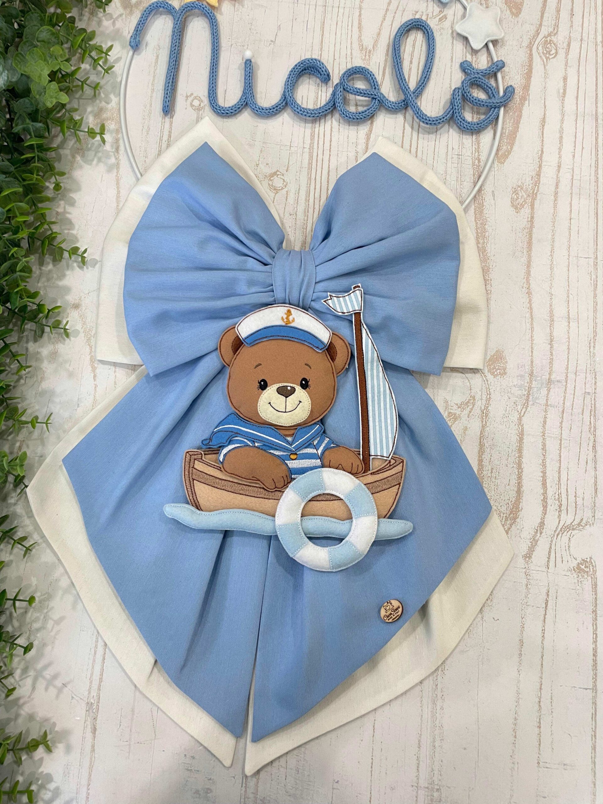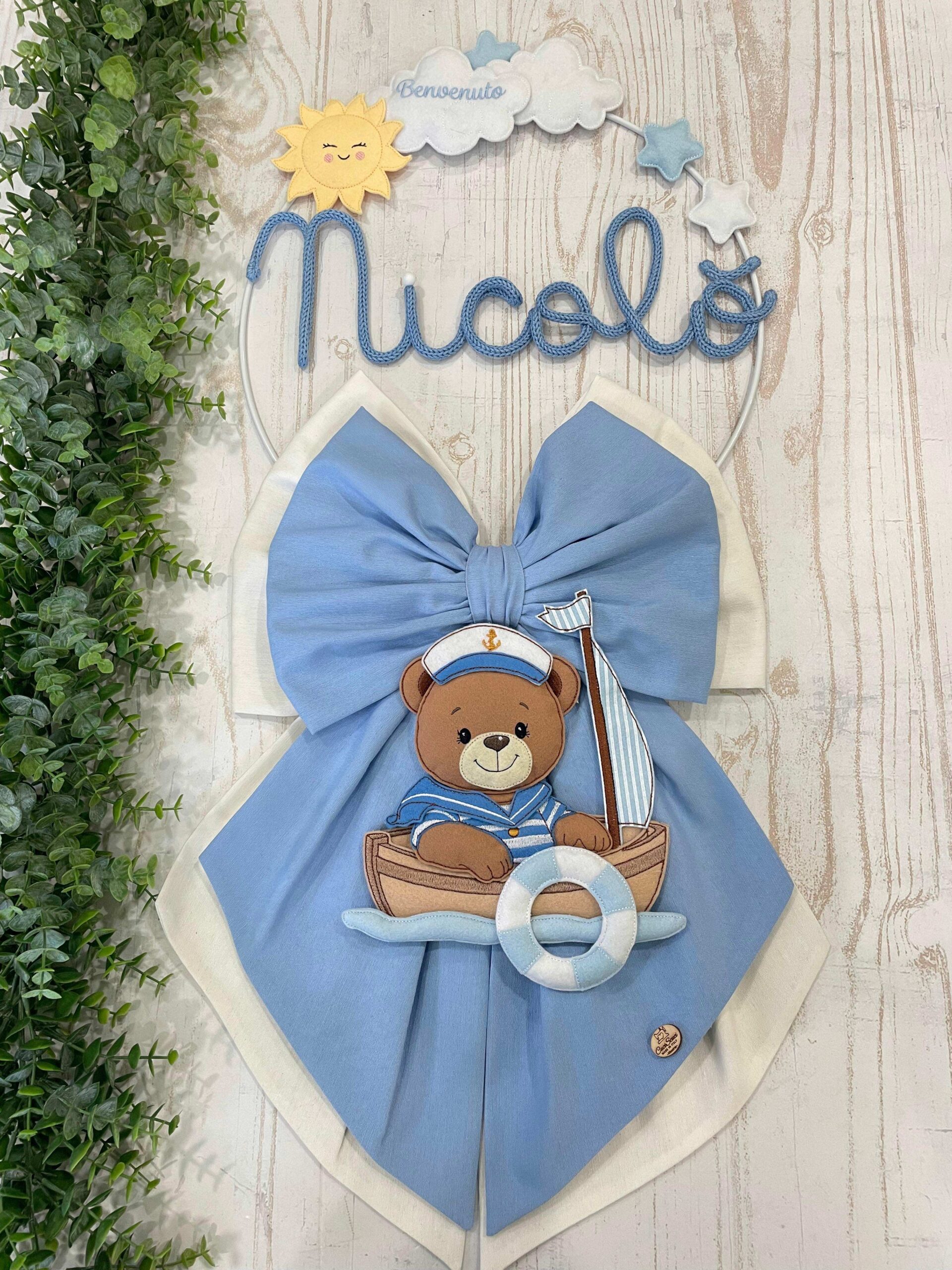 Fiocco Nascita Doppio Fiocco Azzurro e Panna con Nome in Tricotin e Orsetto Marinaio