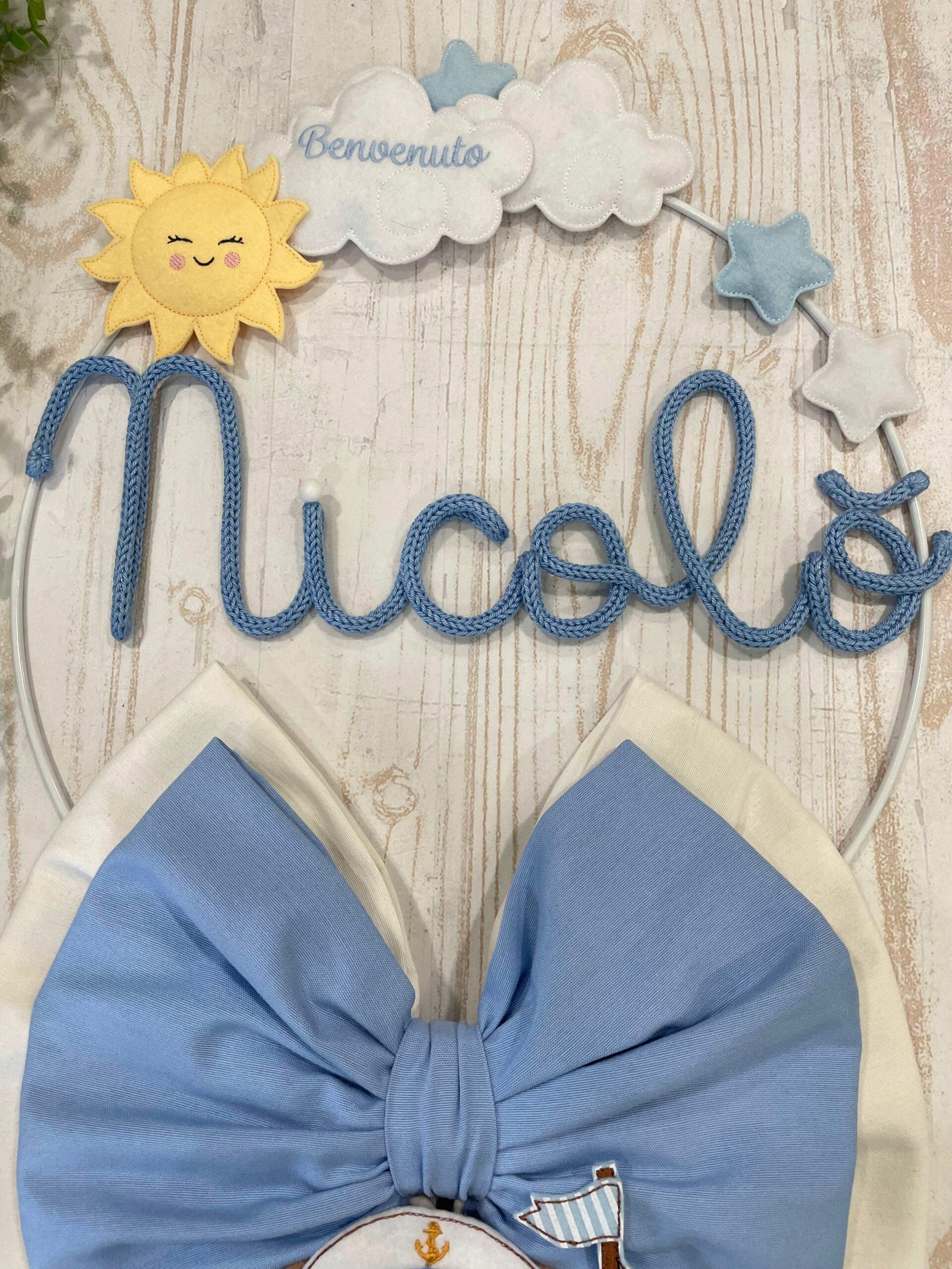 Recensisci per primo “Fiocco Nascita Doppio Fiocco Azzurro e Panna con Nome in Tricotin e Orsetto Marinaio”