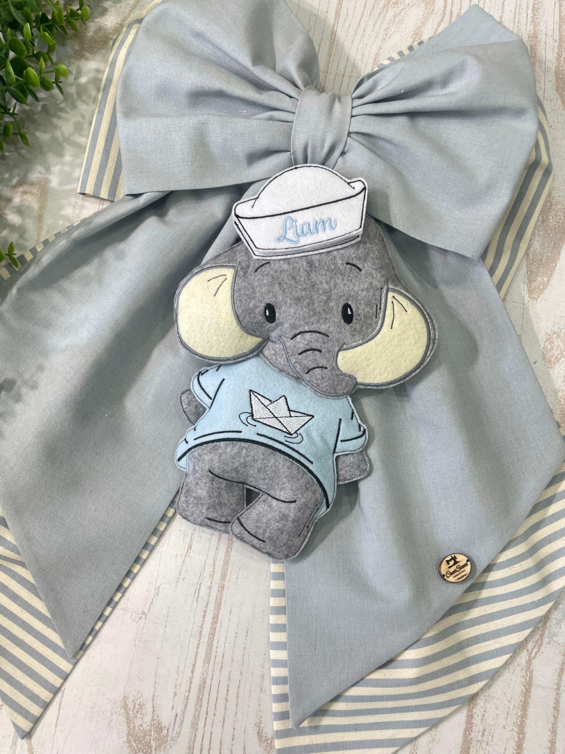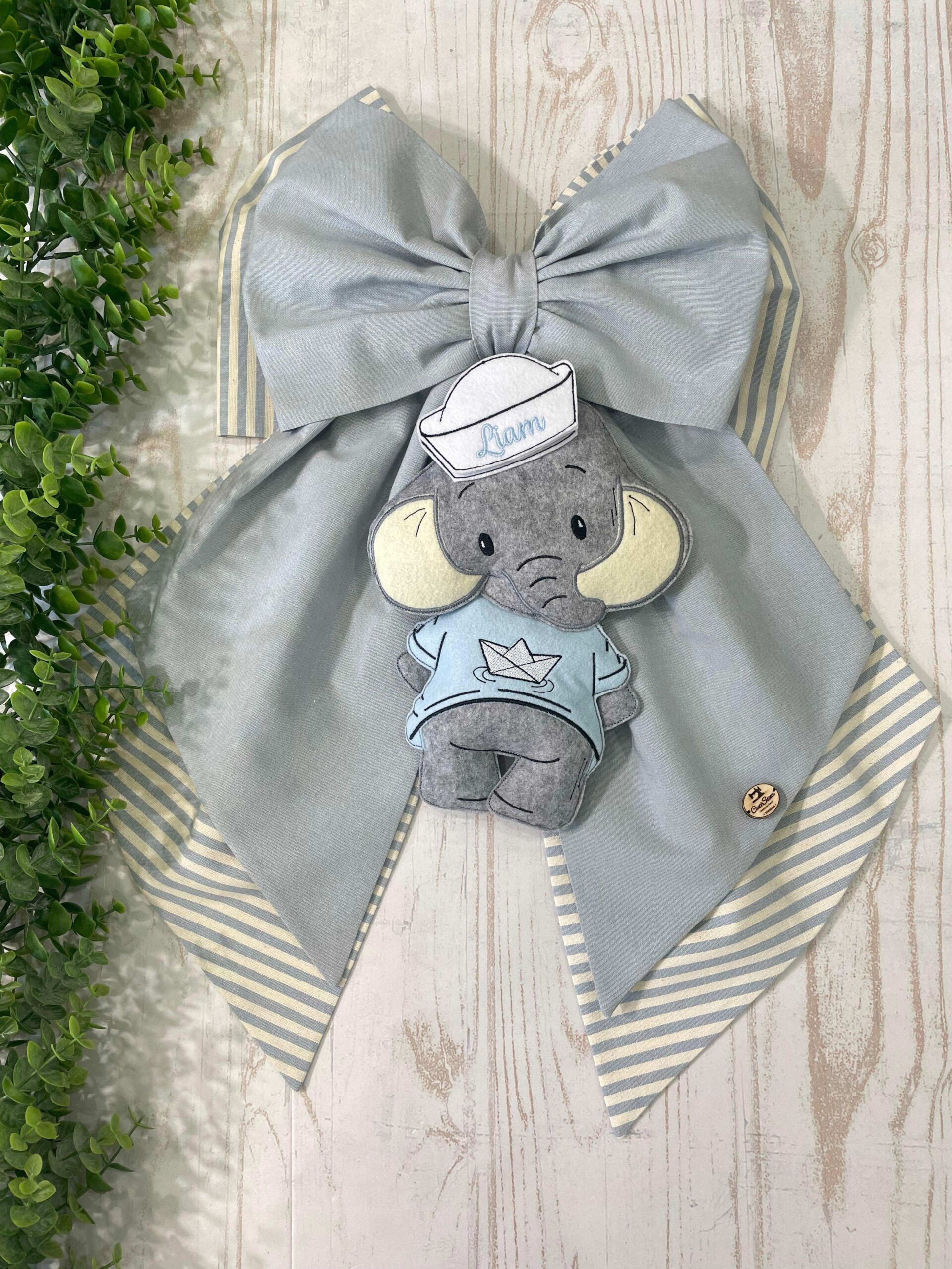 Dal fiocco pende un tenero elefante realizzato in pannolenci tridimensionale, che indossa una t-shirt azzurra e un cappello da marinaio con ricamato il nome del bambino.