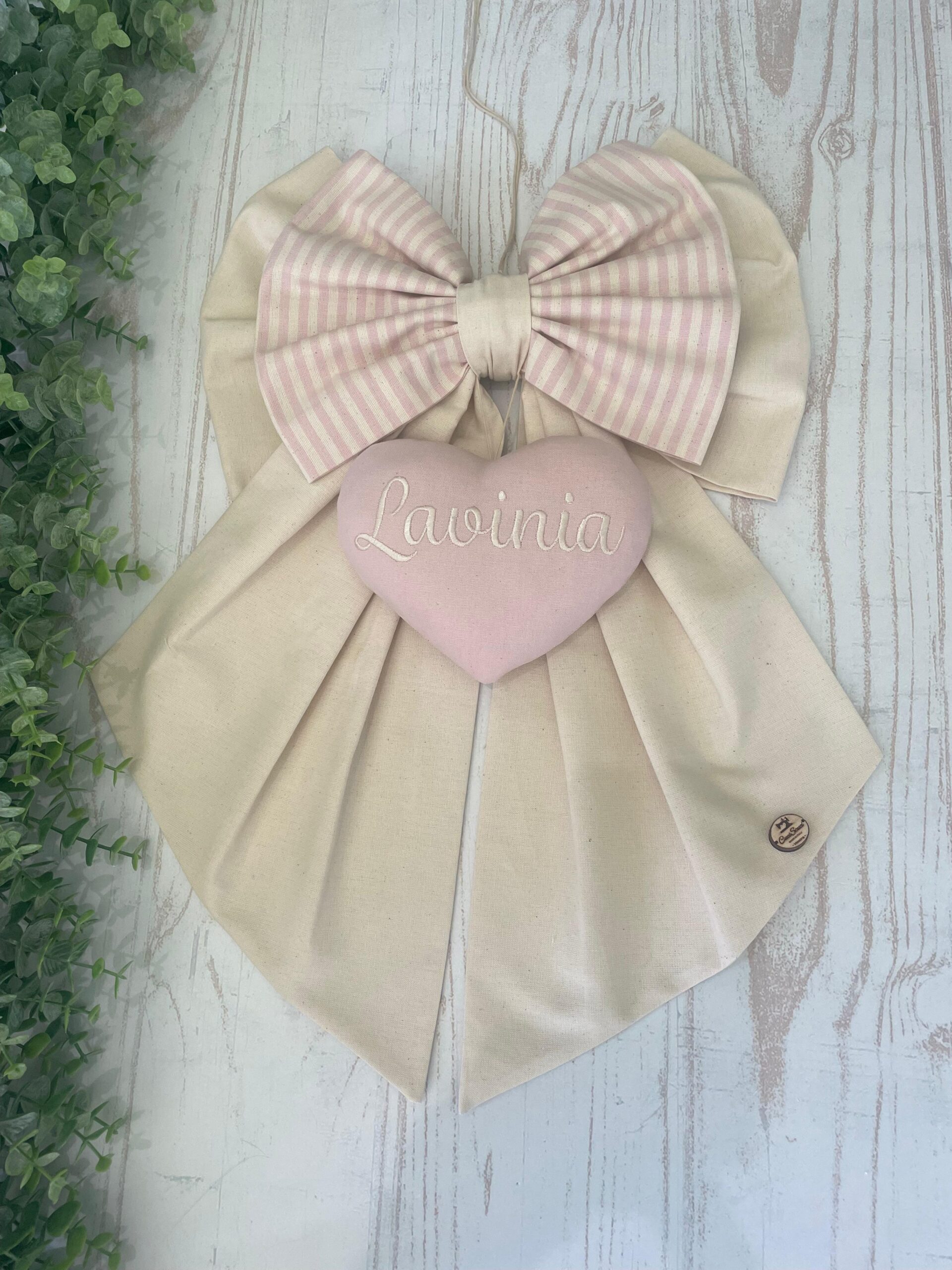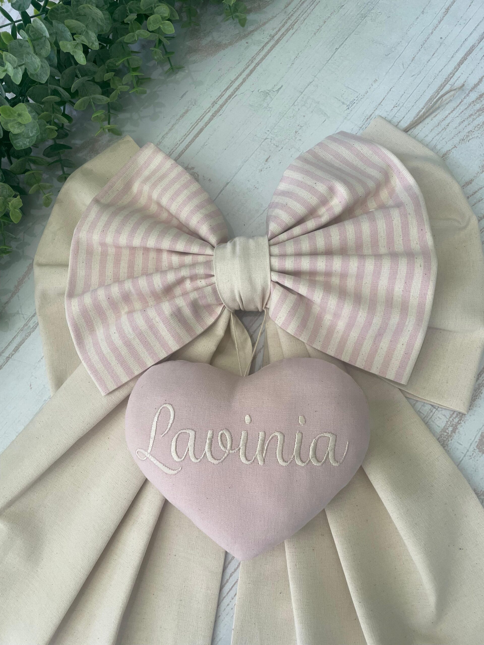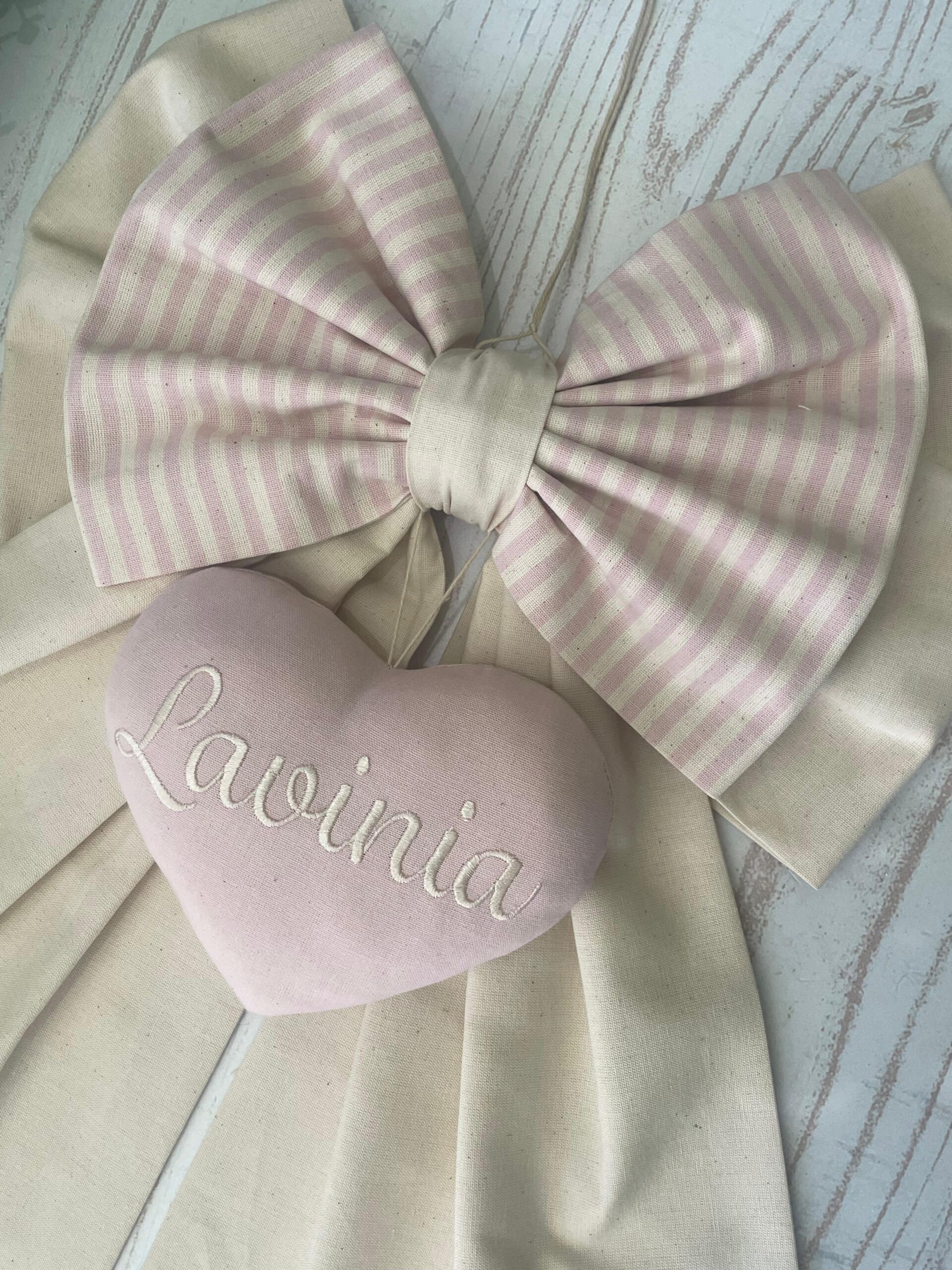 Dal fiocco pende un cuore con ricamato il nome della bambina.