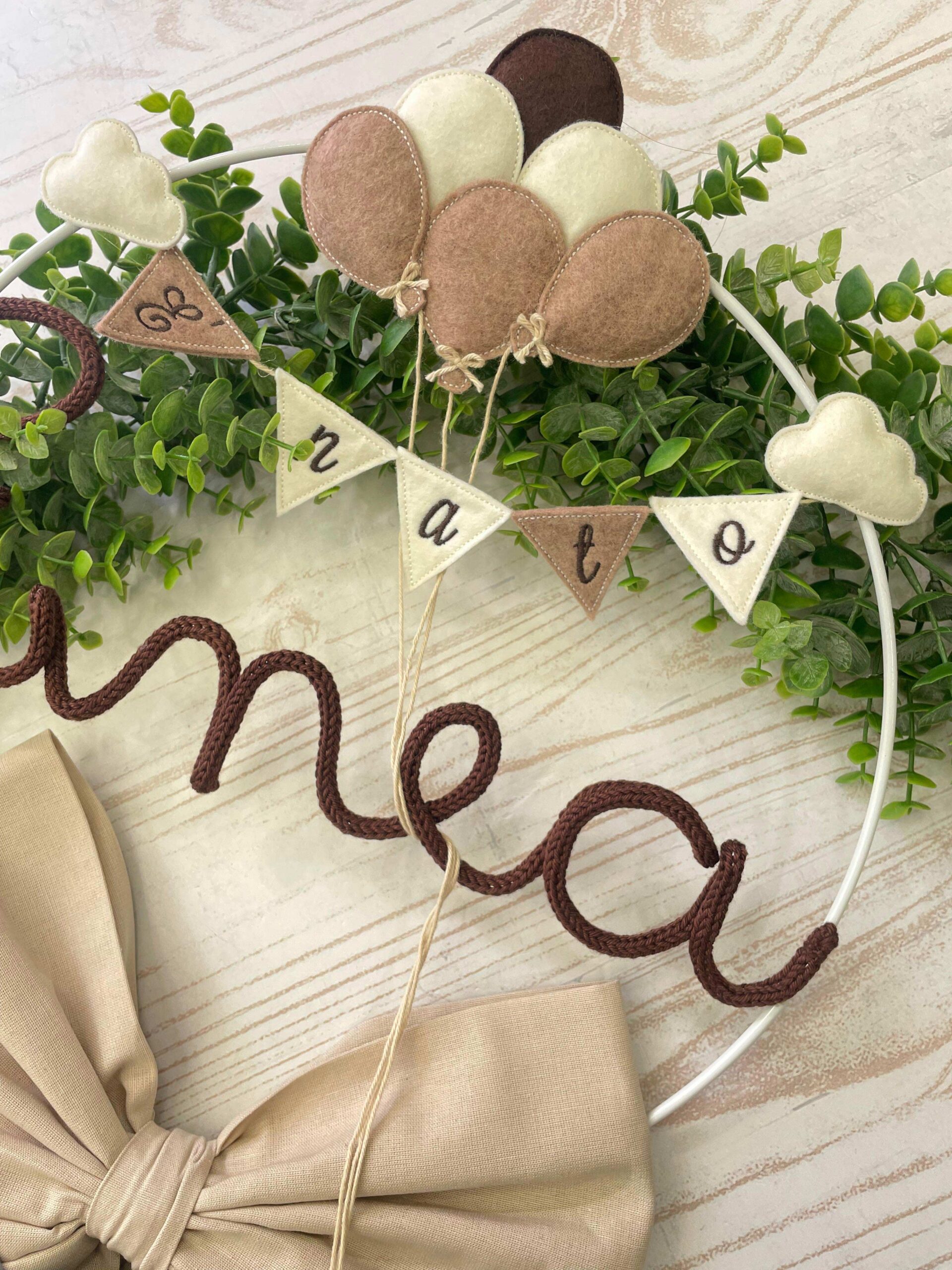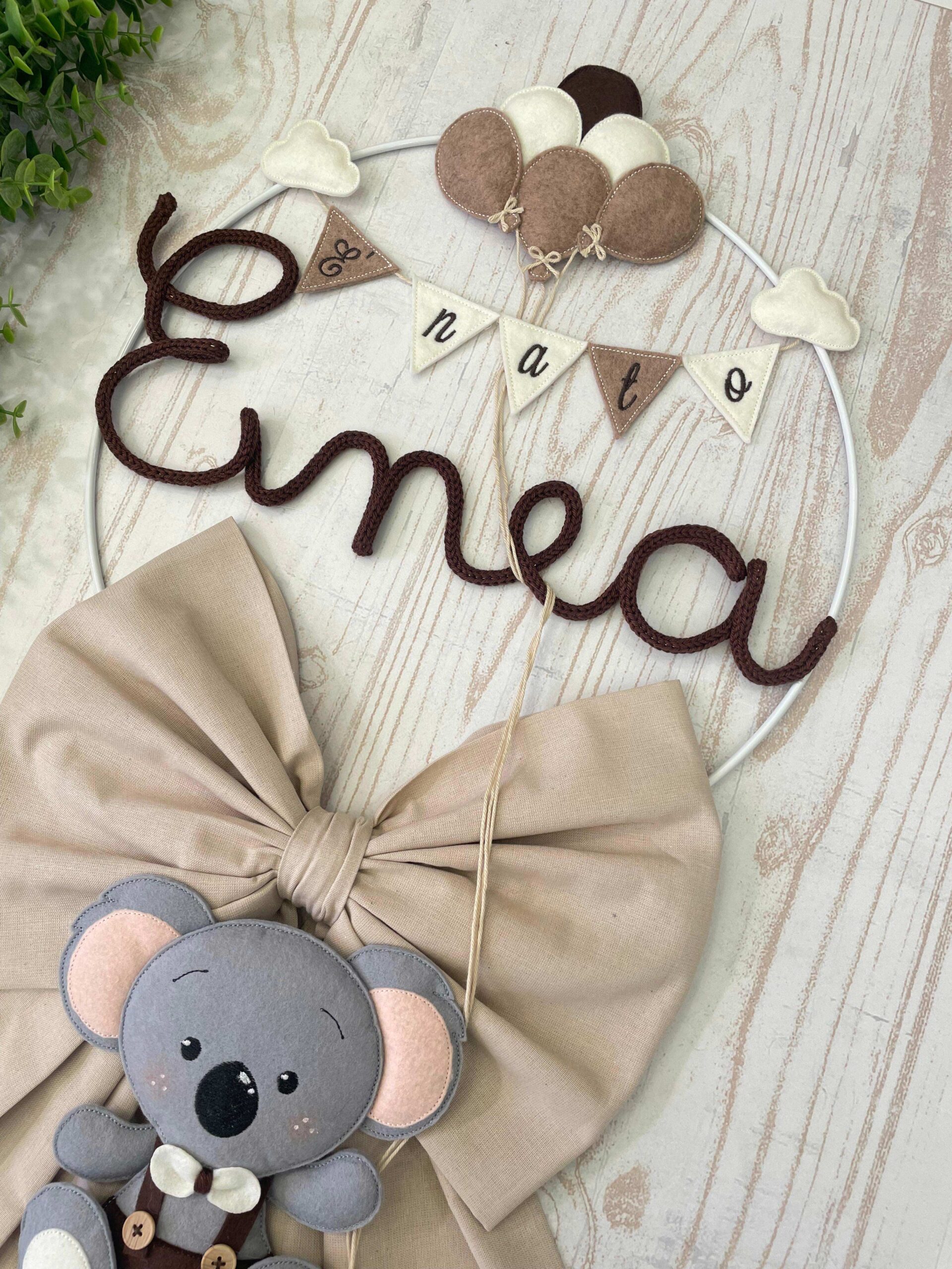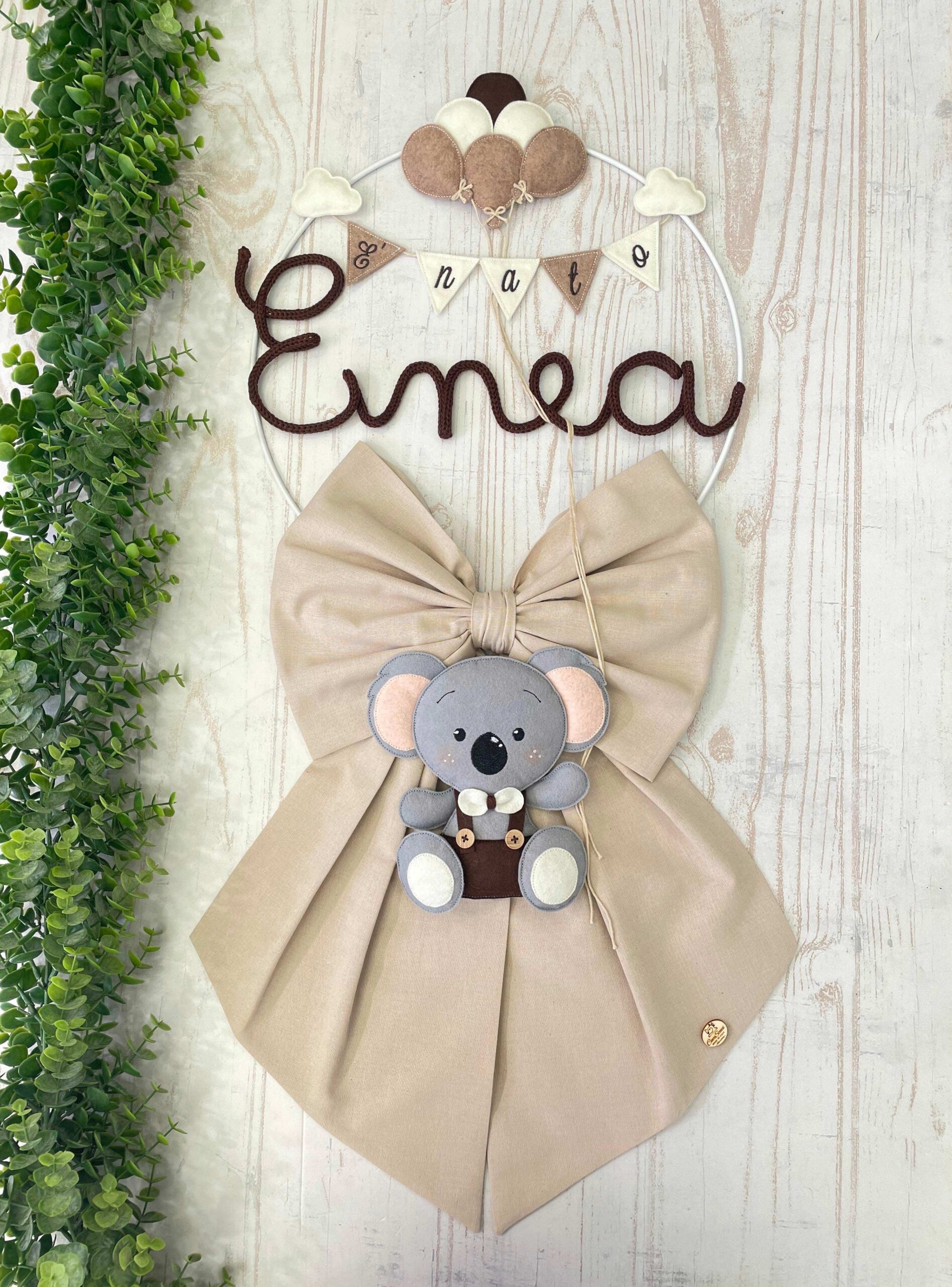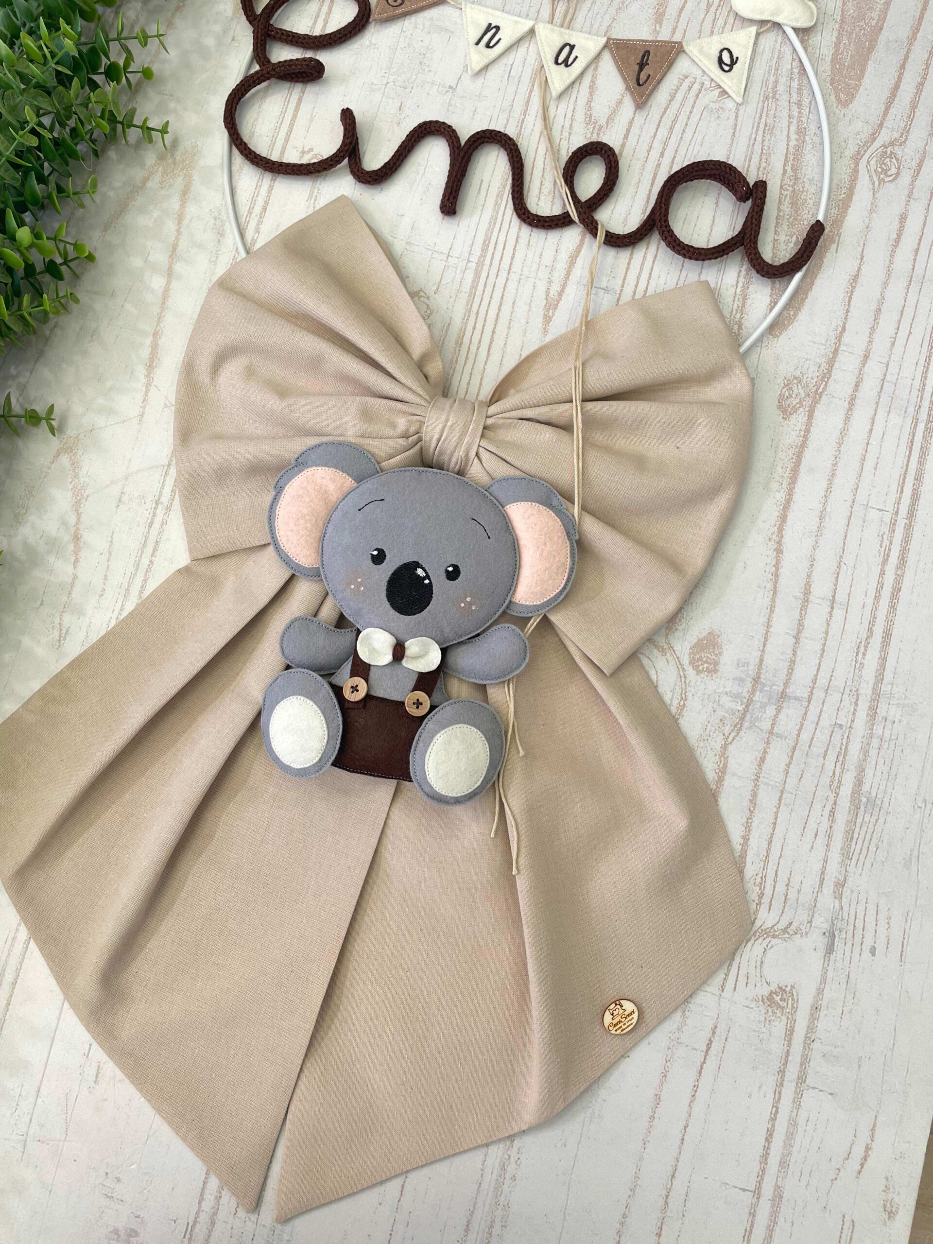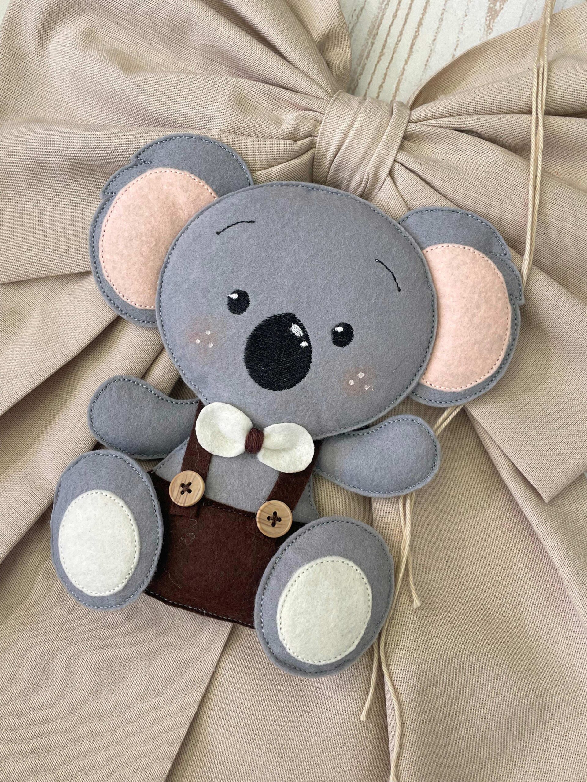 Dal fiocco pende un tenero koala in pannolenci tridimensionale che regge un filo che riconduce ai palloncini nella parte superiore.