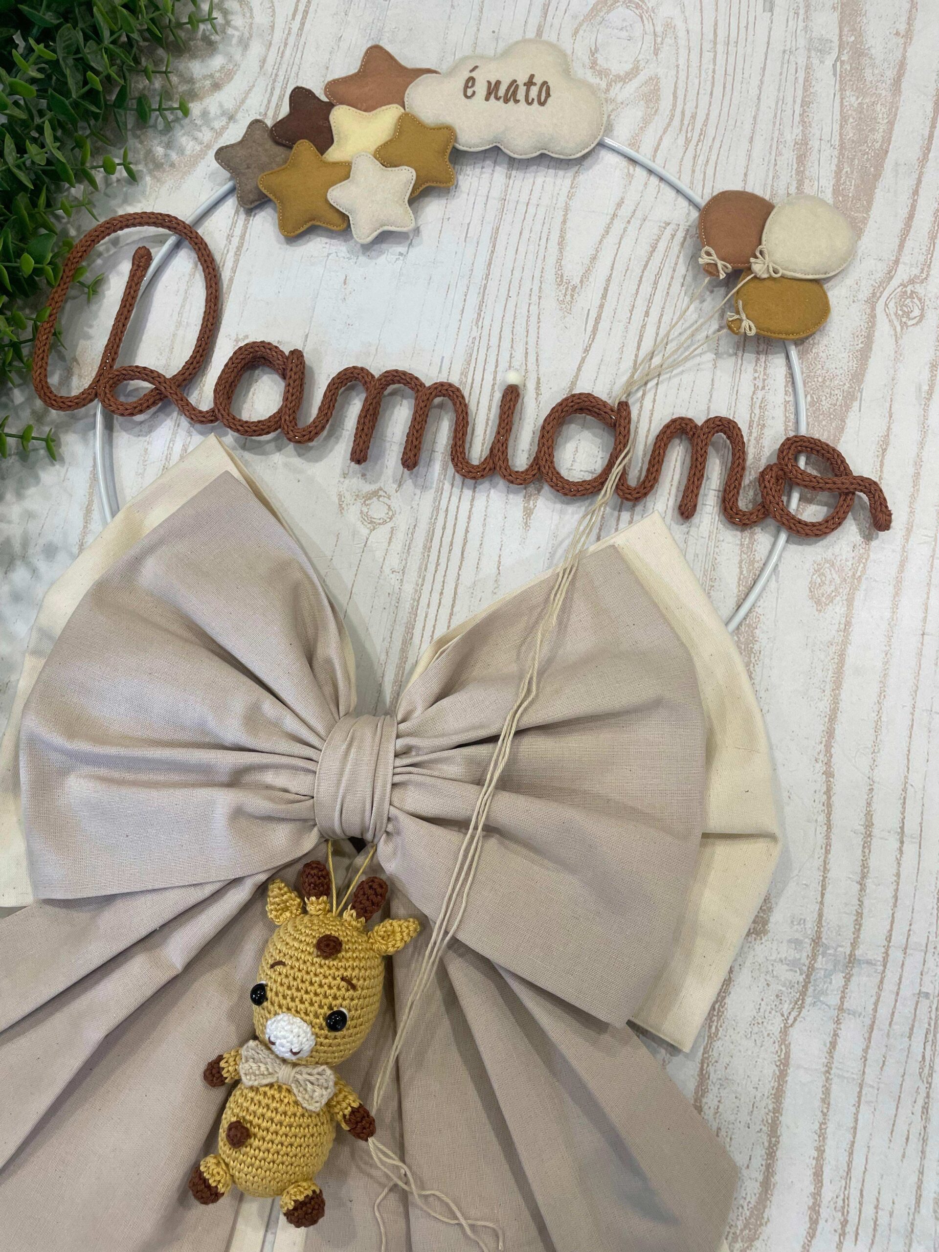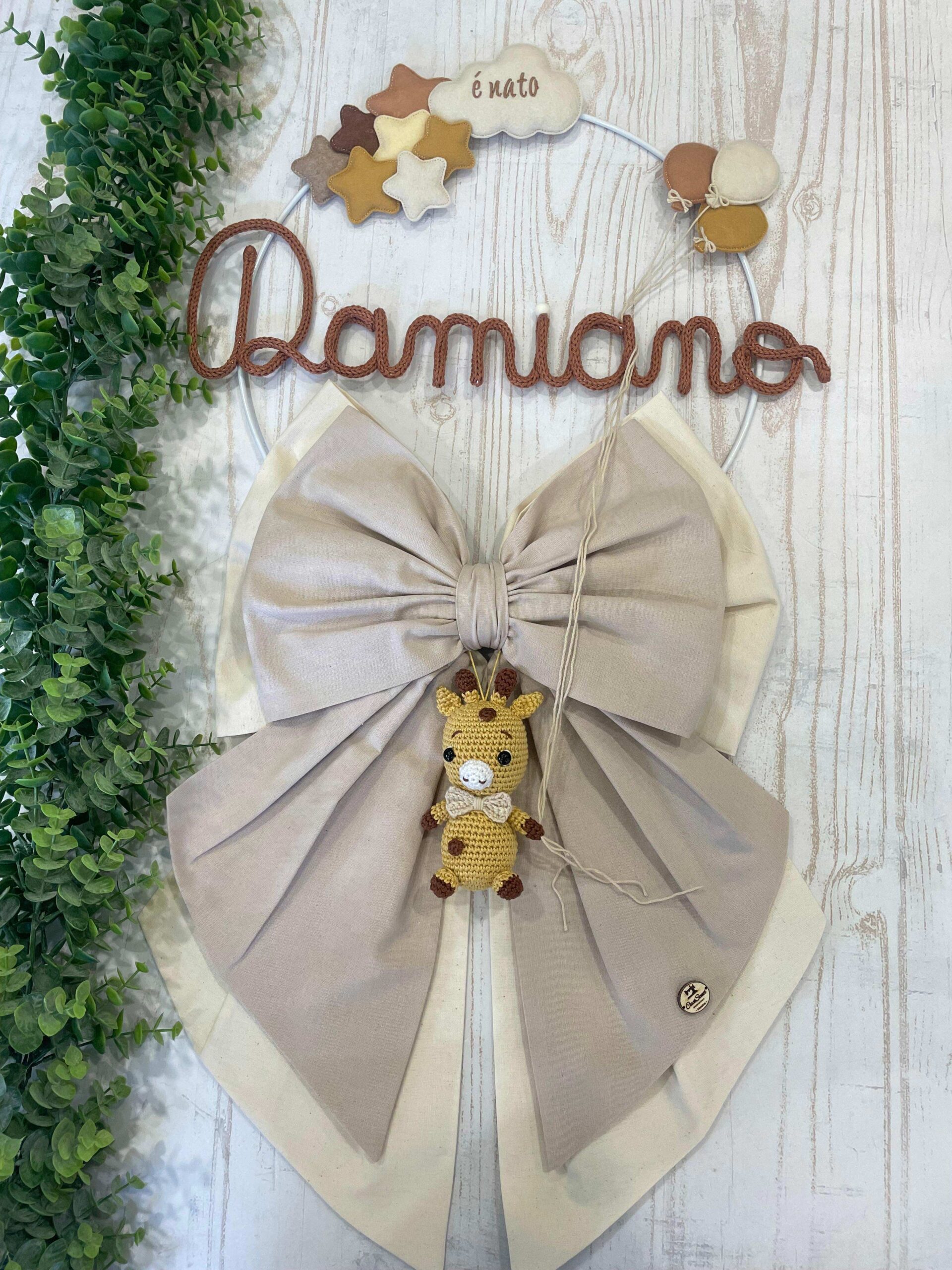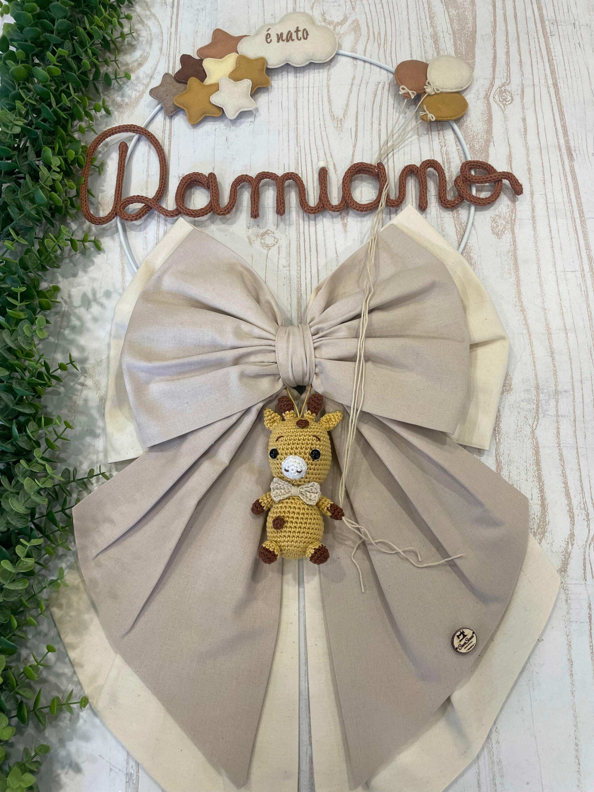 Fiocco Nascita Nocciola e Panna con Nome in Tricotin e Giraffa in Amigurumi
